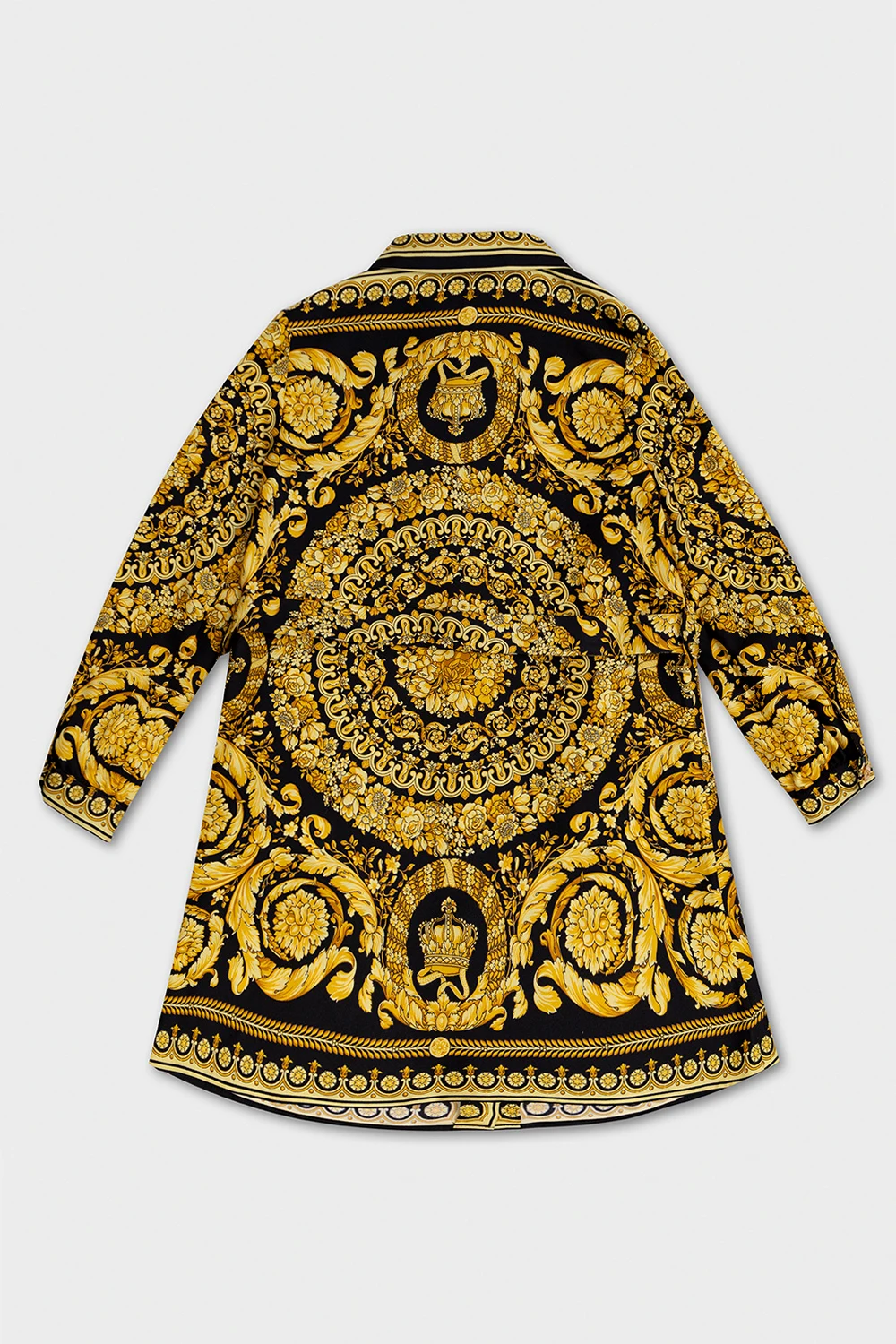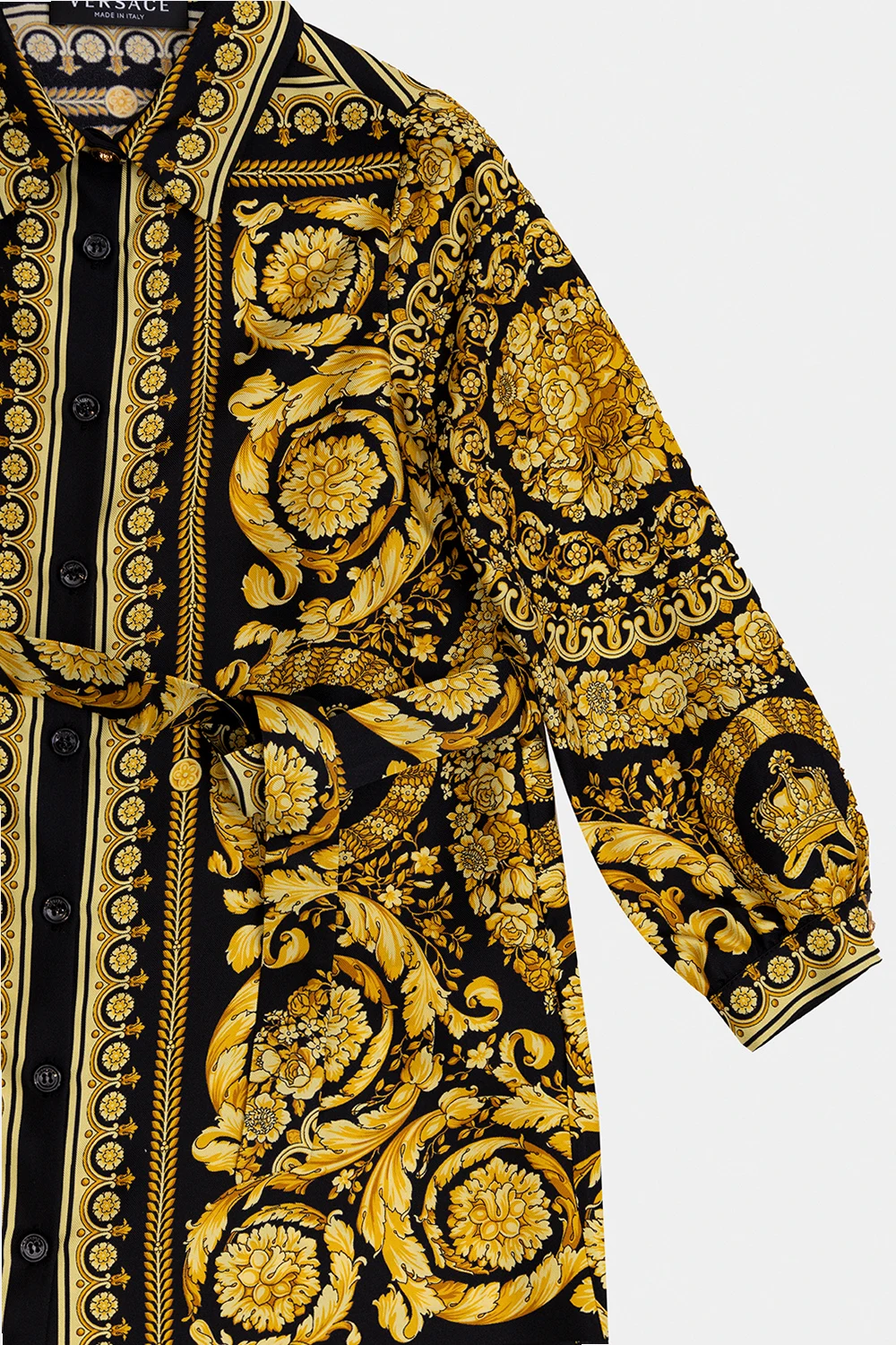 Black and yellow dress from Versace Kid. Made of silk, this long sleeve design features a waist tie, Baroque pattern and button fastenings with the iconic Medusa head detail.