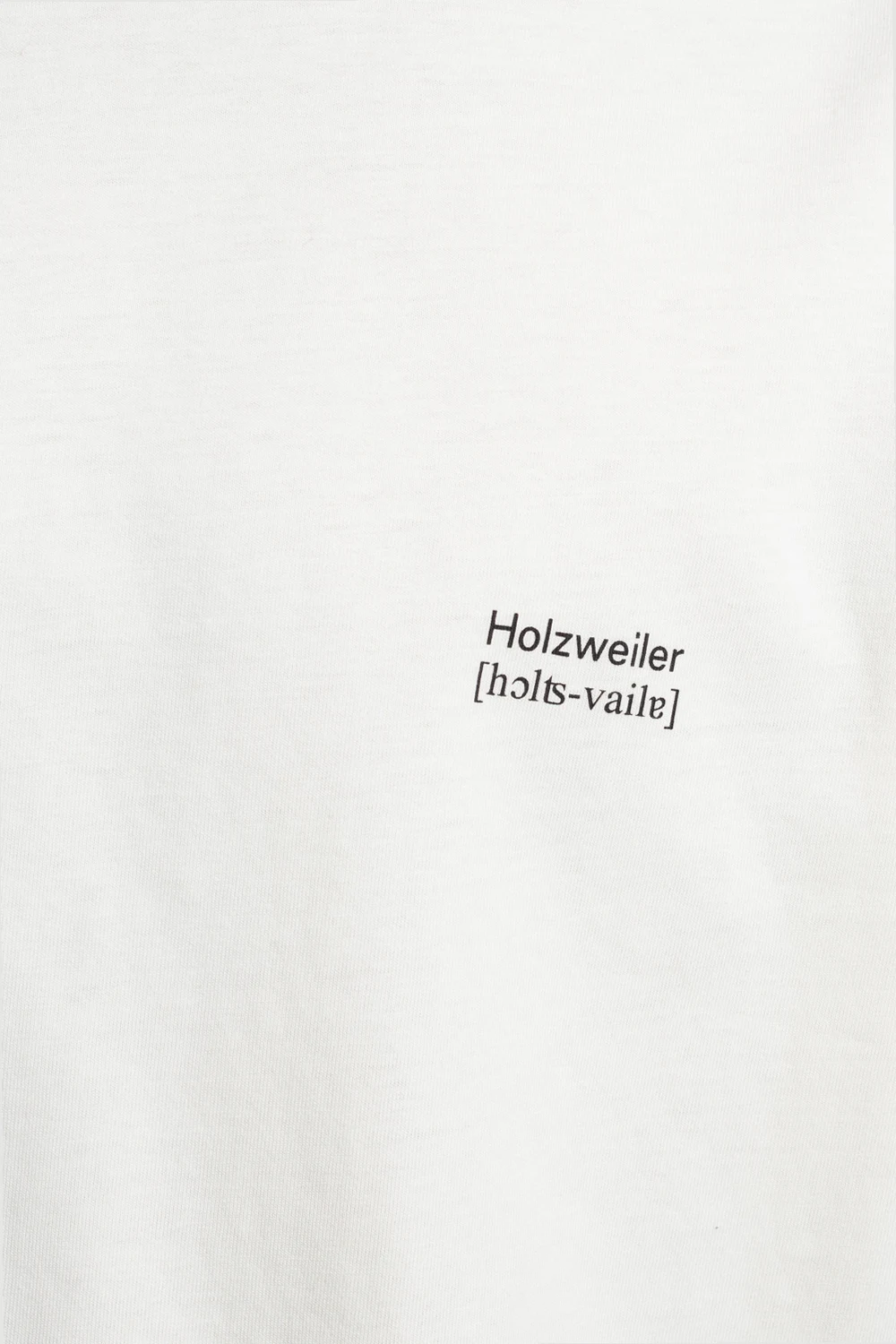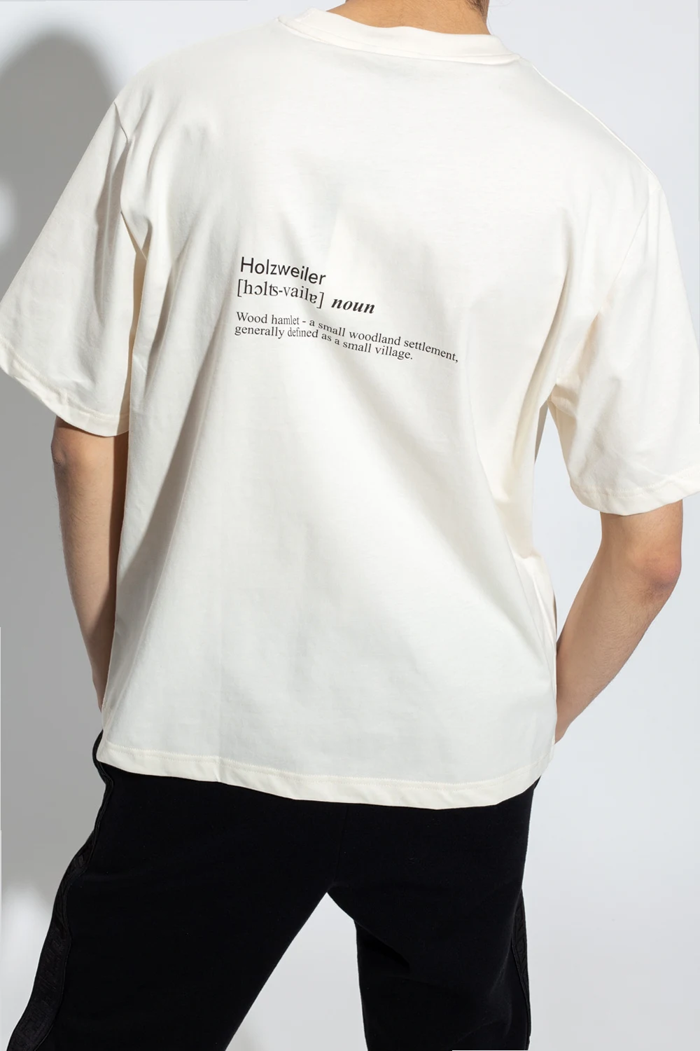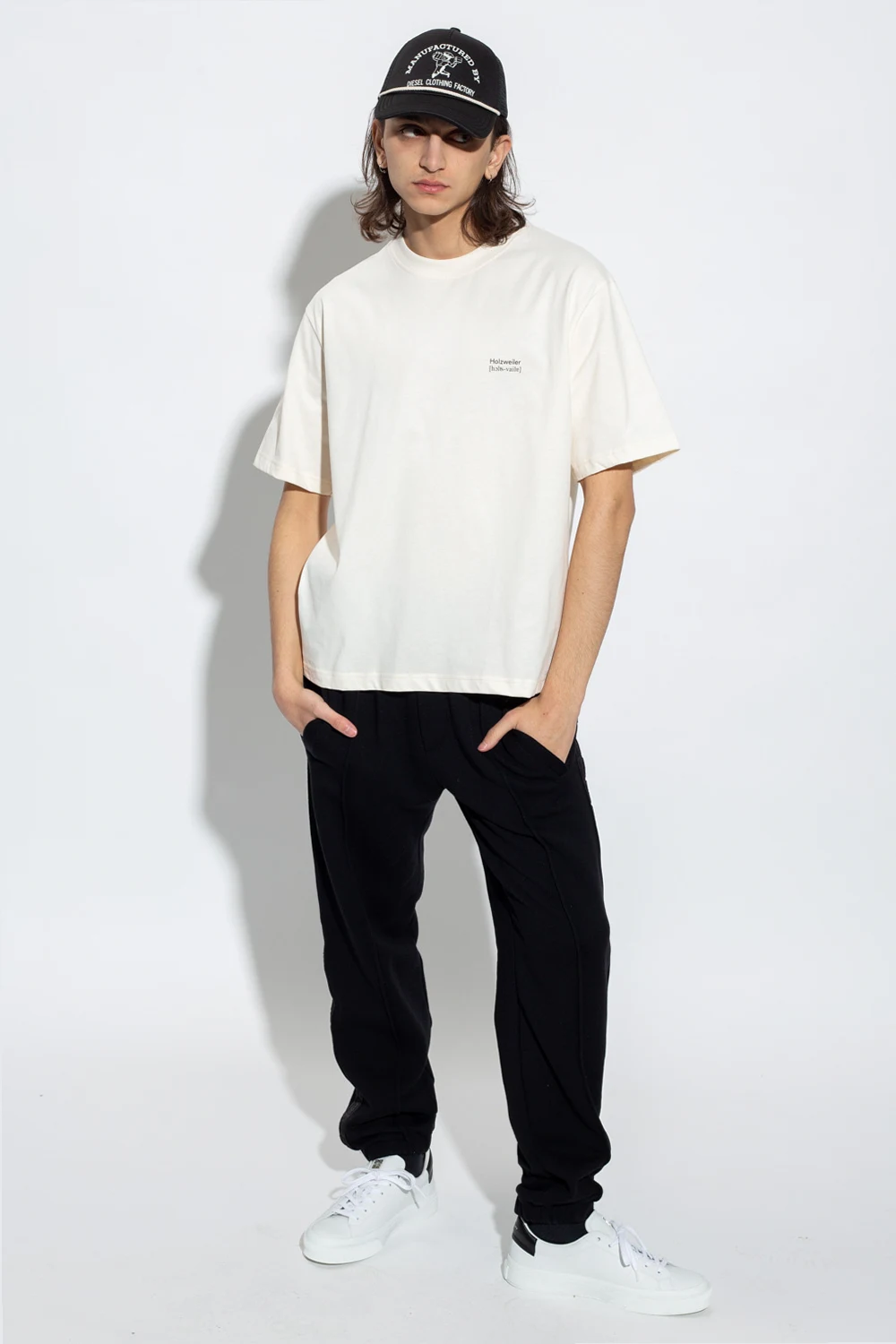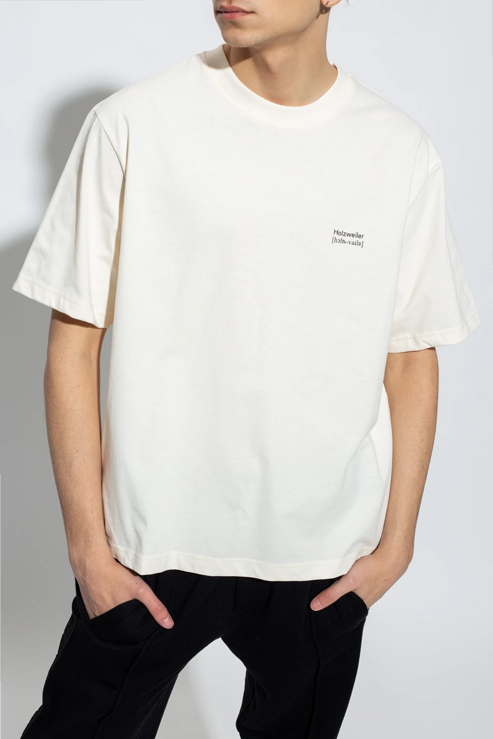 Light yellow T-shirt from Holzweiler. Made of organic cotton, this short sleeve design features a ribbed crew neck and black logo print.