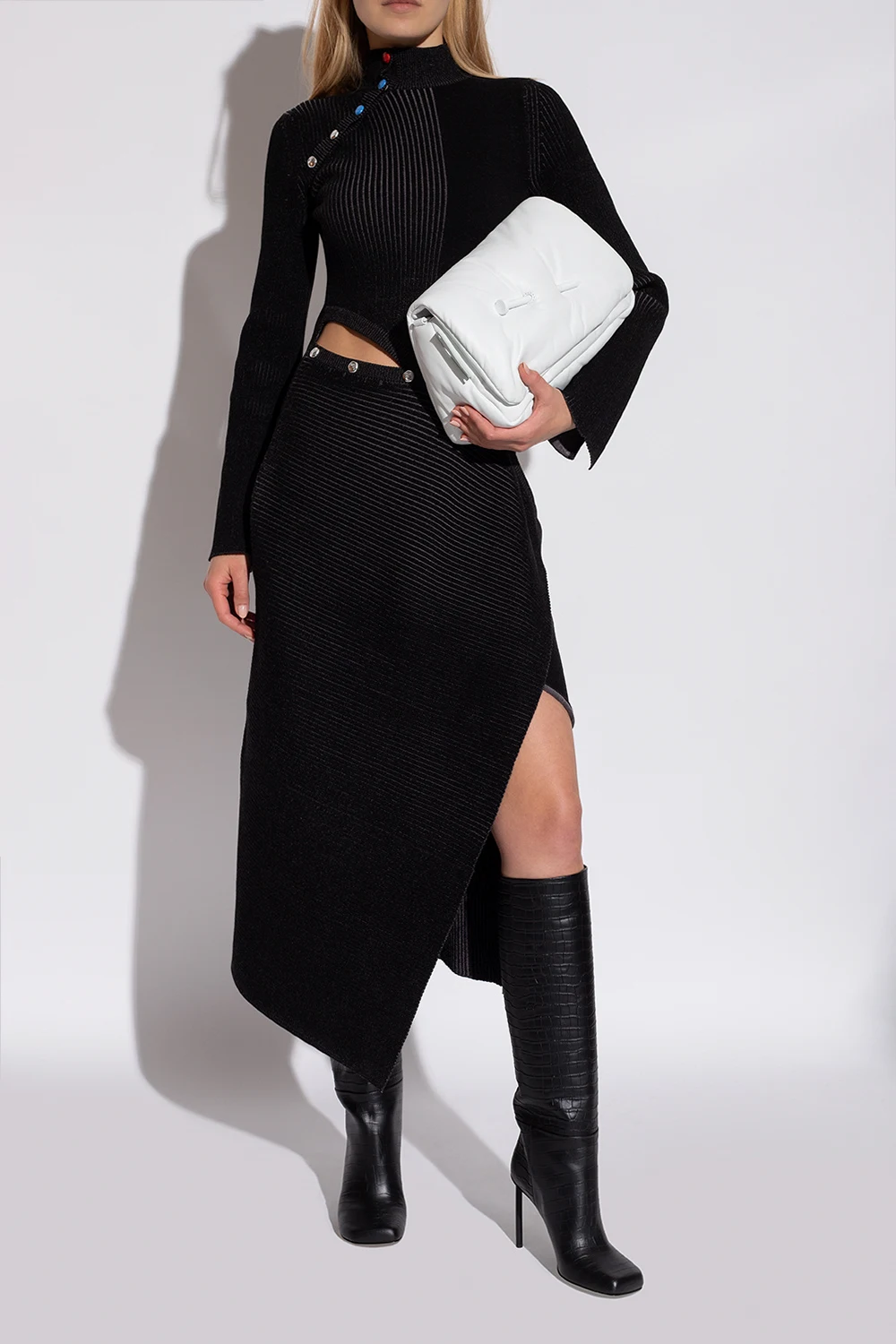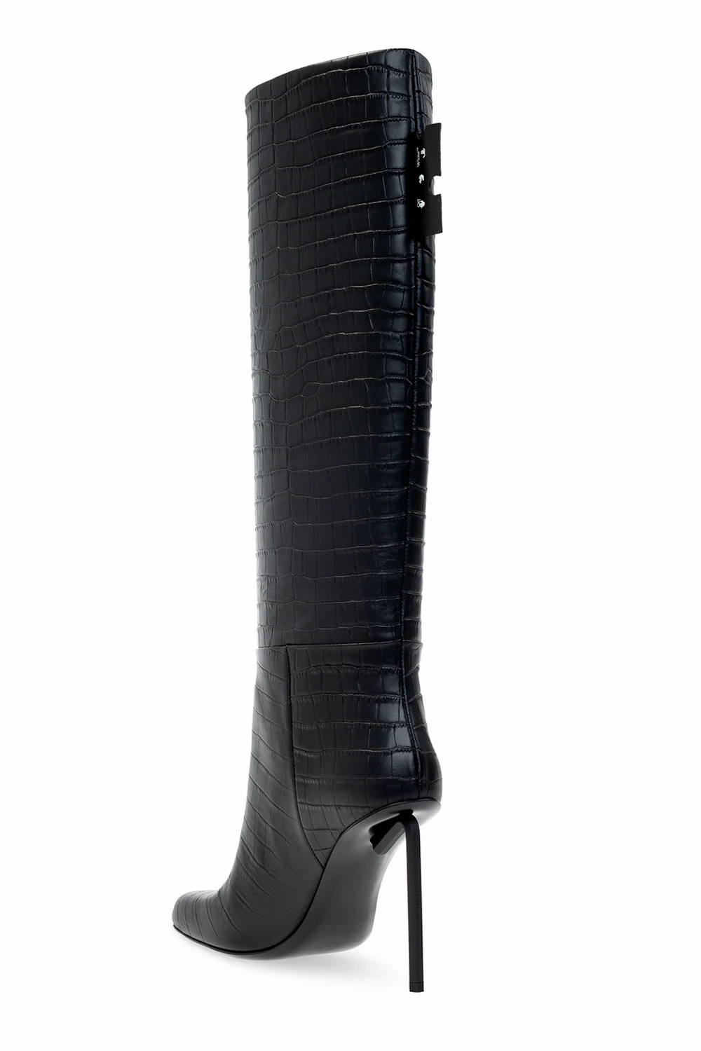 Black ‘Allen Coco’ heeled boots from Off-White. Crafted from leather with a crocodile skin effect, this model features a square toe, a back logo patch and a black leather sole.
