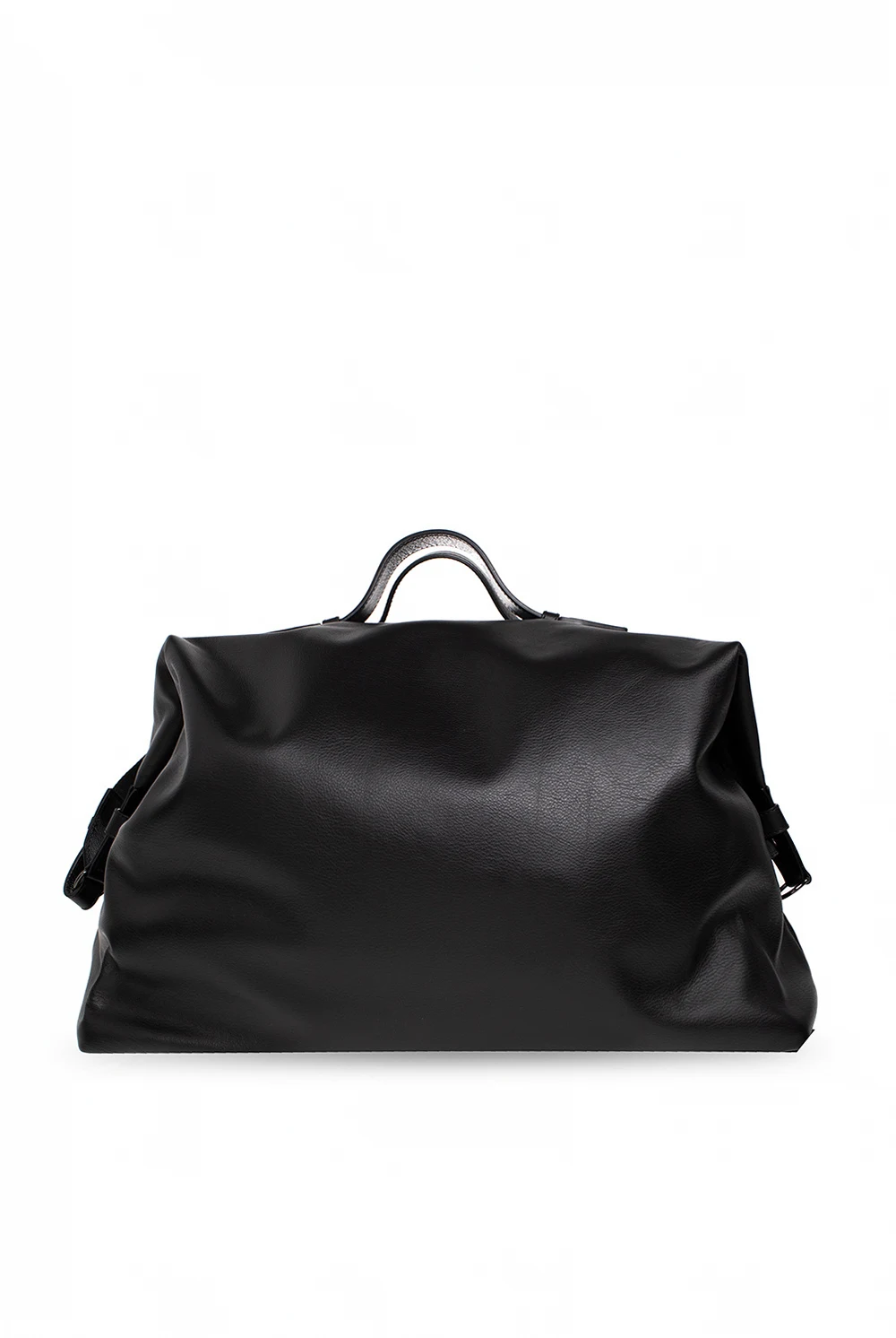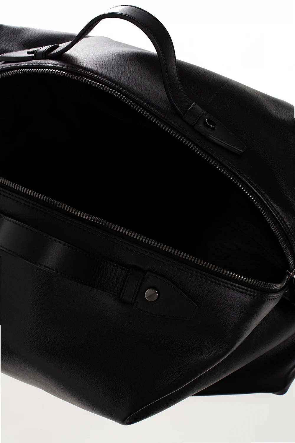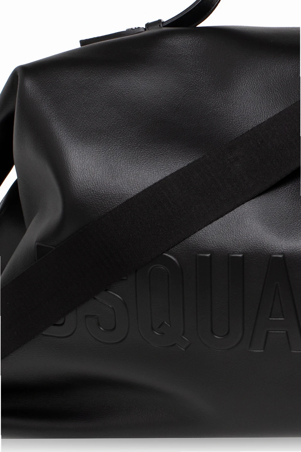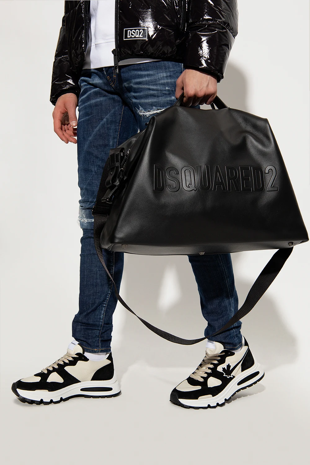 Black holdall bag from Dsquared2. Made of calf leather, this model features a two-way zip fastening, snaps on the sides, raised logo, two half-round handles, detachable and adjustable shoulder strap, dark silver-tone metal hardware and one internal compartment with one zip pocket.