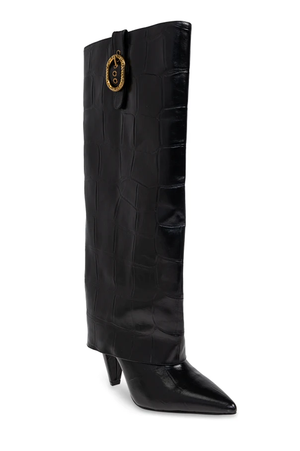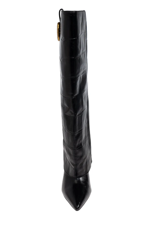 A croc-embossed texture envelops the shaft, exuding opulence, while the top of the boot features an elegant gold-toned circular buckle adorned with the designer’s logo for a striking finish. Masterfully balancing innovative design and luxurious materials, these boots elevate any ensemble with their unmistakable modernity and British-inspired edge.