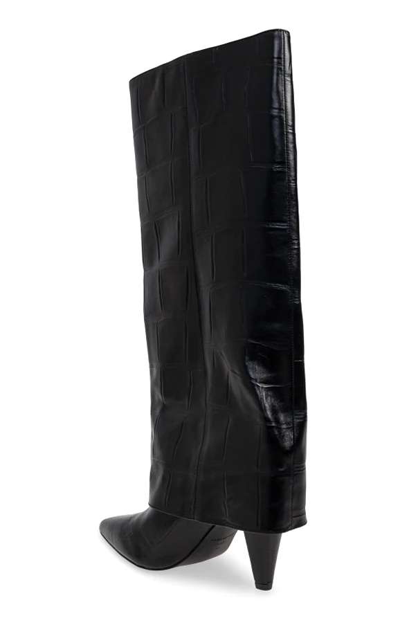 The Fold Over Heeled Boots by Kurt Geiger epitomize contemporary sophistication with their knee-high silhouette and assertive, rectangular lines. Impeccably crafted from premium glossy leather—offered in natural or eco alternatives—these statement boots command attention with pointed elongated toes and a slender, subtly angled kitten heel, infusing every step with refined allure.