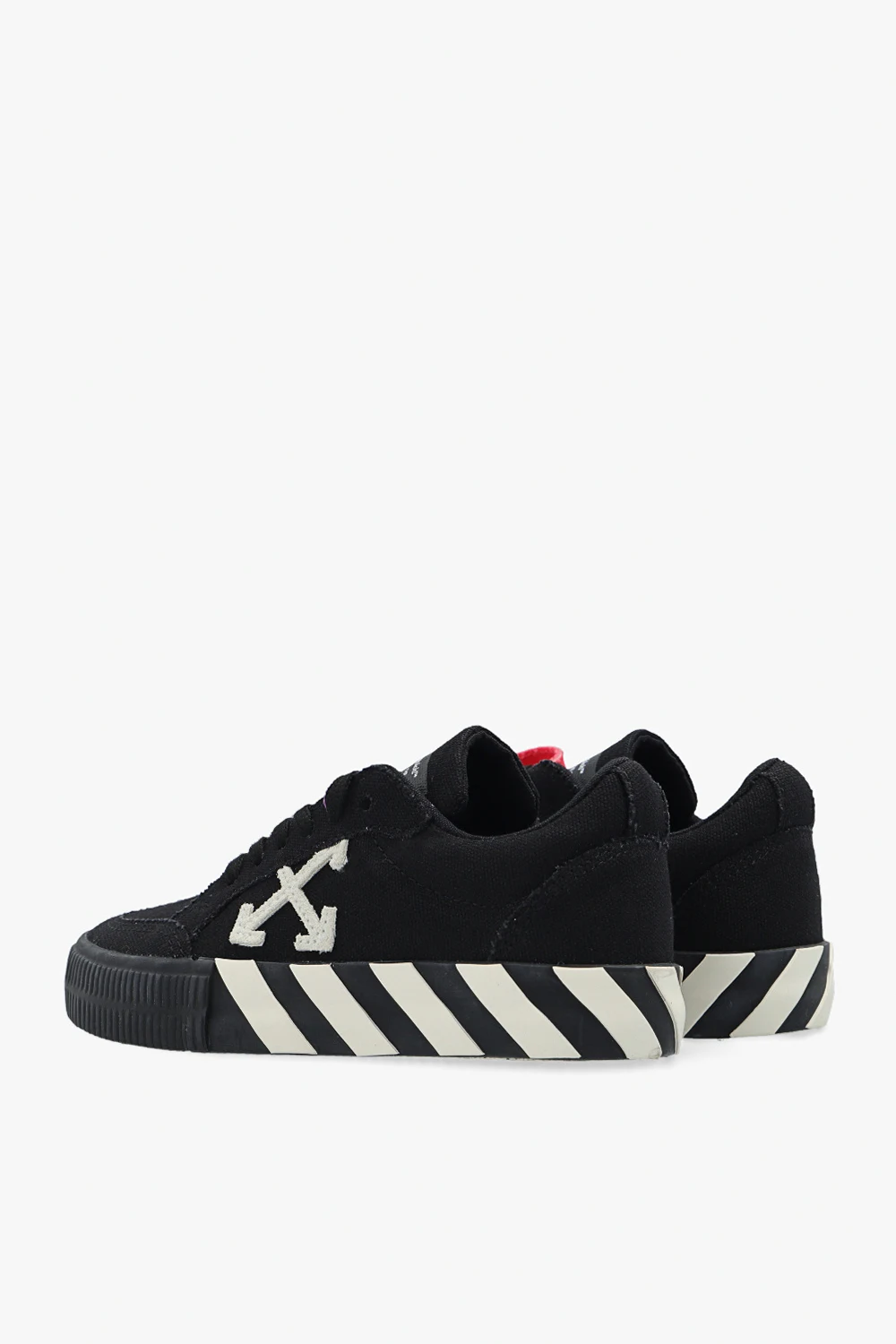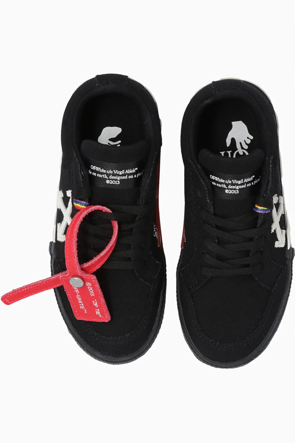 Black, white and red ‘Vulcanized’ sneakers from Off-White. Made of fabric, this lace-up pair features a patch, logo print, red insert and white rubber sole.