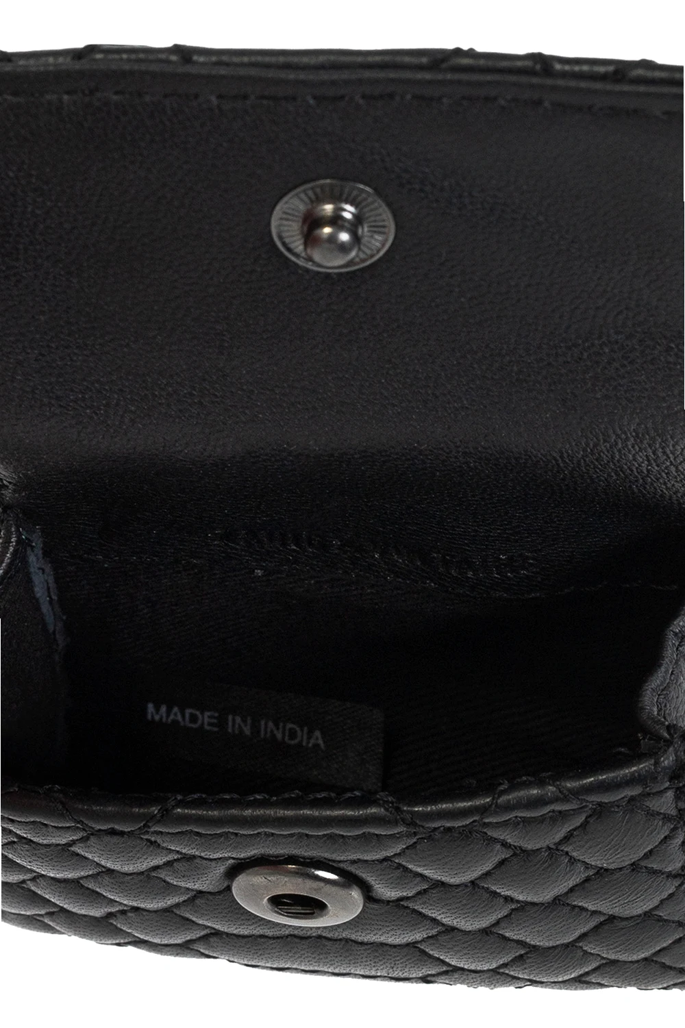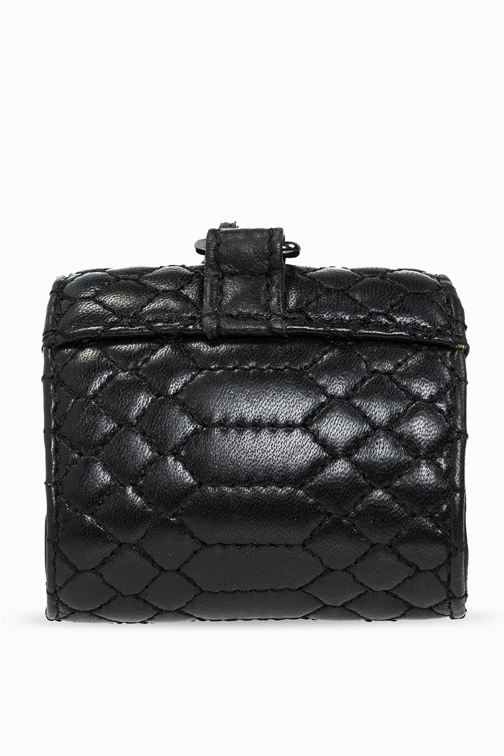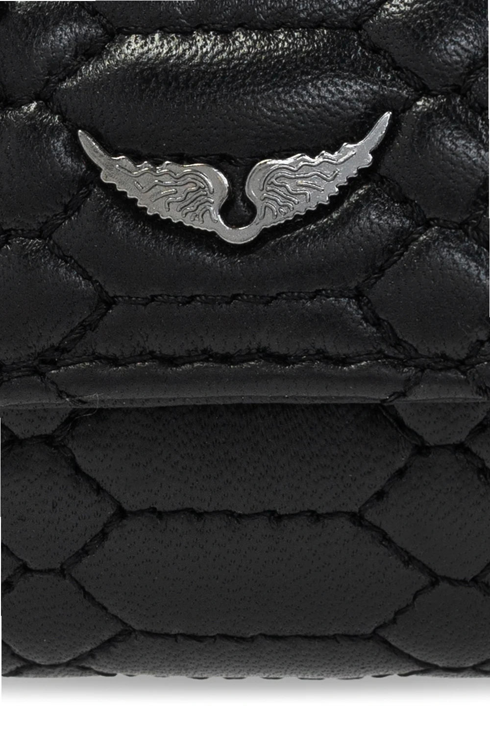 Black quilted AirPods case from Zadig & Voltaire. Made of leather, this item features a snap closure, wing appliqué, neck chain, one internal compartment and silver-tone metal hardware.