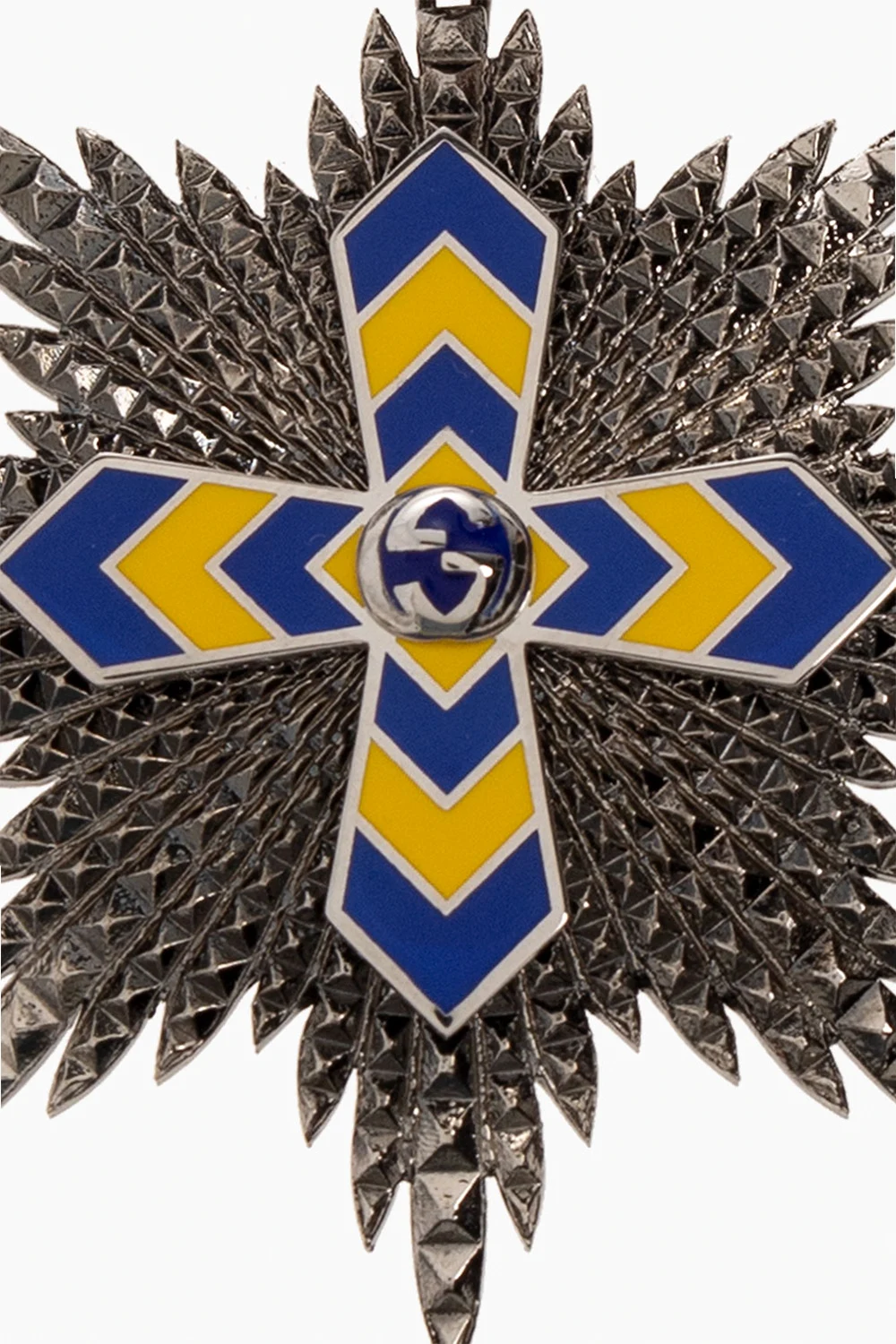 Silver-tone bracelet from Gucci. Made of brass, this item features a sculpted pattern, Interlocking G logo and varnish finish in yellow and blue.