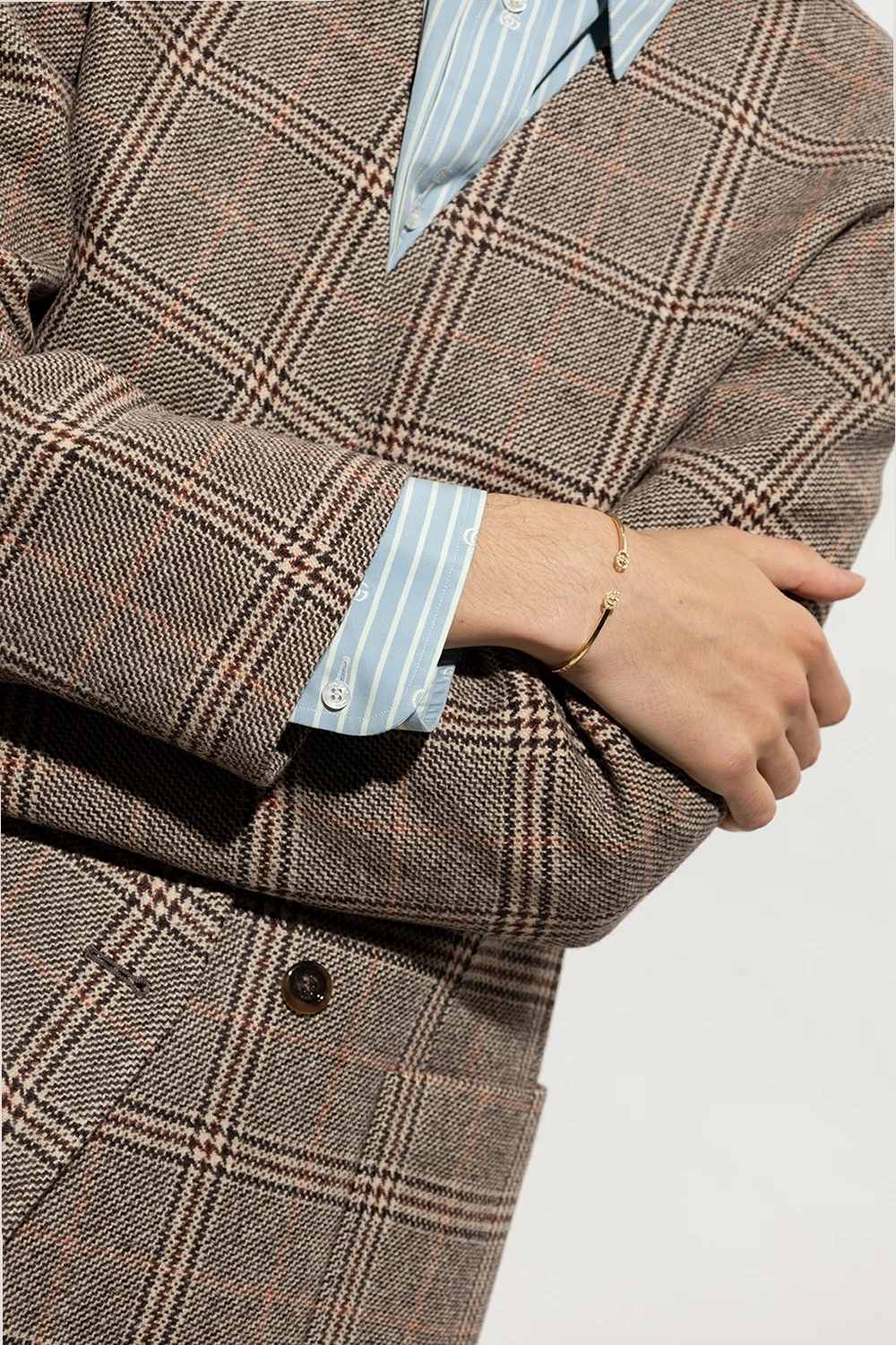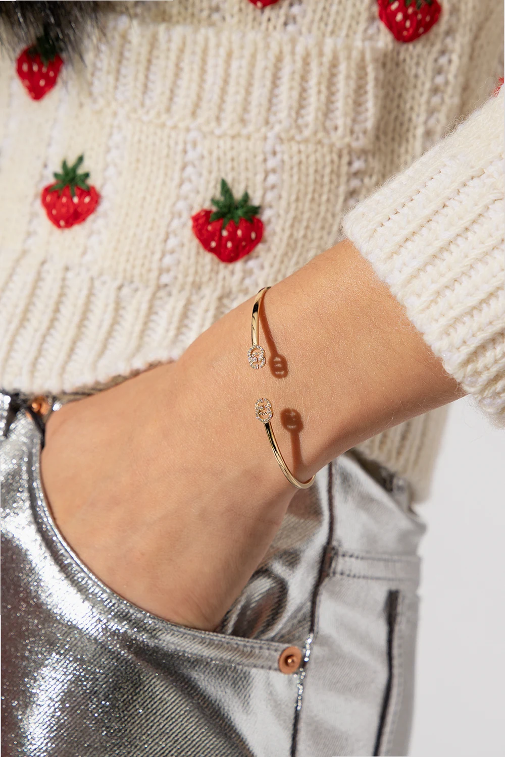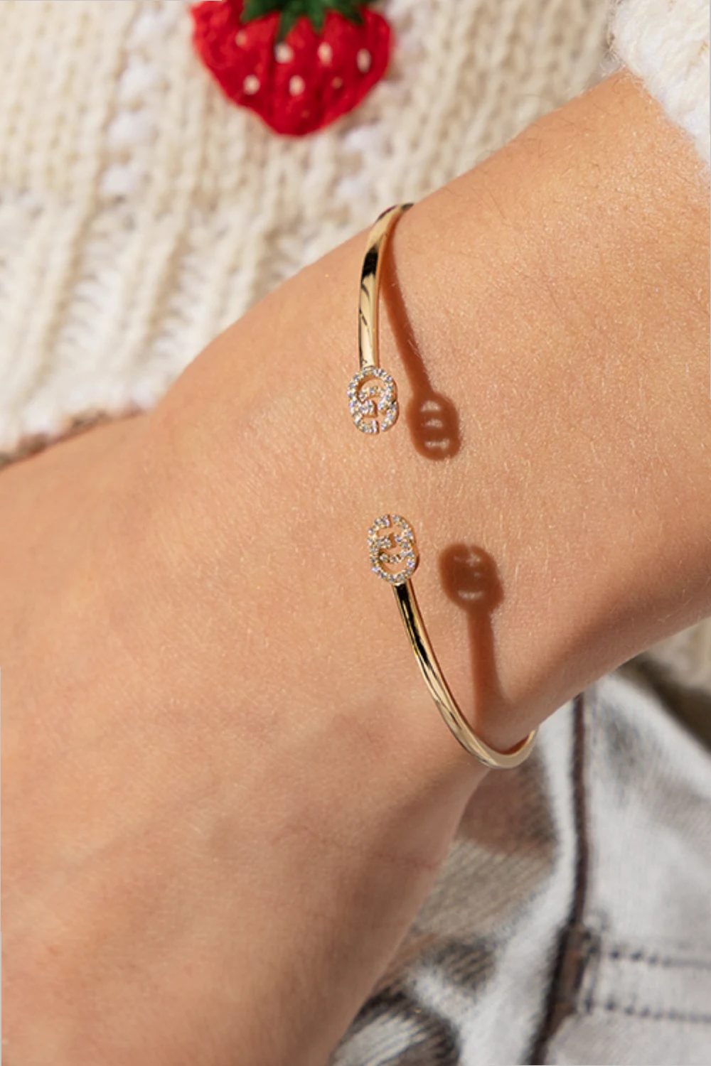 Cuff bracelet from Gucci. Made of 18k yellow gold, this item features on both ends Double G details encrusted with 46 diamonds totalling approximately 0.10 carats.
