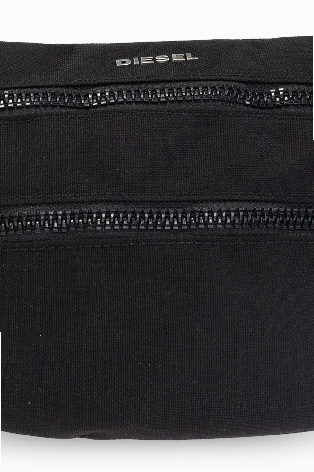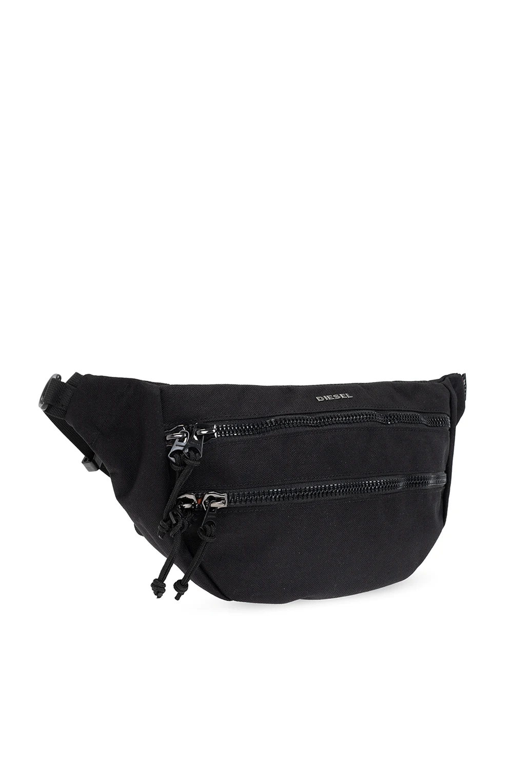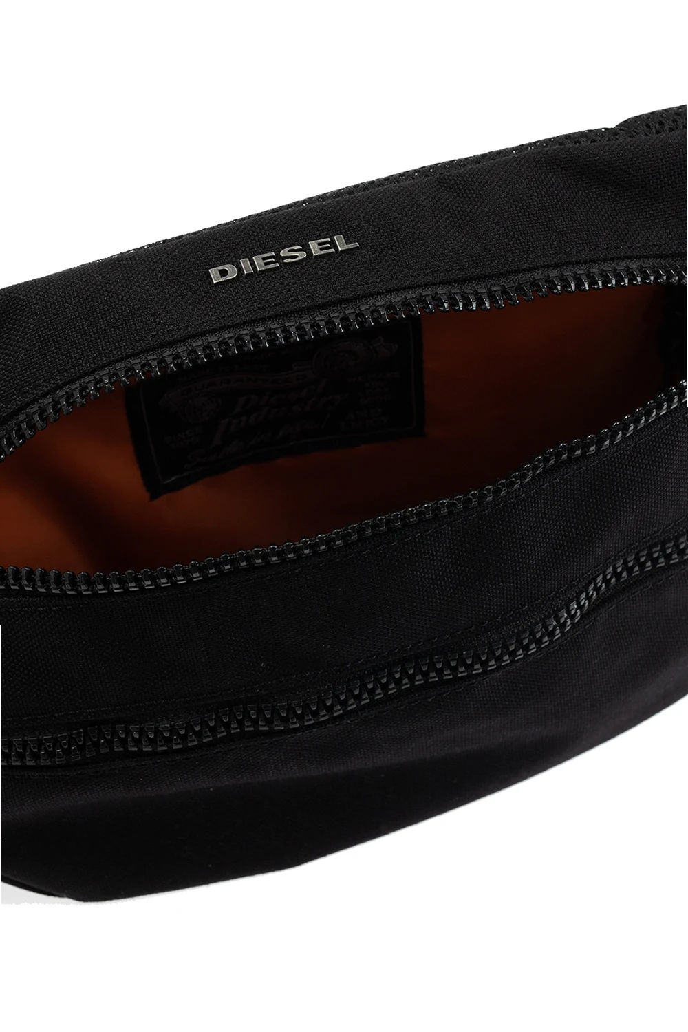 Black ‘F-URBHANITY’ belt bag from Diesel. Crafted from durable CORDURA® fabric, this design secures with two-way zippers and features silver-tone metal logo hardware, a zip pocket on the front, an adjustable strap, an additional strap with a snap closure and an orange-clad interior with a zip pocket.