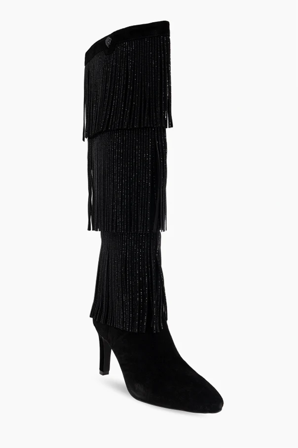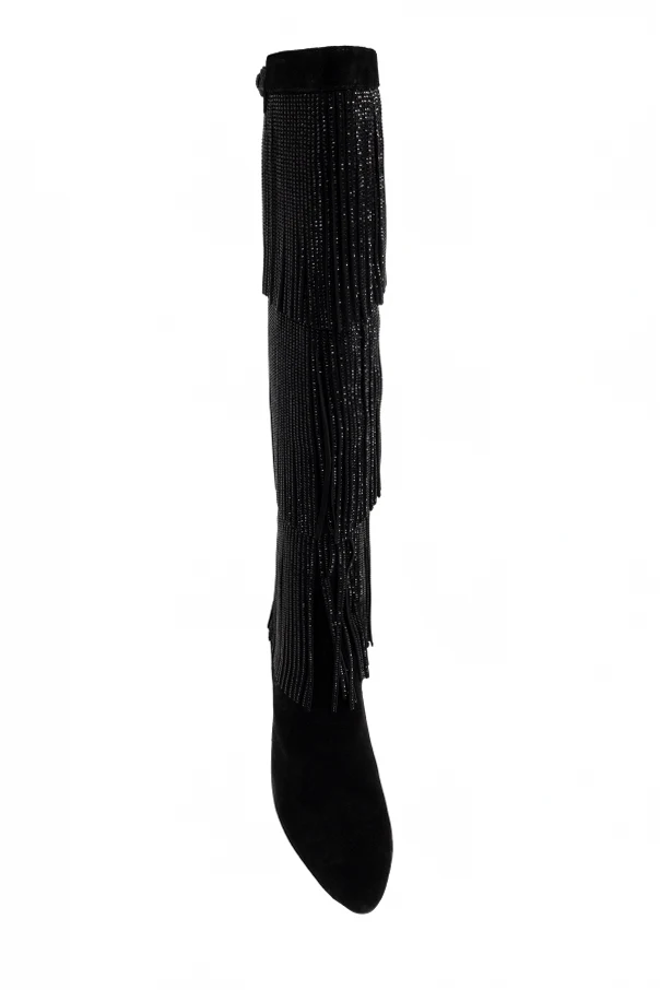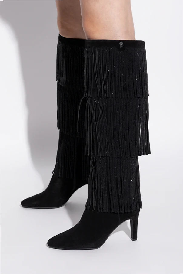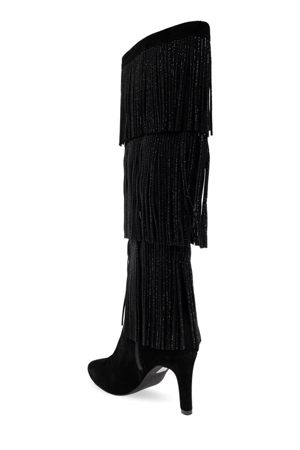 Embrace refined sophistication with the Shoreditch Knee-High Boots by Kurt Geiger, expertly crafted from sumptuous black suede-like leather and accented by cascading, shimmering fringes. Three opulent tiers of meticulously placed, glossy textile fringe envelop the sleek silhouette, creating a dynamic interplay of movement and light. The elegantly tapered toe and slender stiletto heel evoke timeless femininity, making these boots a captivating statement for any discerning wardrobe.