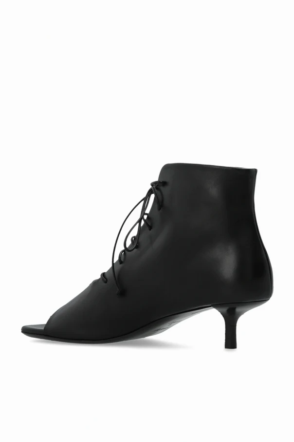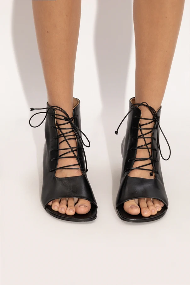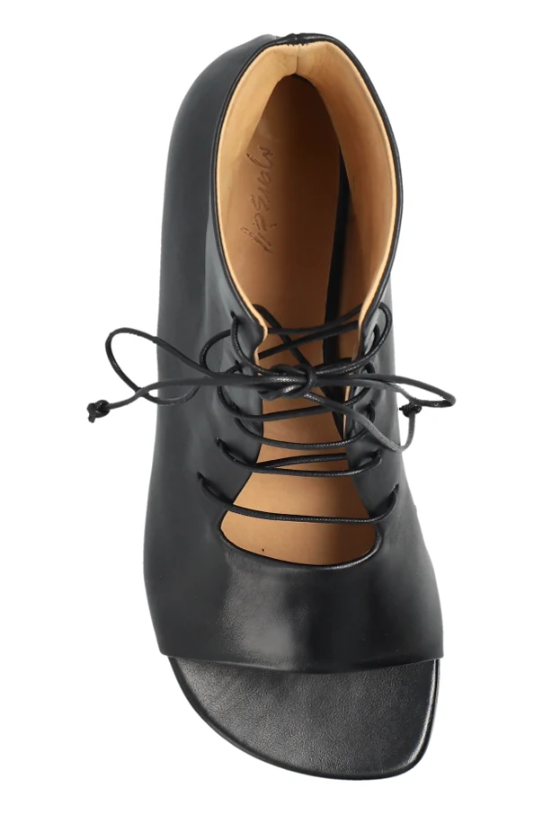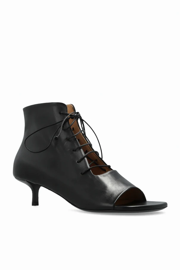 Elevate your style with the Sottiletta mid-heel pumps by Marsell, meticulously crafted in premium black calfskin. Boasting a refined silhouette, these lace-up peep-toe ankle boots rest gracefully atop a slender kitten heel, seamlessly blending modern sophistication with timeless Italian artistry.