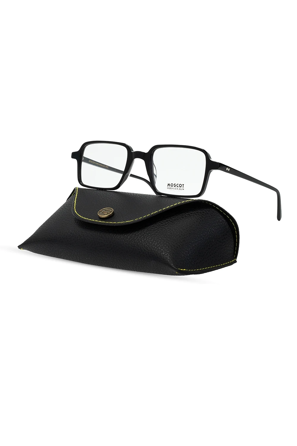 Black ‘Shindig’ eyeglasses from Moscot. This handcrafted model comes with a case and a canvas bag with a logo print in grey and yellow.