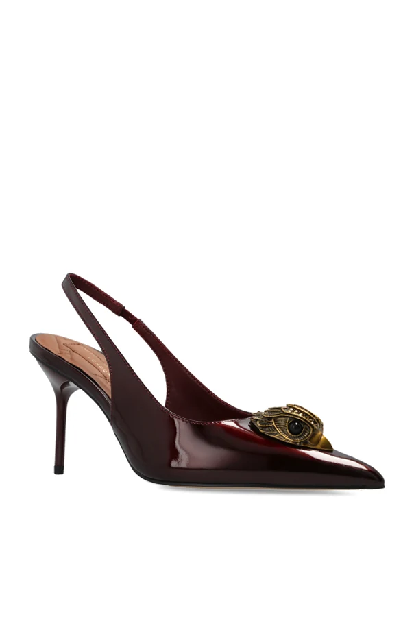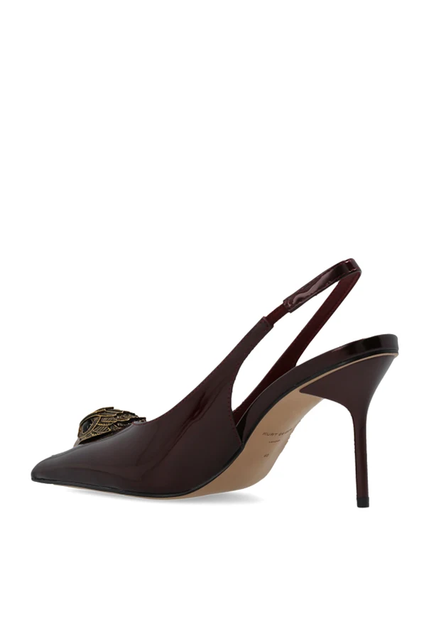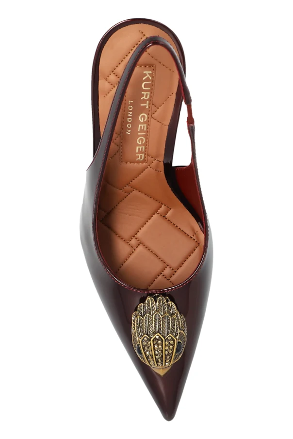 Imbued with the striking charm characteristic of Kurt Geiger London , the Large Eagle High-Heel Pumps in a sophisticated burgundy hue redefine contemporary glamour. Crafted from lustrous patent leather, these shoes elegantly contour the foot with their sleek, pointed toe and alluring slingback silhouette, accentuating the leg’s natural grace. The high, slender stiletto heel delivers a statuesque profile, while the interior is adorned with the iconic designer logo—an unmistakable sign of authenticity.