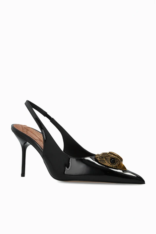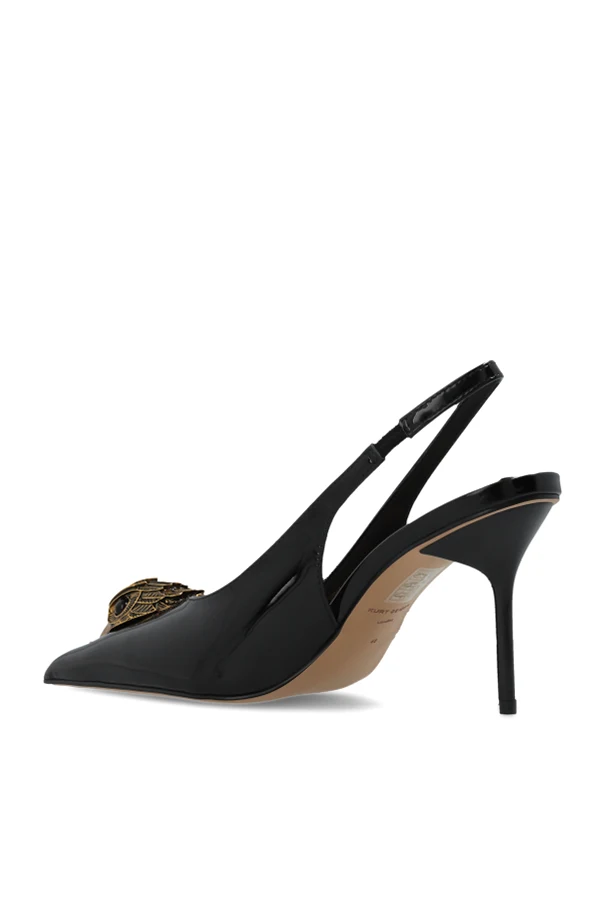 Introducing the Large Eagle high-heel pumps by Kurt Geiger, an exquisite expression of contemporary sophistication. Crafted in lustrous black patent leather , the elongated pointed toe and slender stiletto heel evoke an air of refined glamour. The open slingback silhouette embraces the heel with grace, while a quilted, light brown insole ensures a touch of comfort with every step.