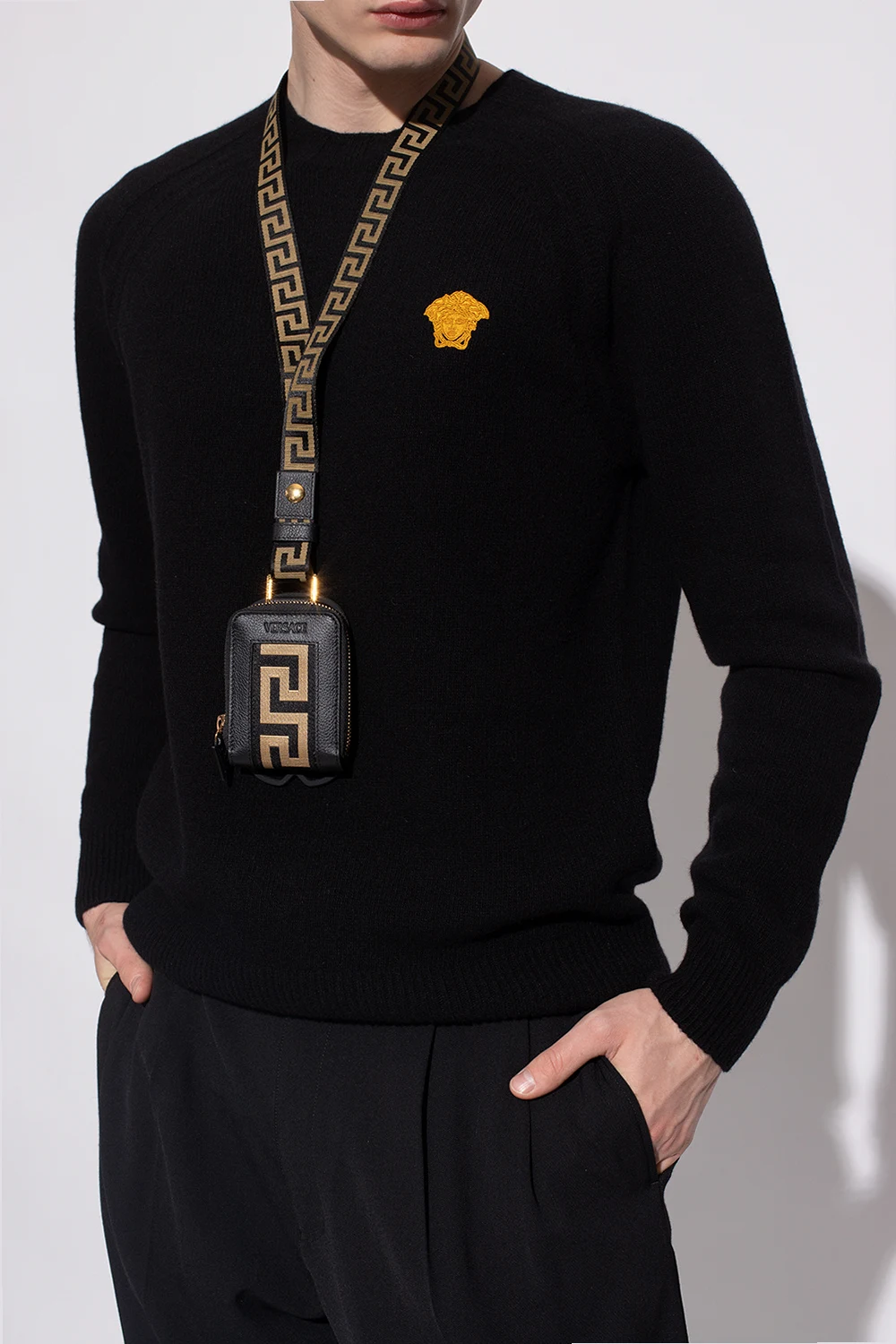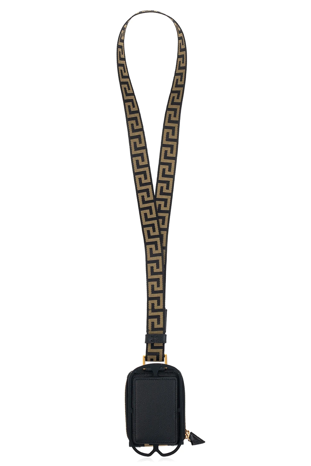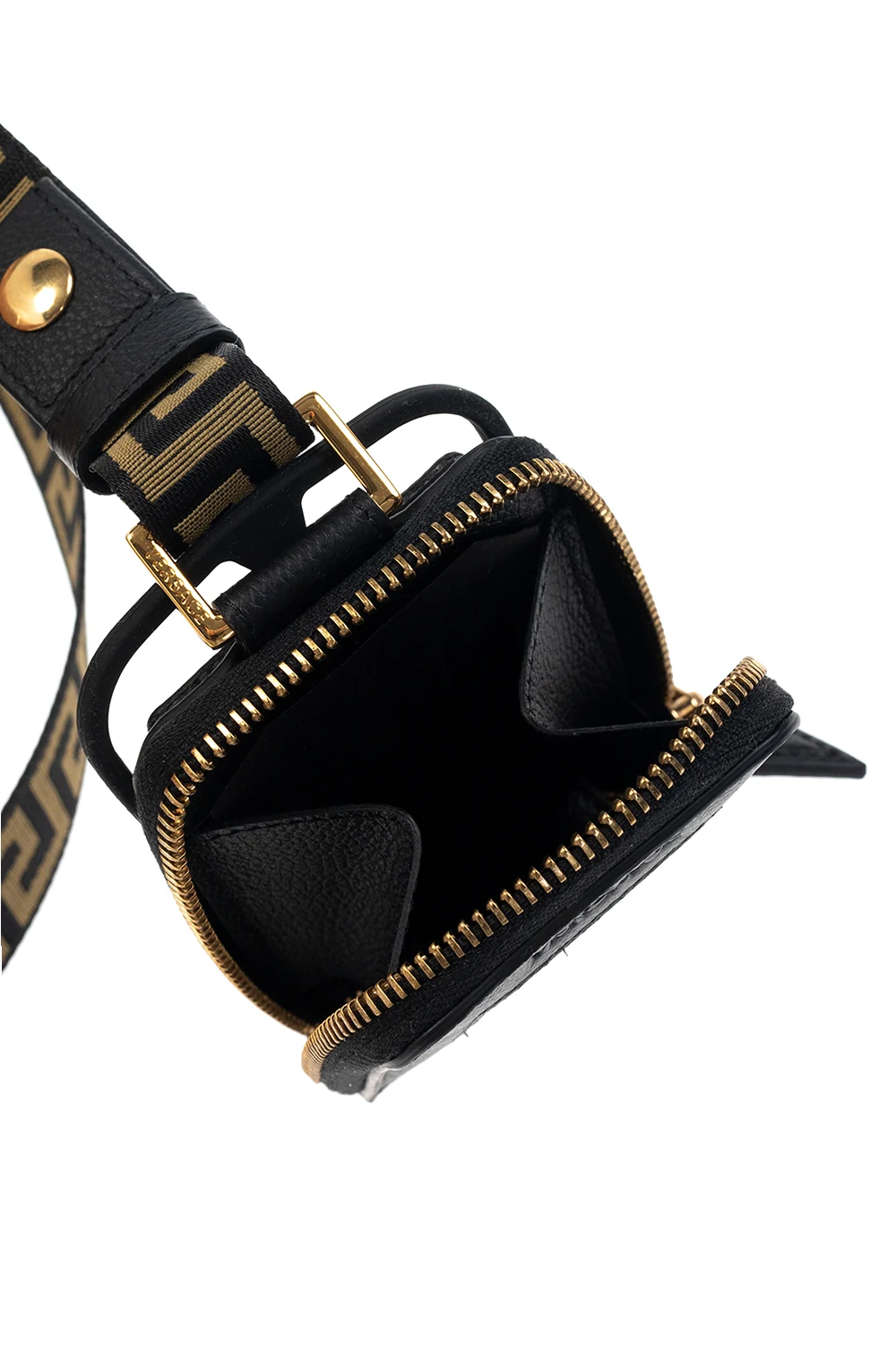 Black and gold-tone ‘Greca’ earphones pouch from Versace. Made of calf leather, this item features a gold-tone metal zip, embossed logo, the iconic Greek pattern and silicone element at the back.