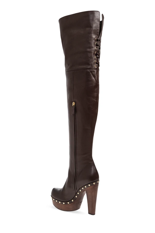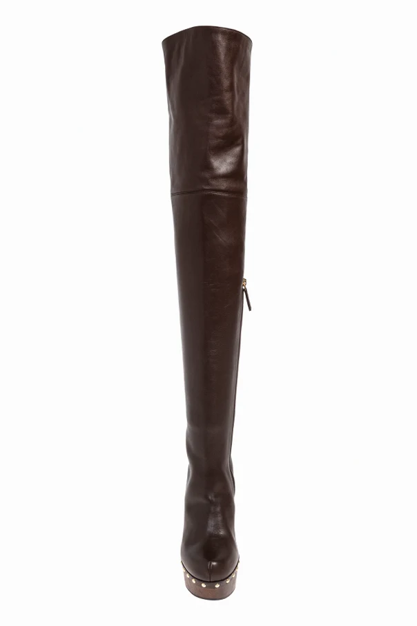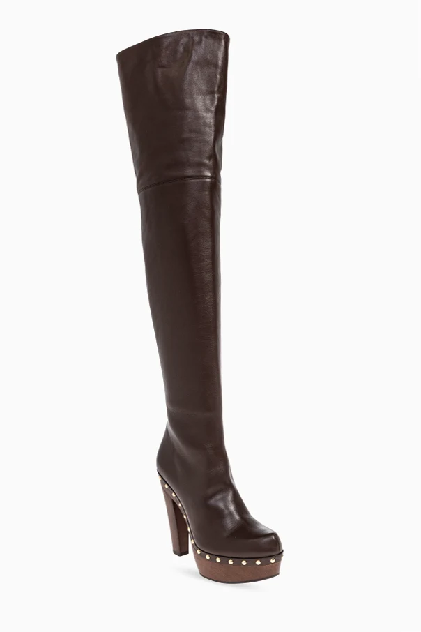 Introducing the Lola Over-the-Knee Boots by Chloé , a sublime union of architectural form and timeless minimalism. Crafted from smooth, high-quality genuine leather with a subtle luster, these boots exude an aura of exclusivity and modern grace. The elongated, straight-cut silhouette reaches elegantly above the knee, gently curving at the top to refine your profile.