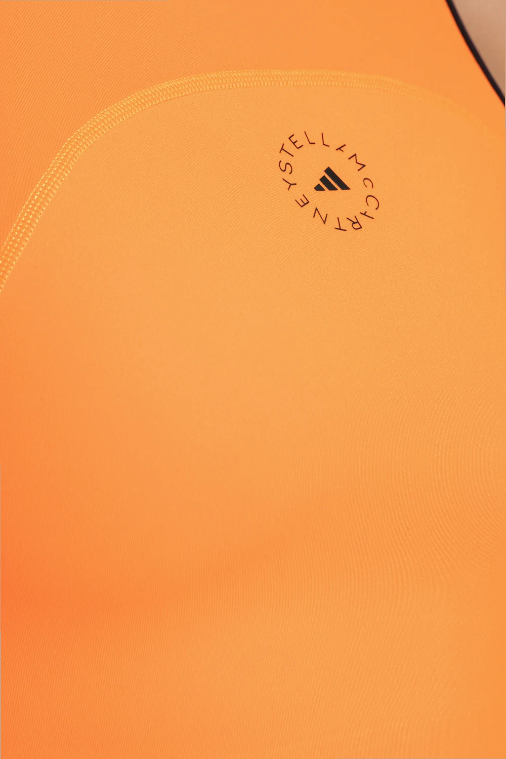 Neon orange training top from ADIDAS by Stella McCartney, the ‘End Plastic Waste’ line. Crafted partially from recycled material using AEROREADY technology, this style features a cropped silhouette with a round neck, black trimming, an elastic hem, a black logo application on the front and a cut-out detail at the back.