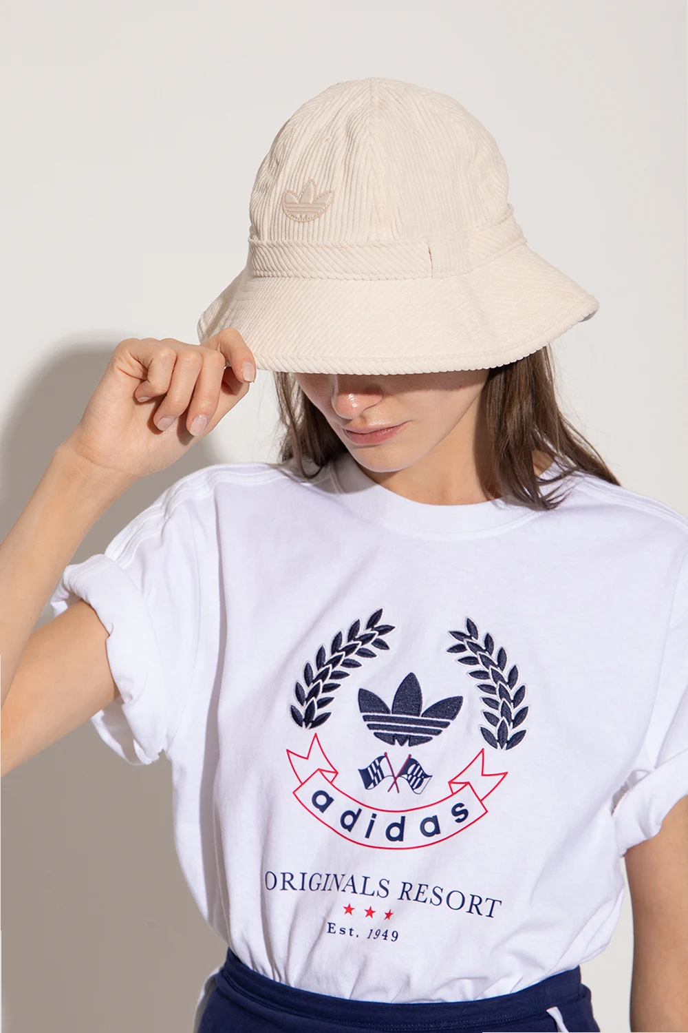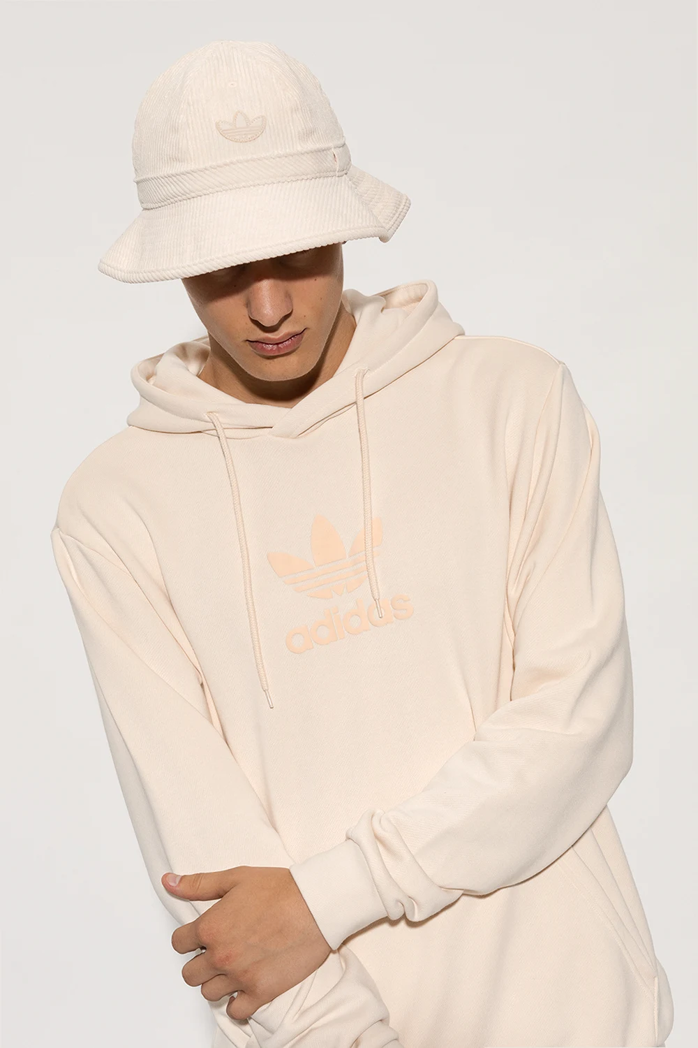 Cream corduroy bucket hat from ADIDAS Originals. Made from recycled material, this item features a logo-shaped patch on the front.