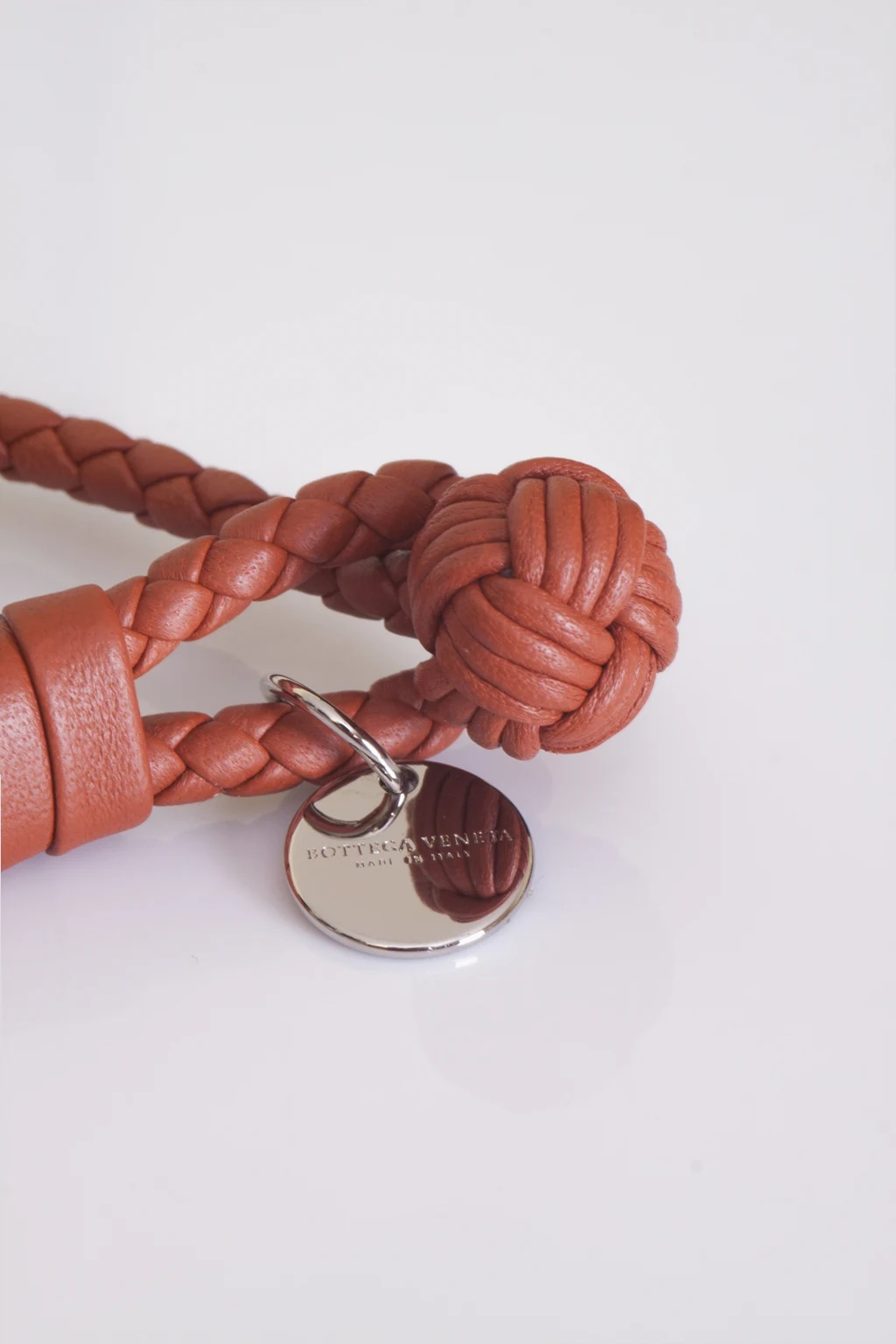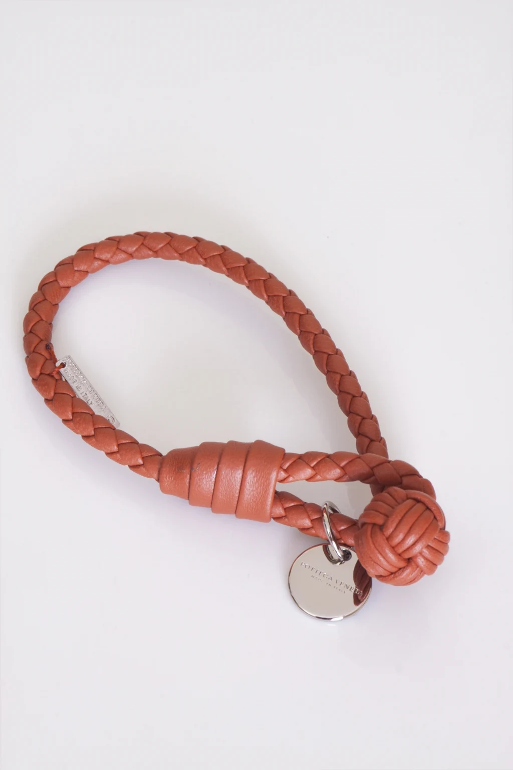 Single-stranded, Bottega Veneta bracelet made of lamb leather in brick red colour. Finished with brass detalis. Loop fastener with a knot detail.