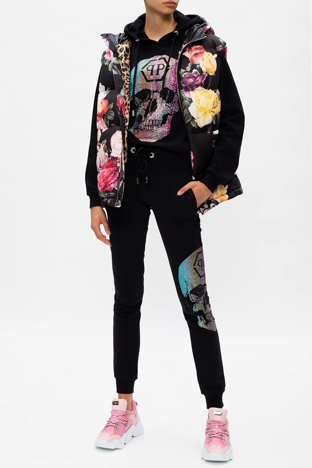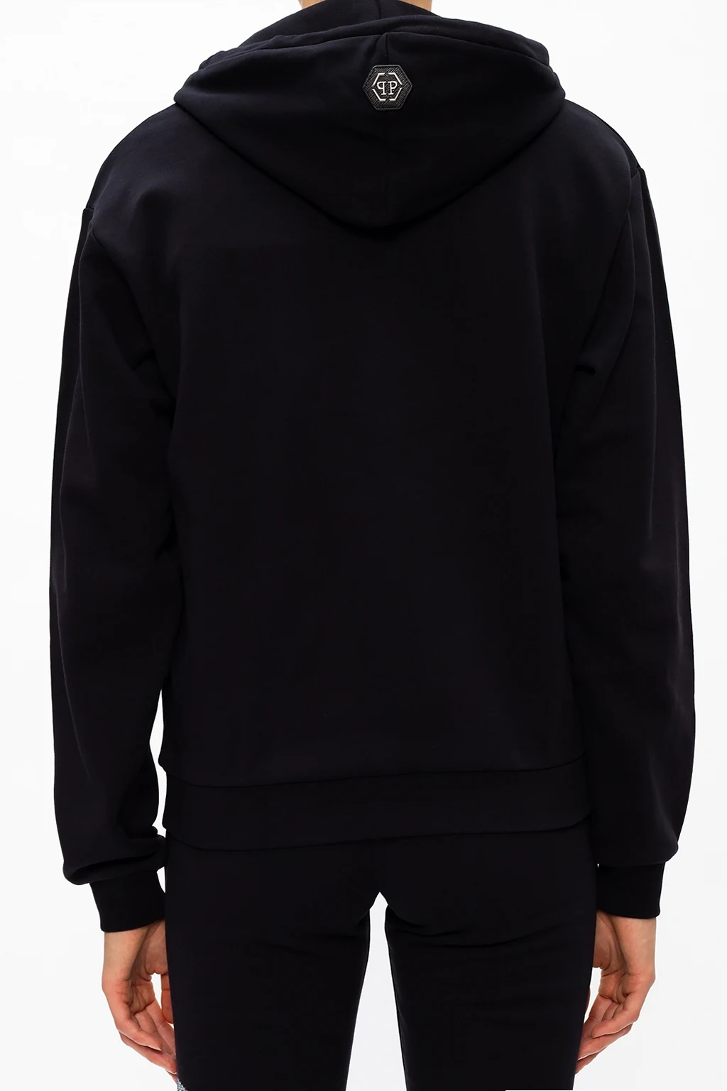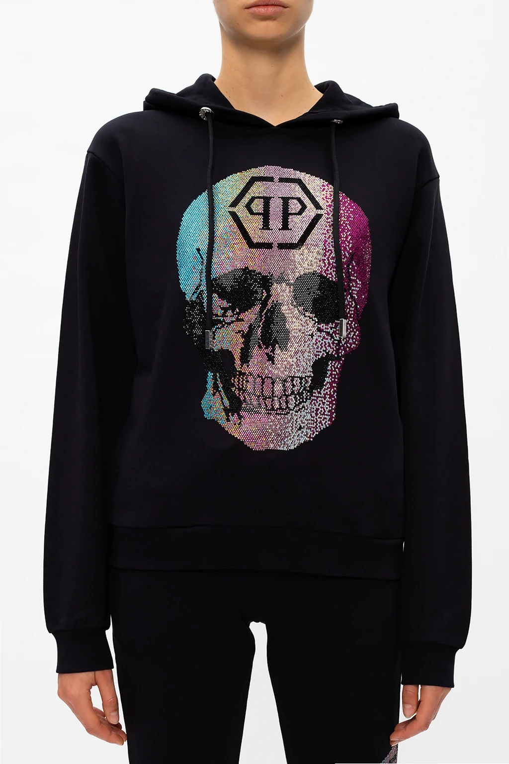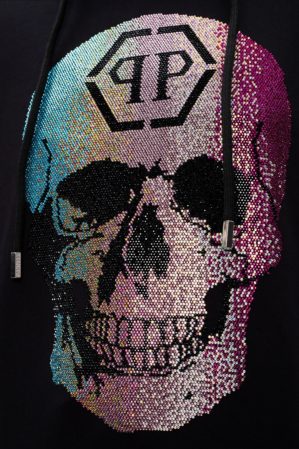 Black hoodie from Philipp Plein. Crafted from cotton, this long sleeve design features a drawstring hood, skull motif embellished with colorful elements, two front pockets and ribbed trims at the hem and cuffs.