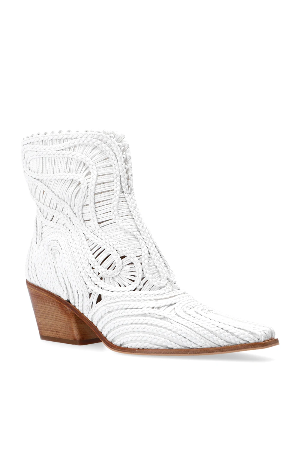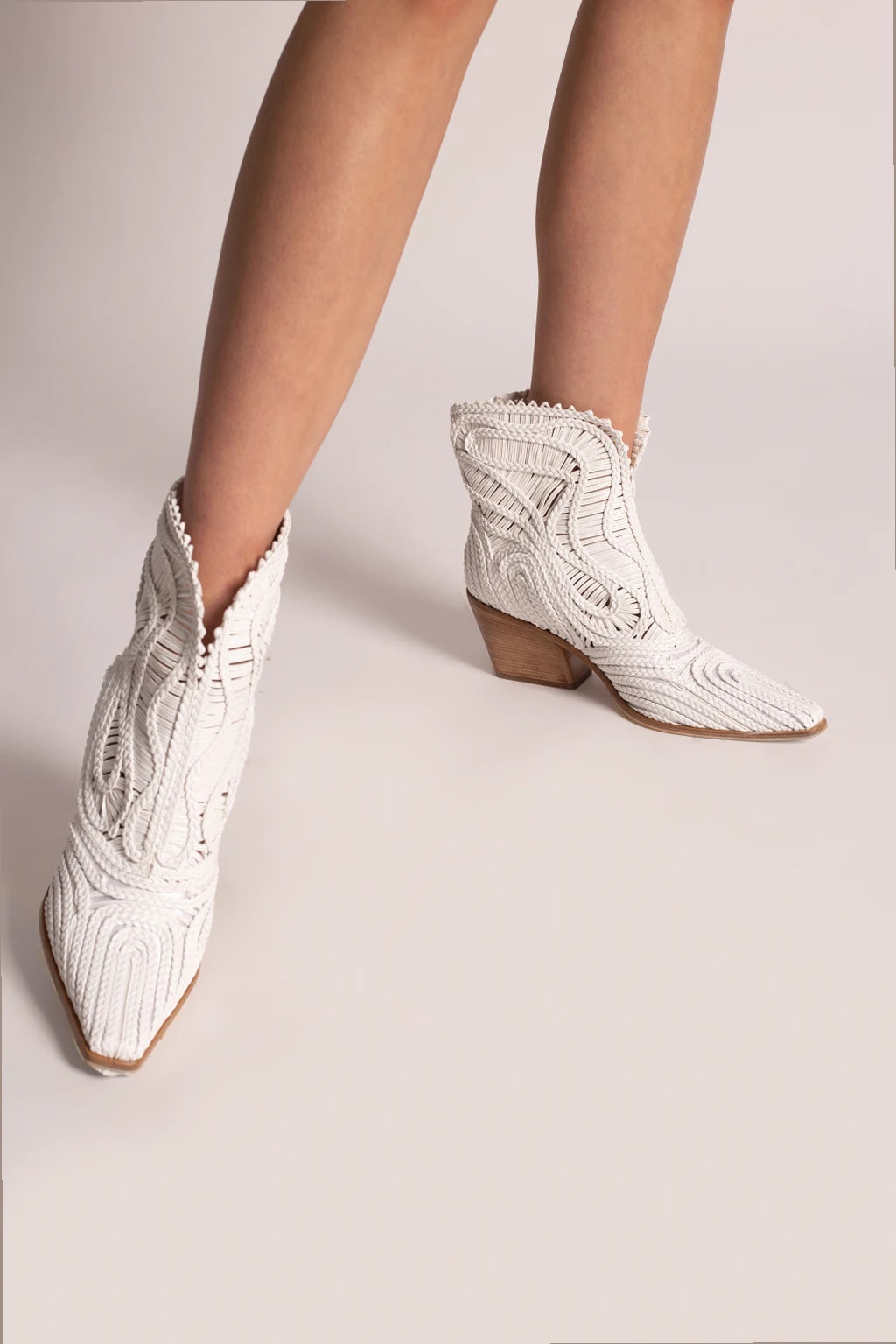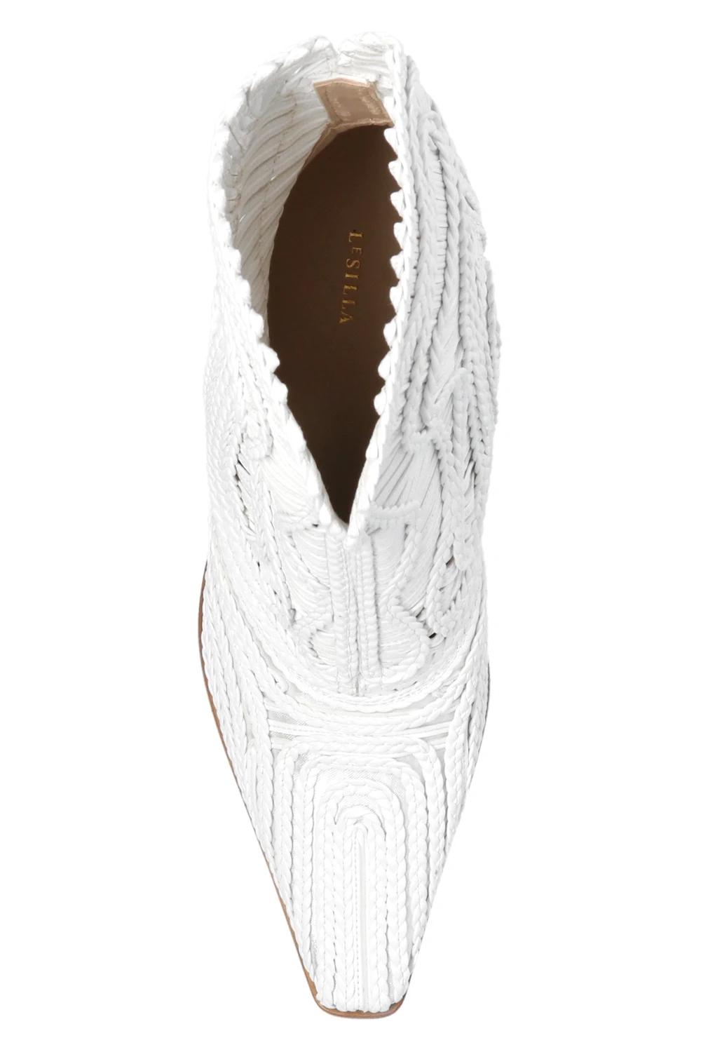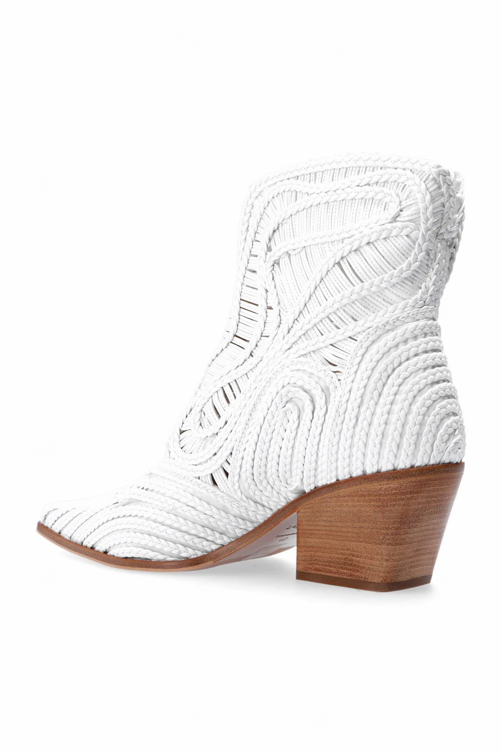White ‘Charlize’ heeled woven ankle boots from Le Silla. Crafted from leather, this square toe design is complete with a brown leather sole with a rubber anti-skid layer.