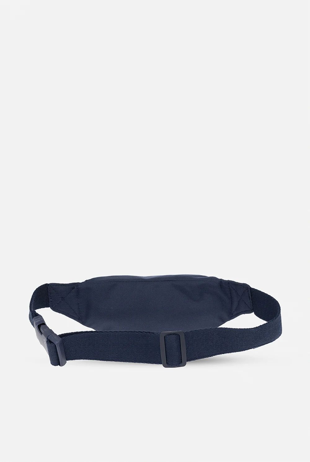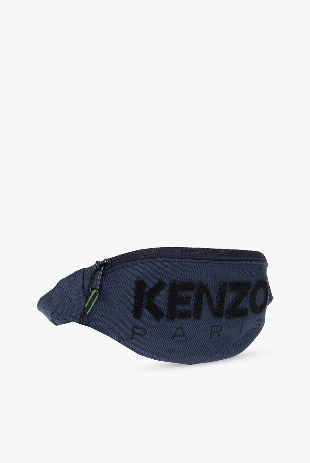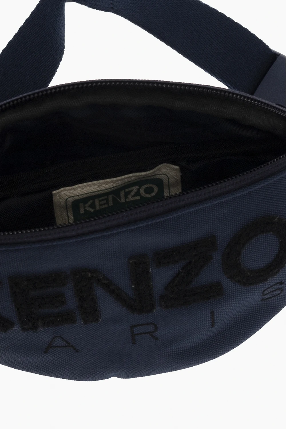Navy belt bag from Kenzo Kids. Fastened with a zip, this model features a black logo pattern, adjustable belt, one internal compartment and navy metal hardware.