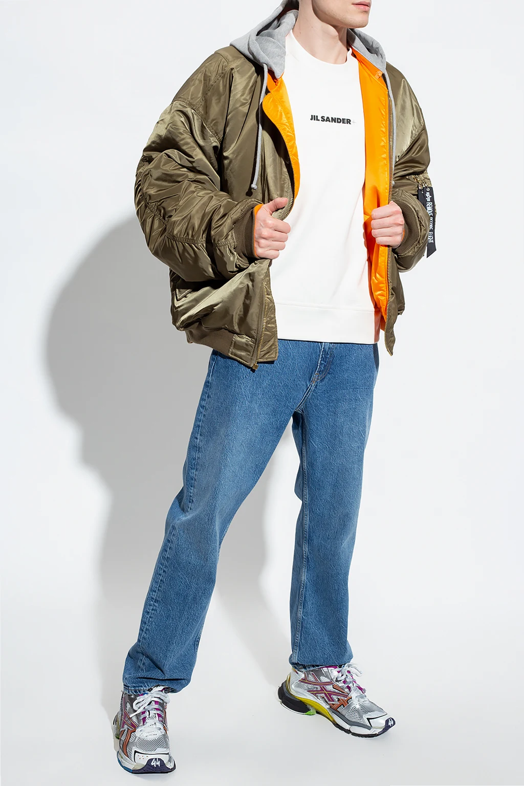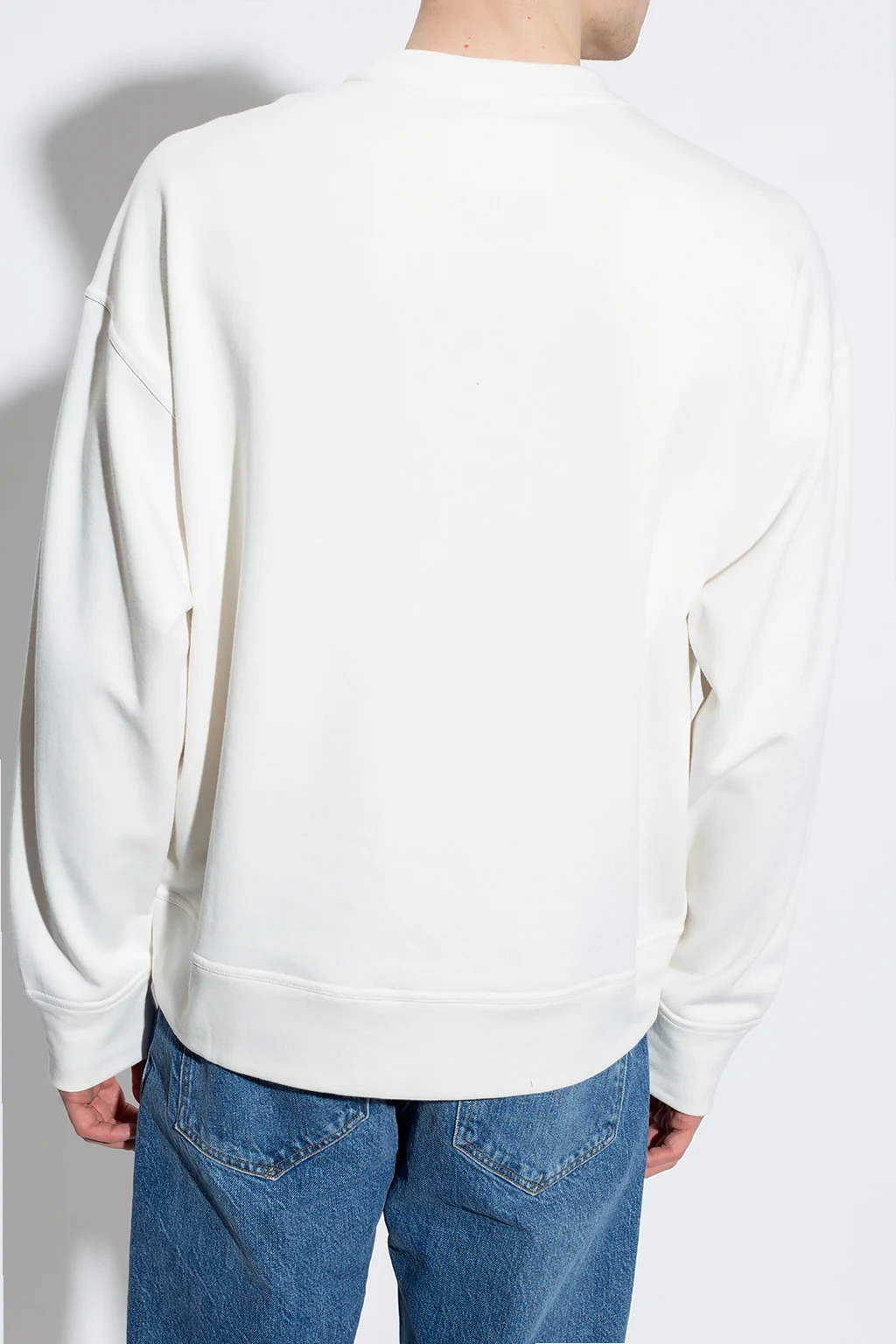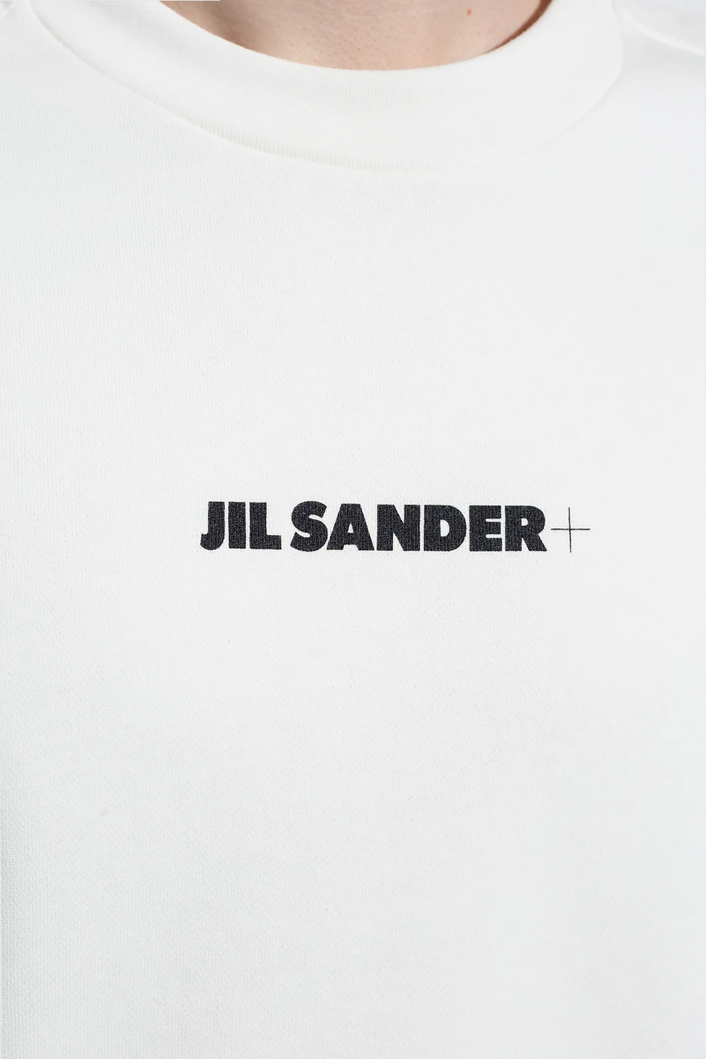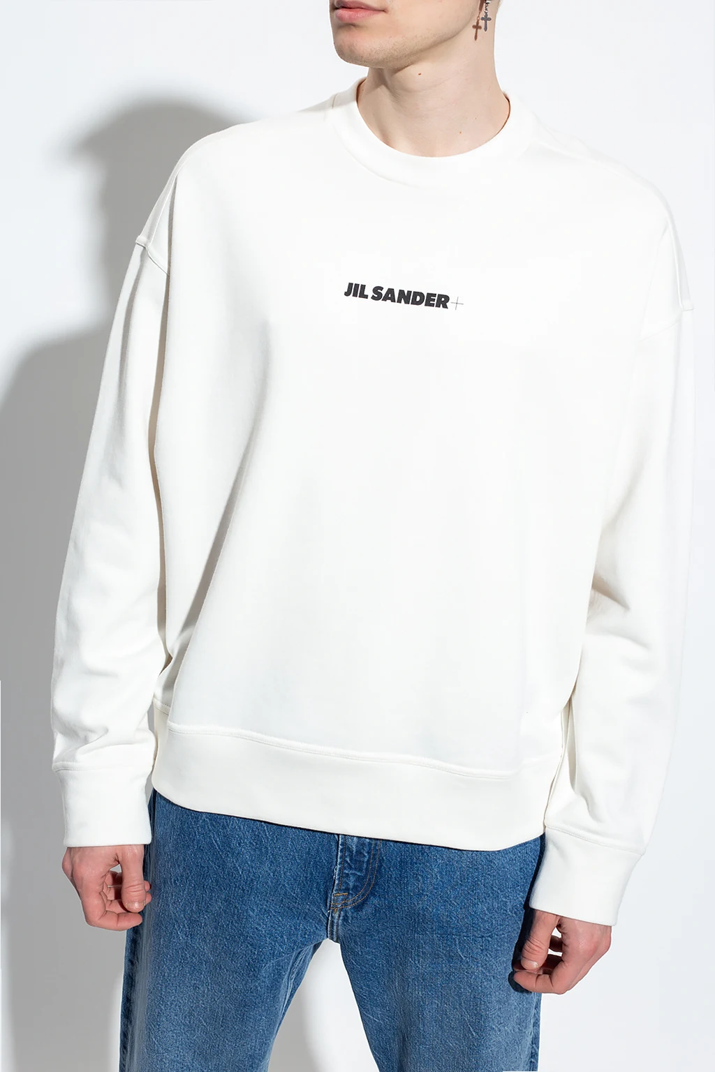 White crewneck sweatshirt from Jil Sander+. Made of cotton jersey, this style features a black graphic print with the brand's logo and elasticized trims on the collar, bottom hem and cuffs.