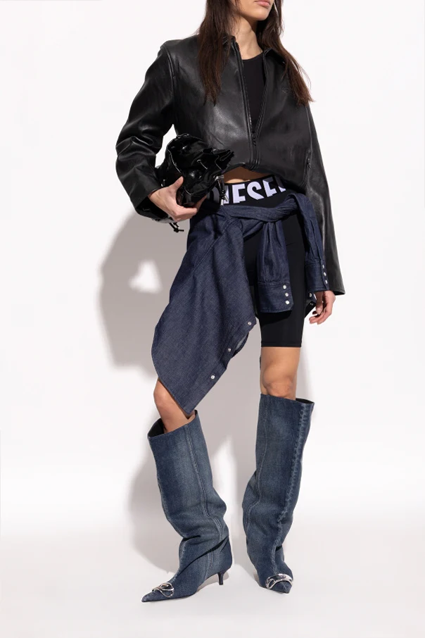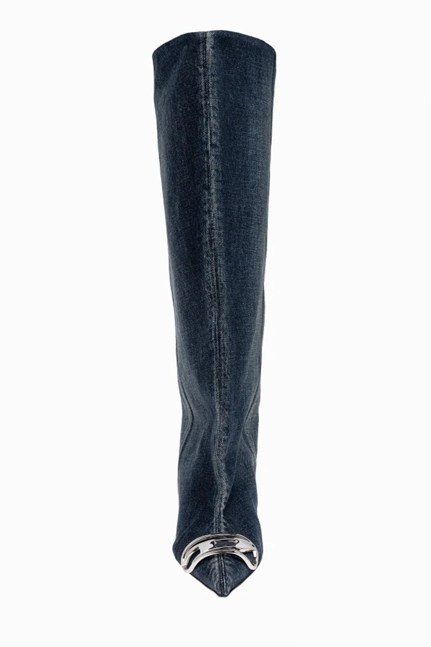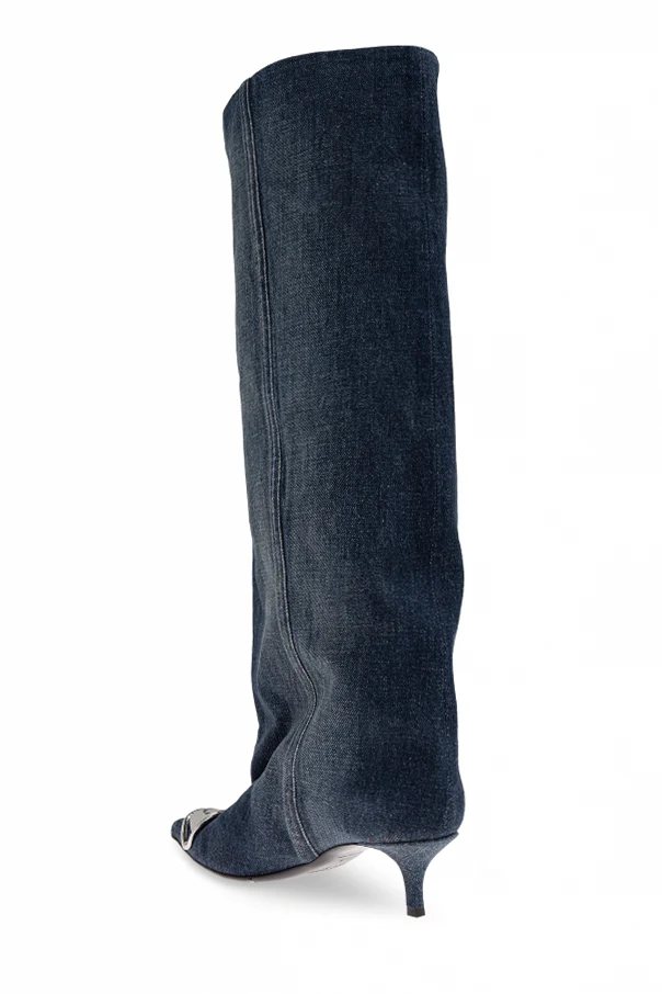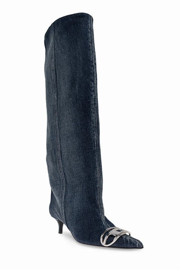 Experience unparalleled sophistication with the D-VENUS KB SLOUCHY knee-high boots by Diesel. Crafted from deep navy denim and lined with supple leather, these boots blend effortlessly modern design with timeless appeal. The relaxed, slouchy silhouette and pointed elongated toe exude a striking nonchalance, expertly complemented by a slender mid-heel for refined elevation.