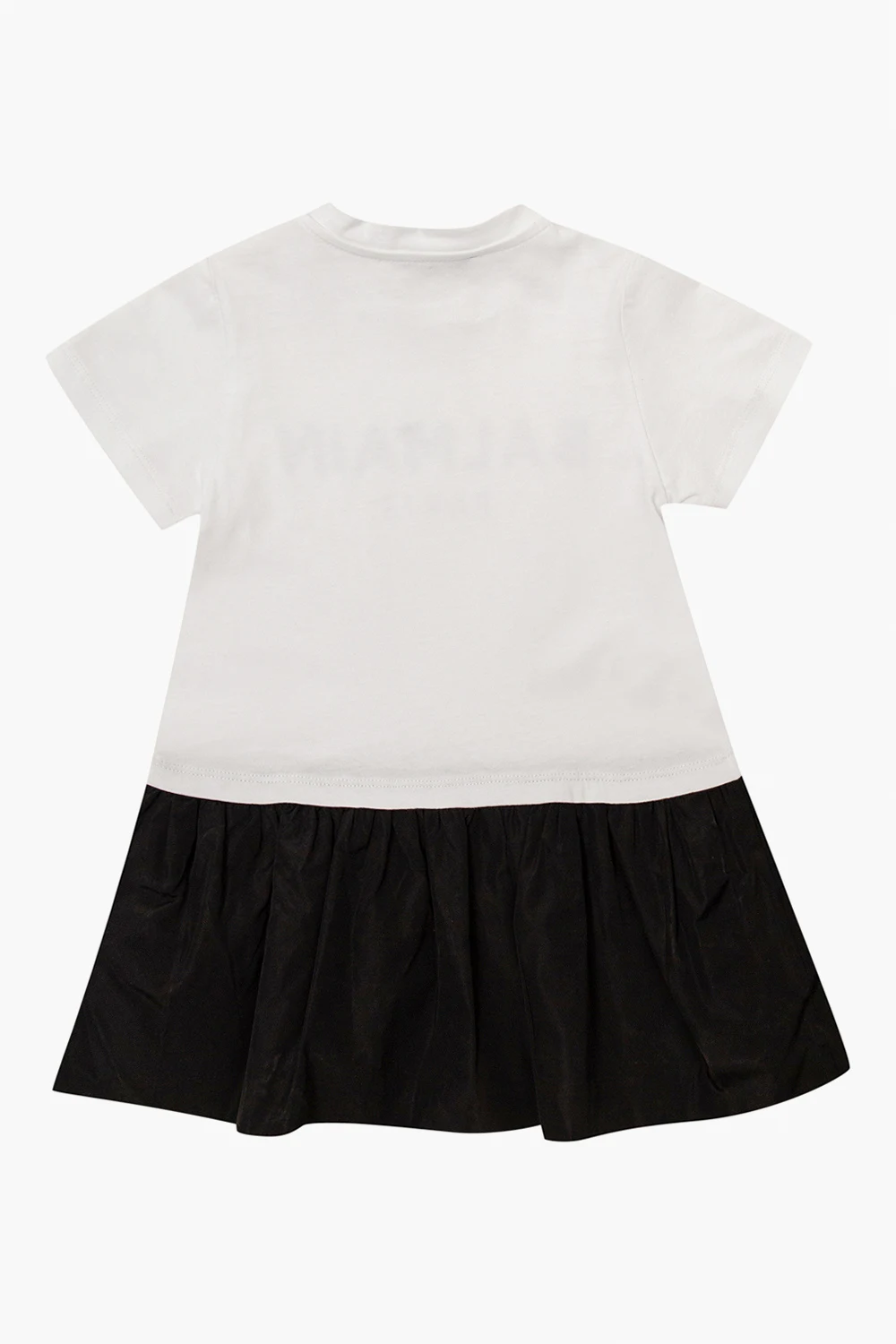 White and black dress from Balmain Kids. Fastened with snaps, this short sleeve design features a round neck, silver-tone appliqué and black ruffle hem.