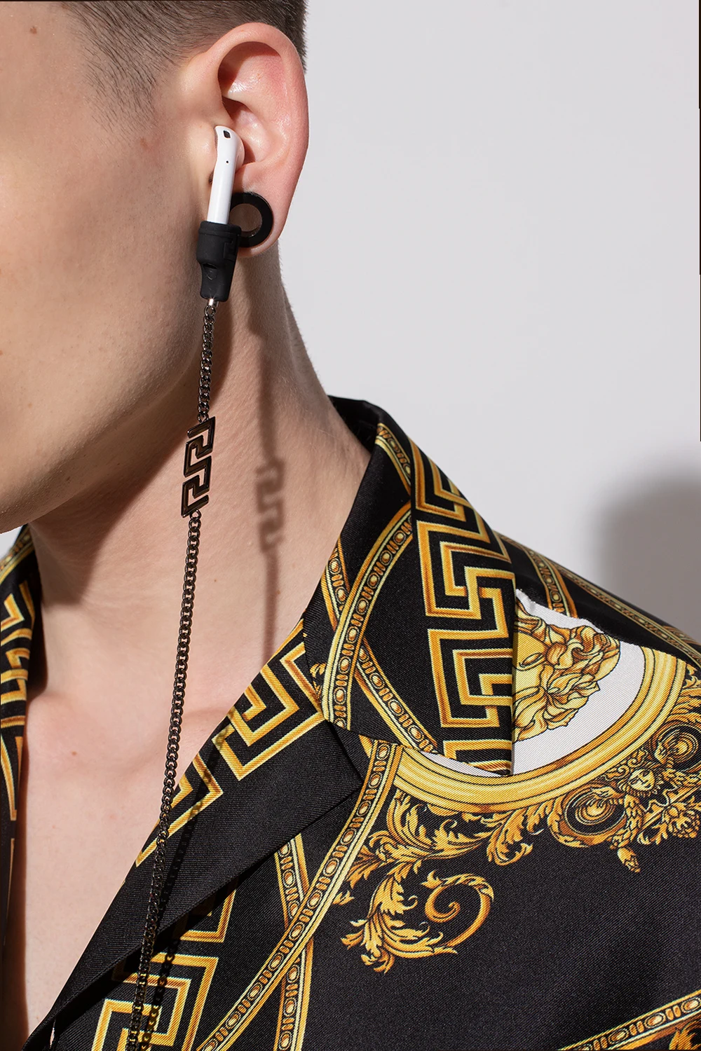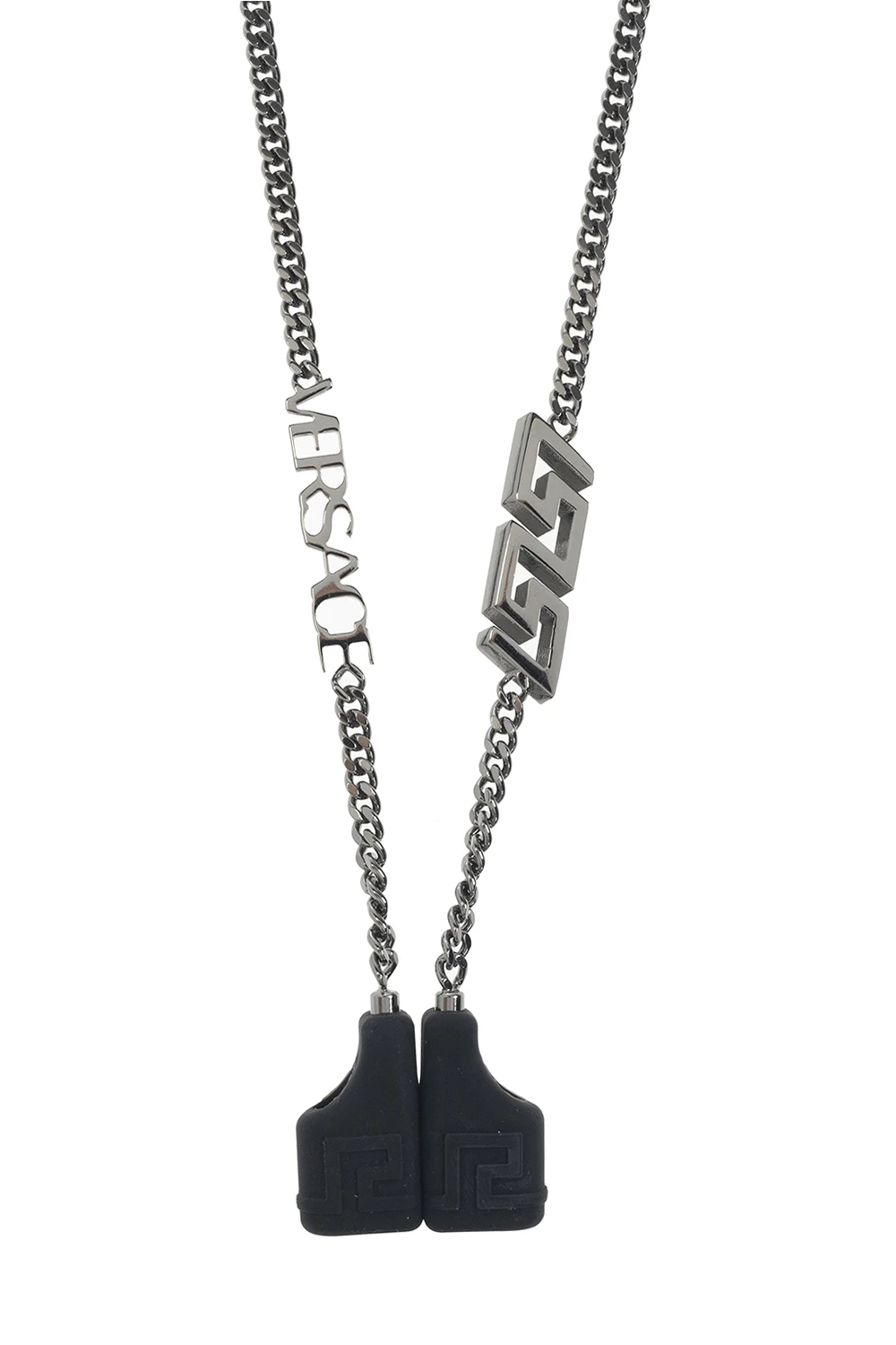 Silver-tone AirPods chain from Versace. It is decorated with a logo detail, the iconic Greek motif and magnetic silicone earphone holders.