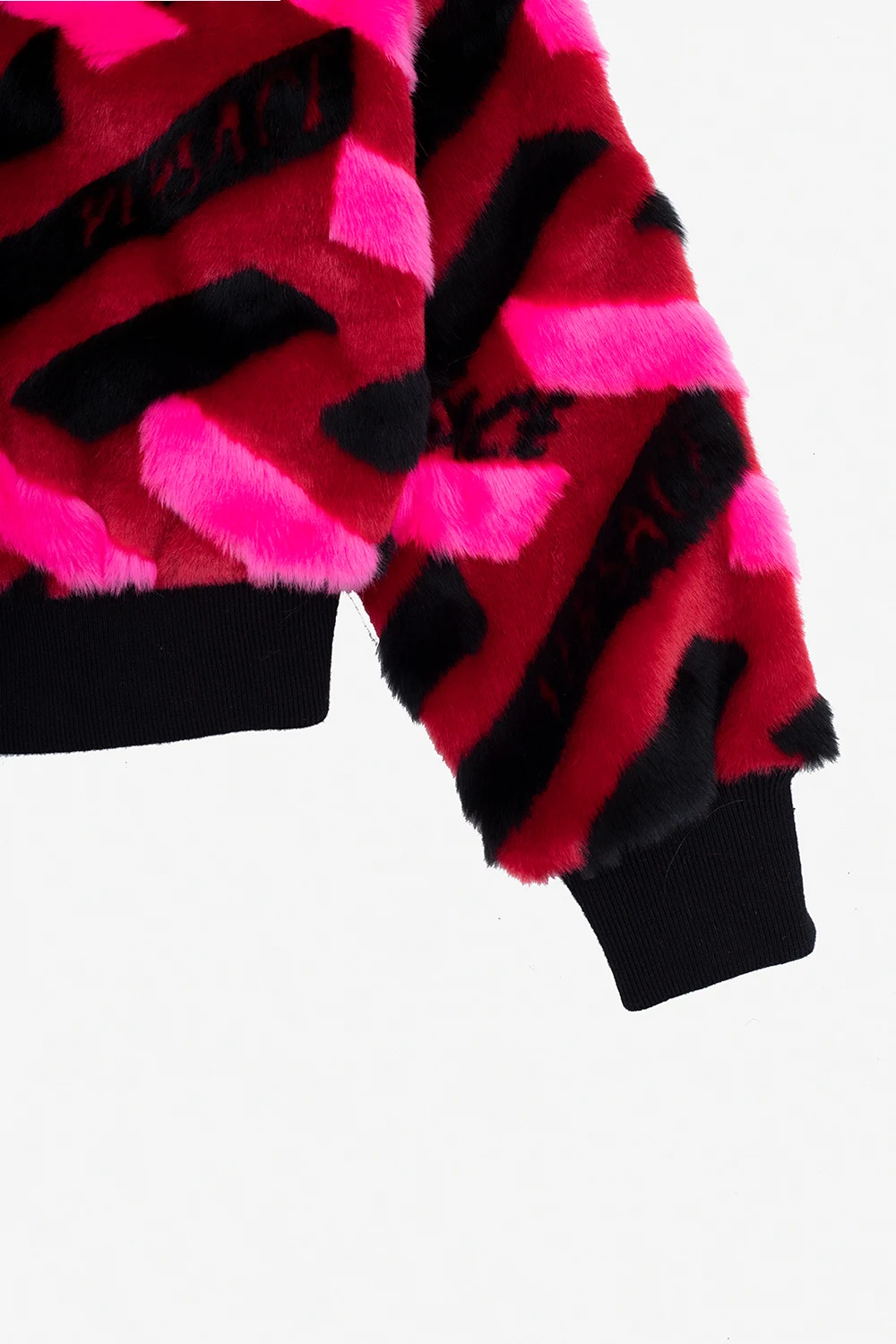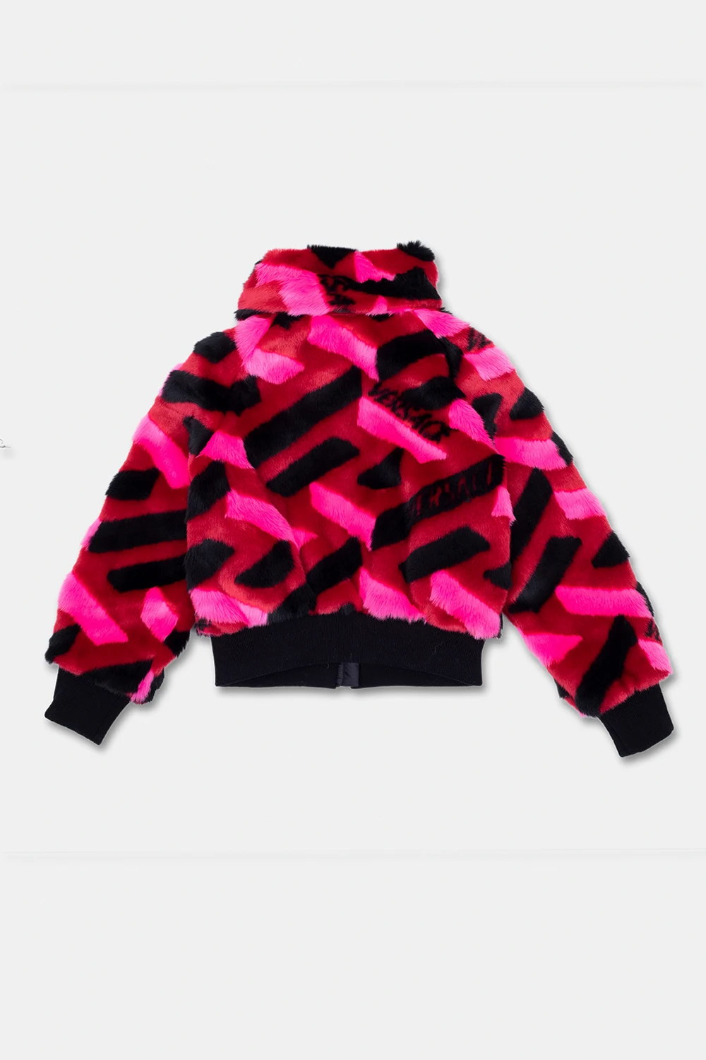 Black, red and pink jacket from Versace Kids. Made of faux fur, this garment features a zip fastening, La Greca pattern, two front pockets and ribbed trims at the hem and cuffs.