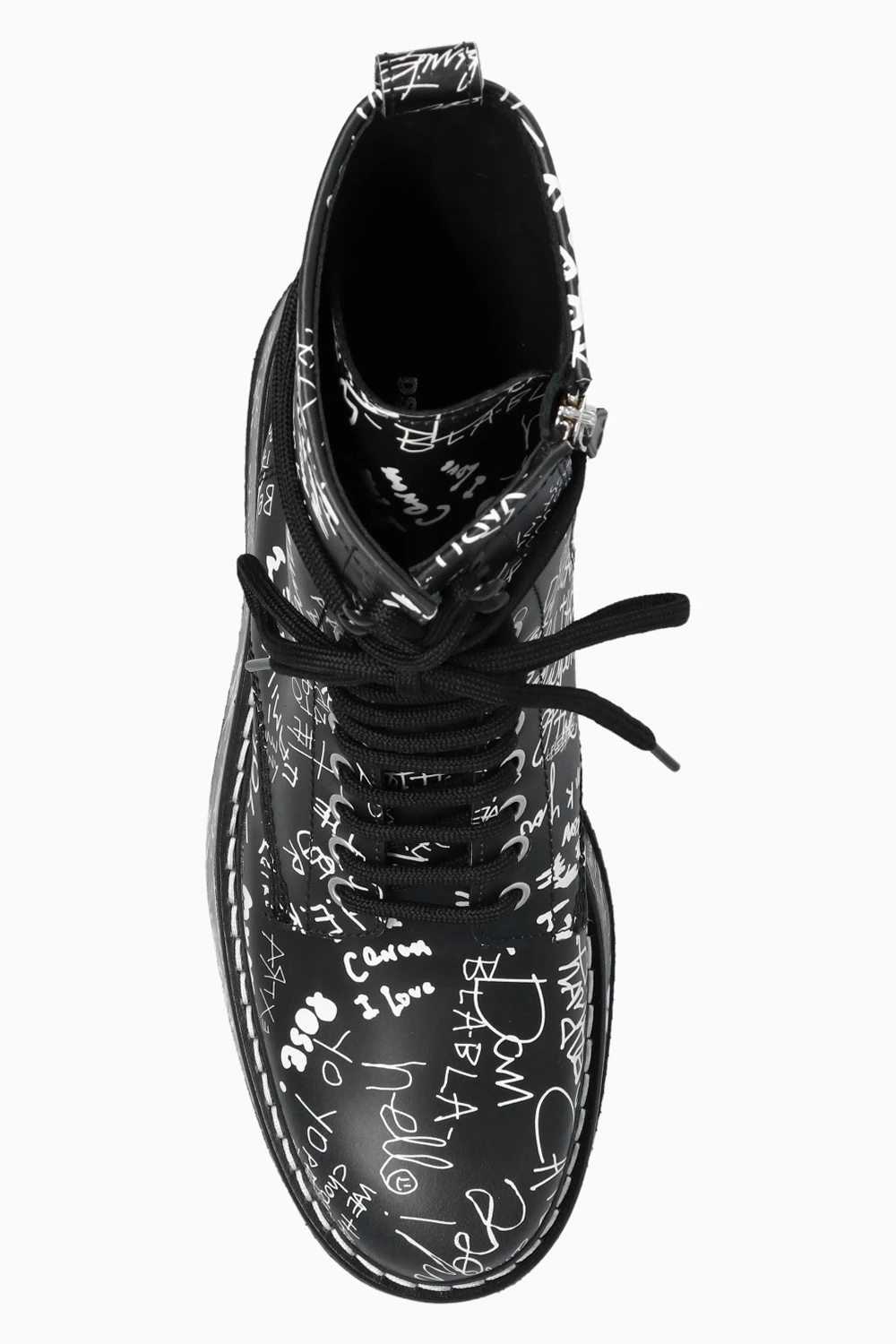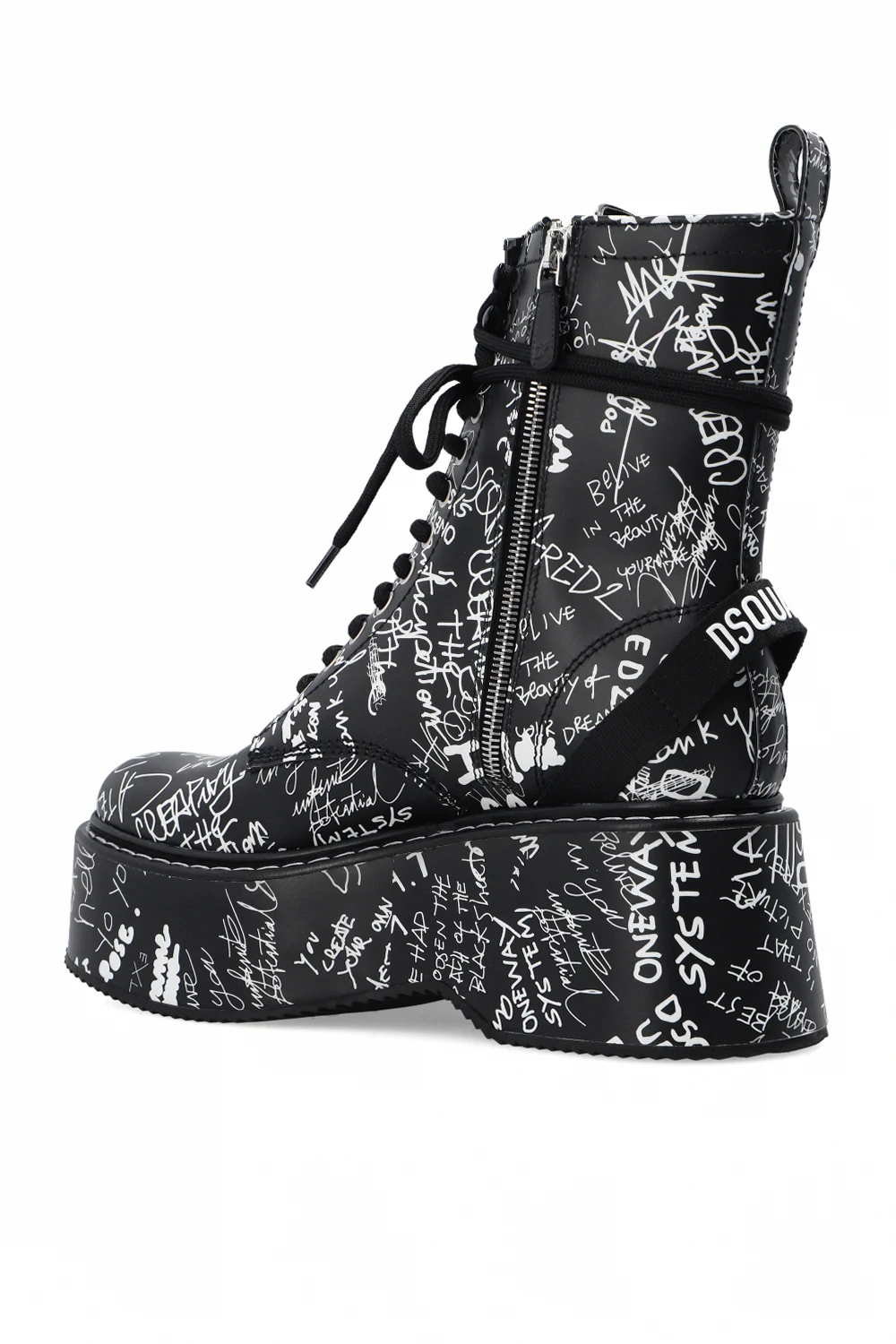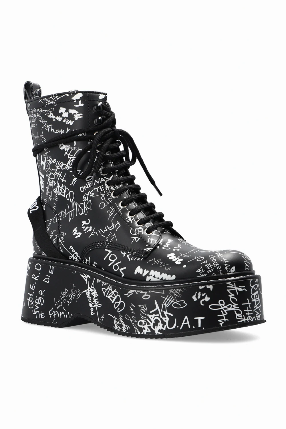 Black ‘Scribbles’ wedge ankle boots from Dsquared2. Crafted from leather, this lace-up model features a side zip closure, a white graphic print, a rear fabric insert with a tactile white logo and a black rubber sole at the base.