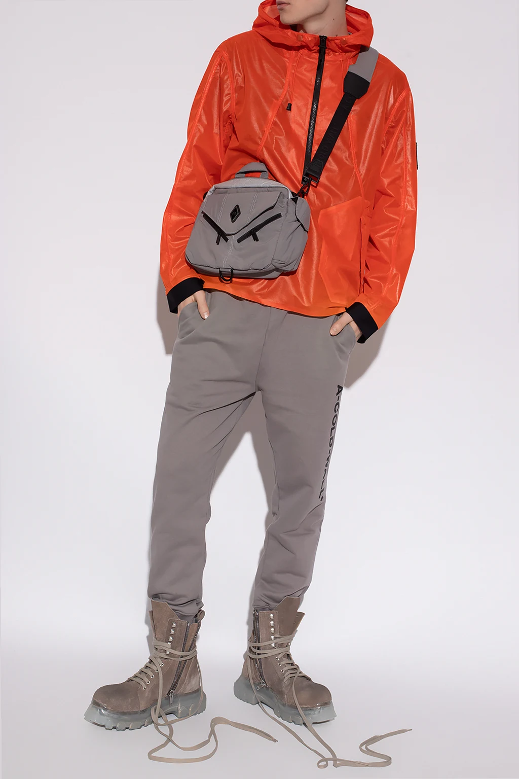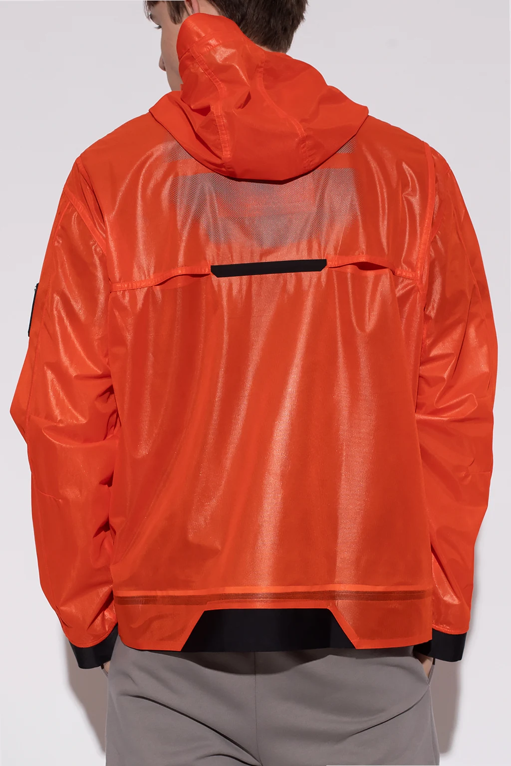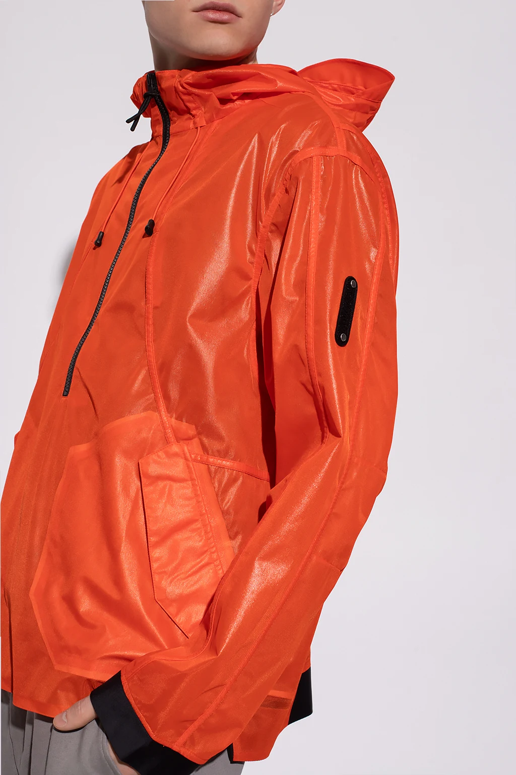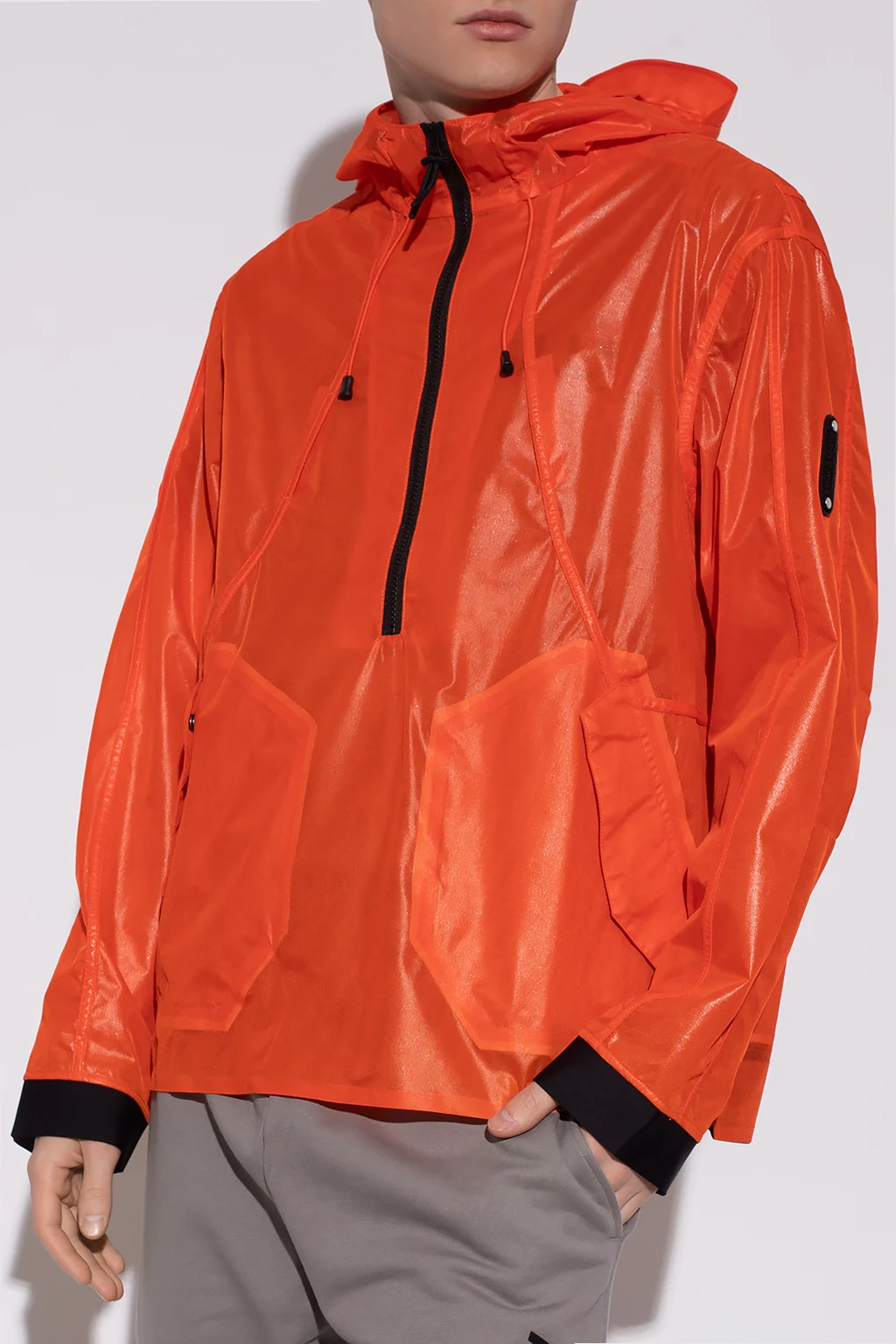 Orange jacket from A-COLD-WALL*. Fastened with a zip, this garment features a drawstring hood, white logo at the back, two snap-fastened pockets and long sleeves.