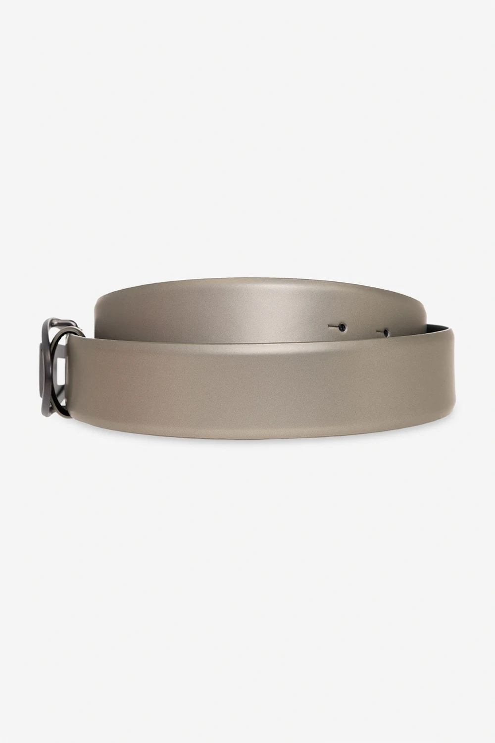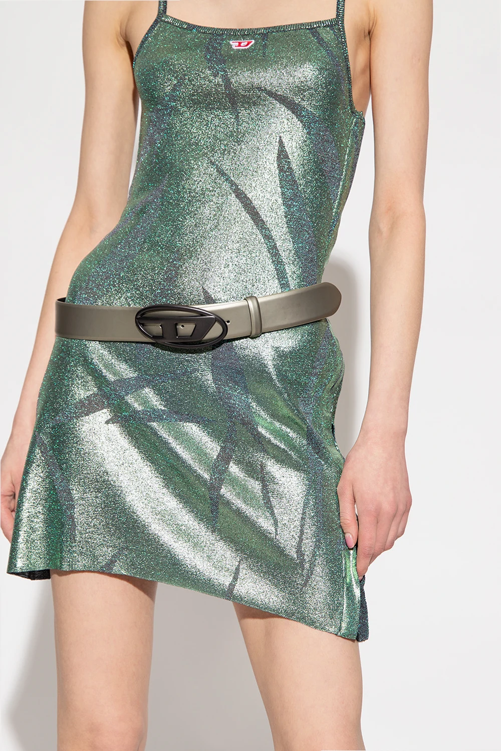 Beige and silver-tone belt with a metal logo buckle in black from Diesel. Made of leather.