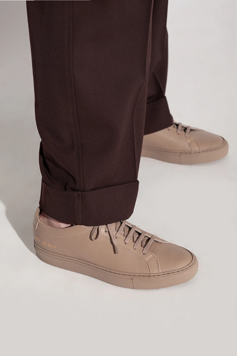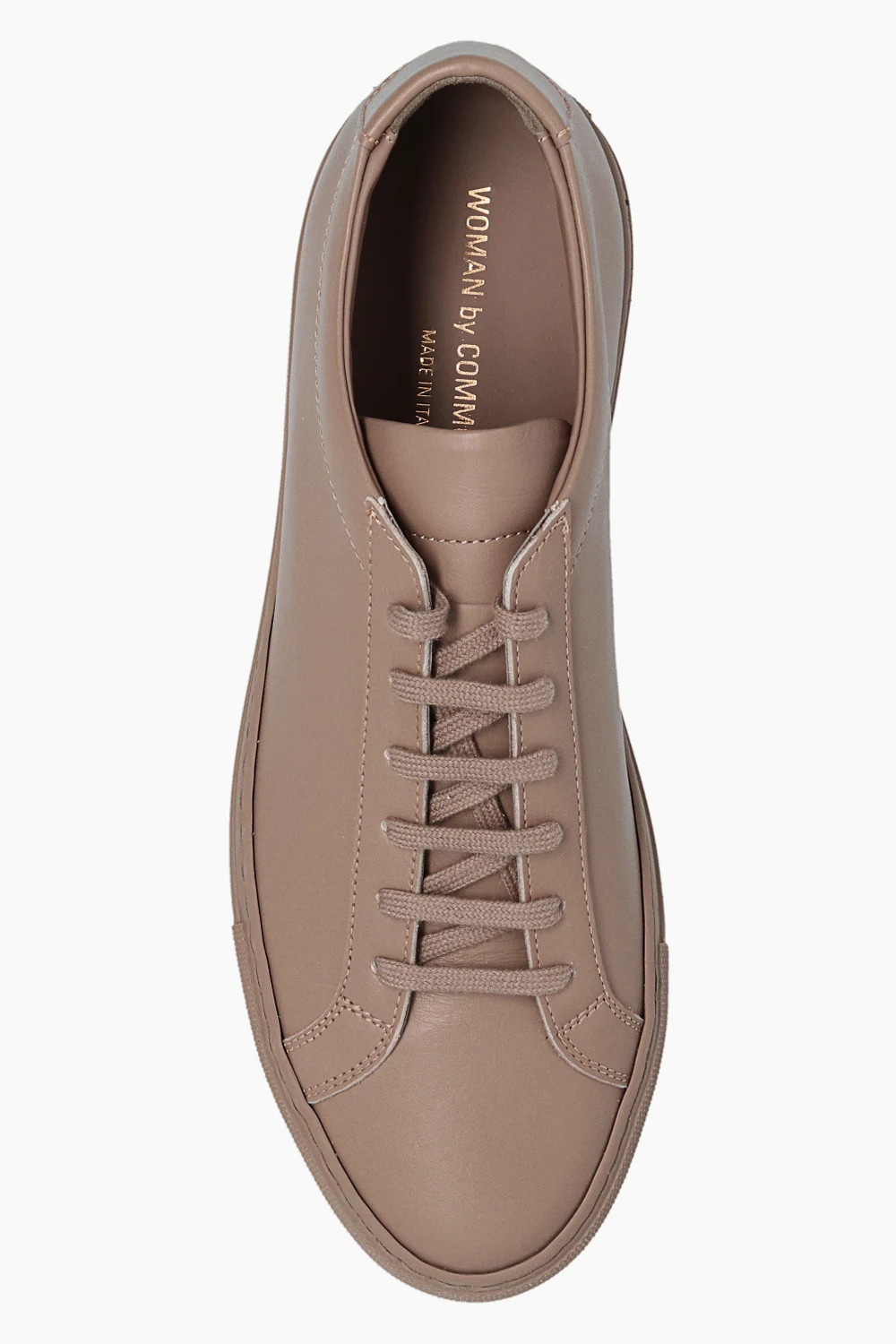 Light brown ‘Original Achilles Low’ sneakers from Common Projects. Made of leather, this lace-up pair features a gold-tone print, light brown rubber sole and swappable laces.