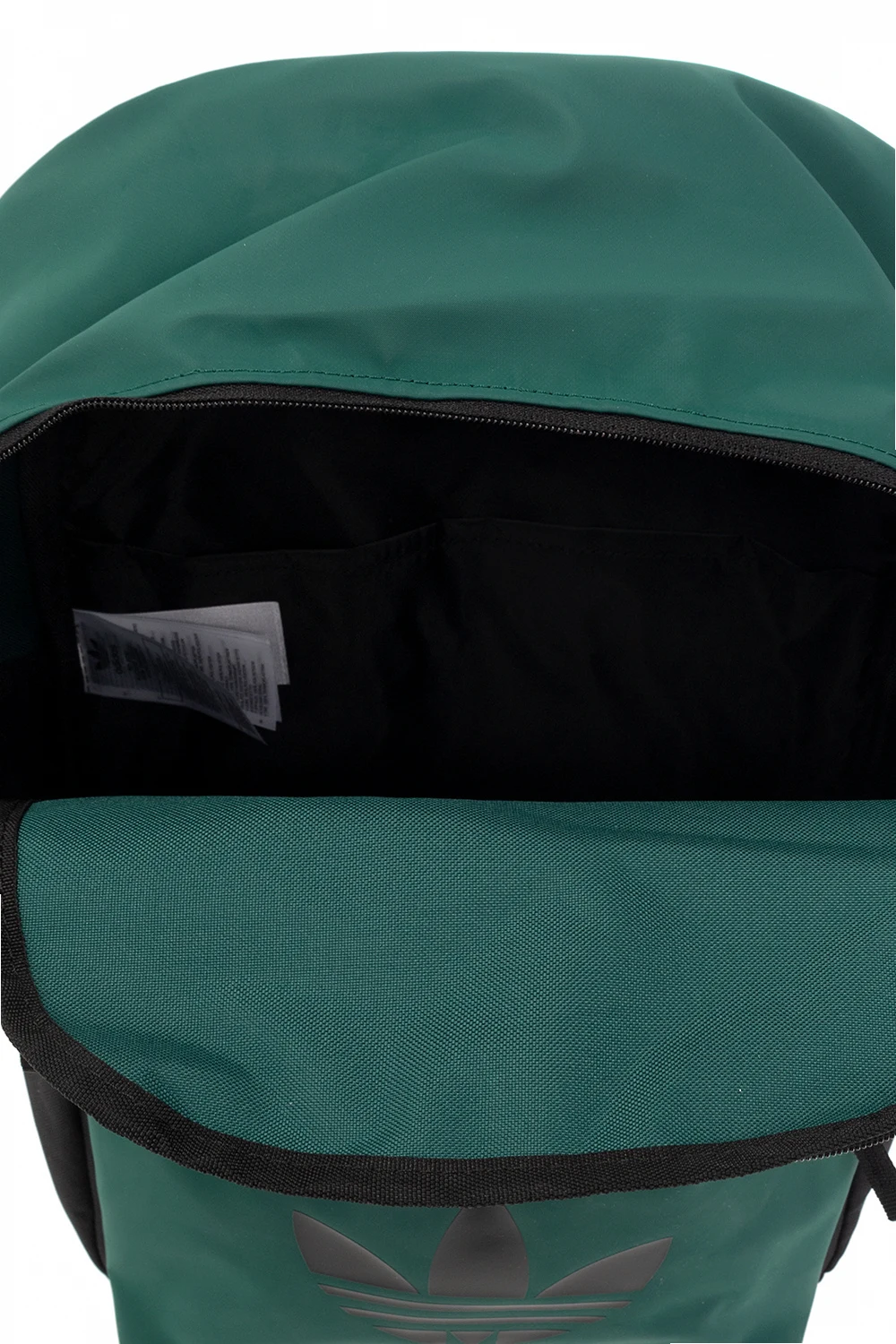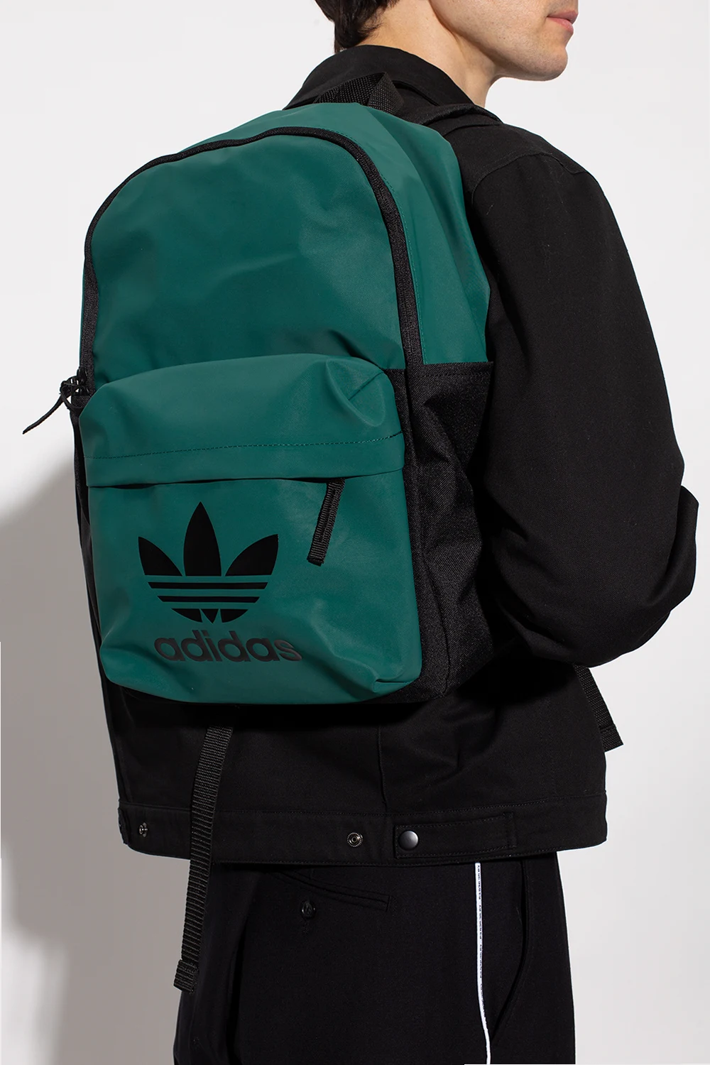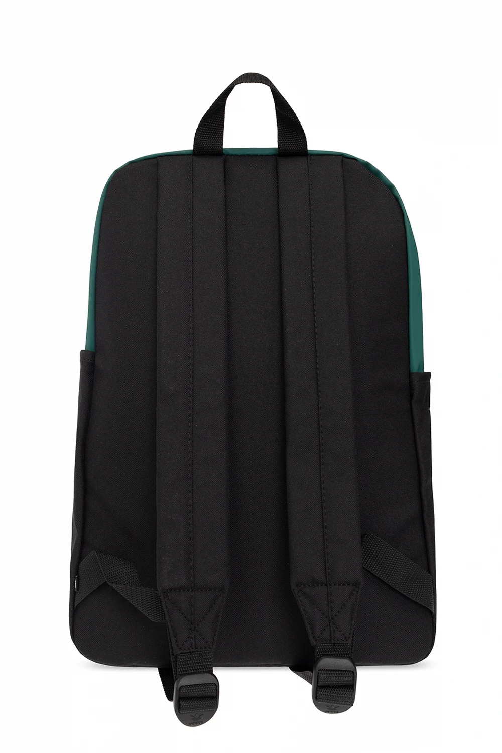 Dark green and black backpack from ADIDAS Originals, the ‘End Plastic Waste’ line. Crafted partially from recycled materials, this design offers waterproof properties. It fastens with a two-way zip and showcases an external pocket with a varnished Trefoil logo print on the front, two slip pockets on the sides, a top handle, adjustable shoulder straps and one internal compartment with a slip pocket.
