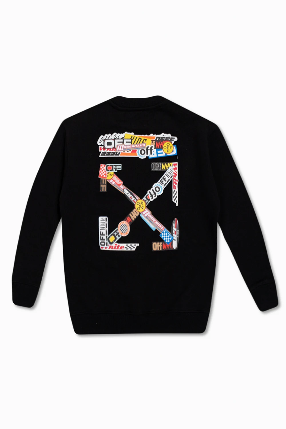 Black crewneck sweatshirt from Off-White Kids. Made of cotton, this long sleeve design is decorated with a multicolored logo print and ribbed trims at the hem and cuffs.
