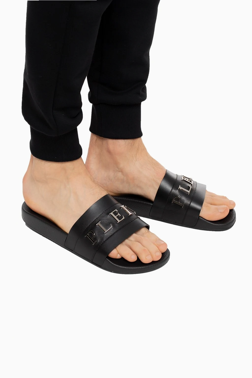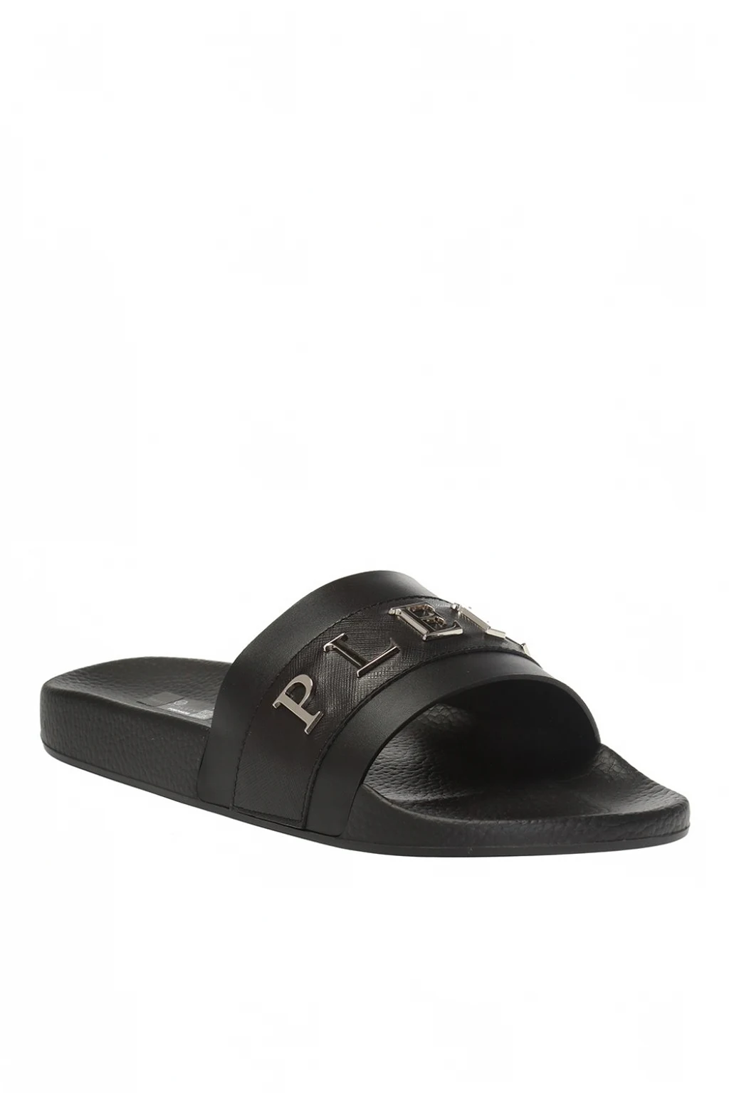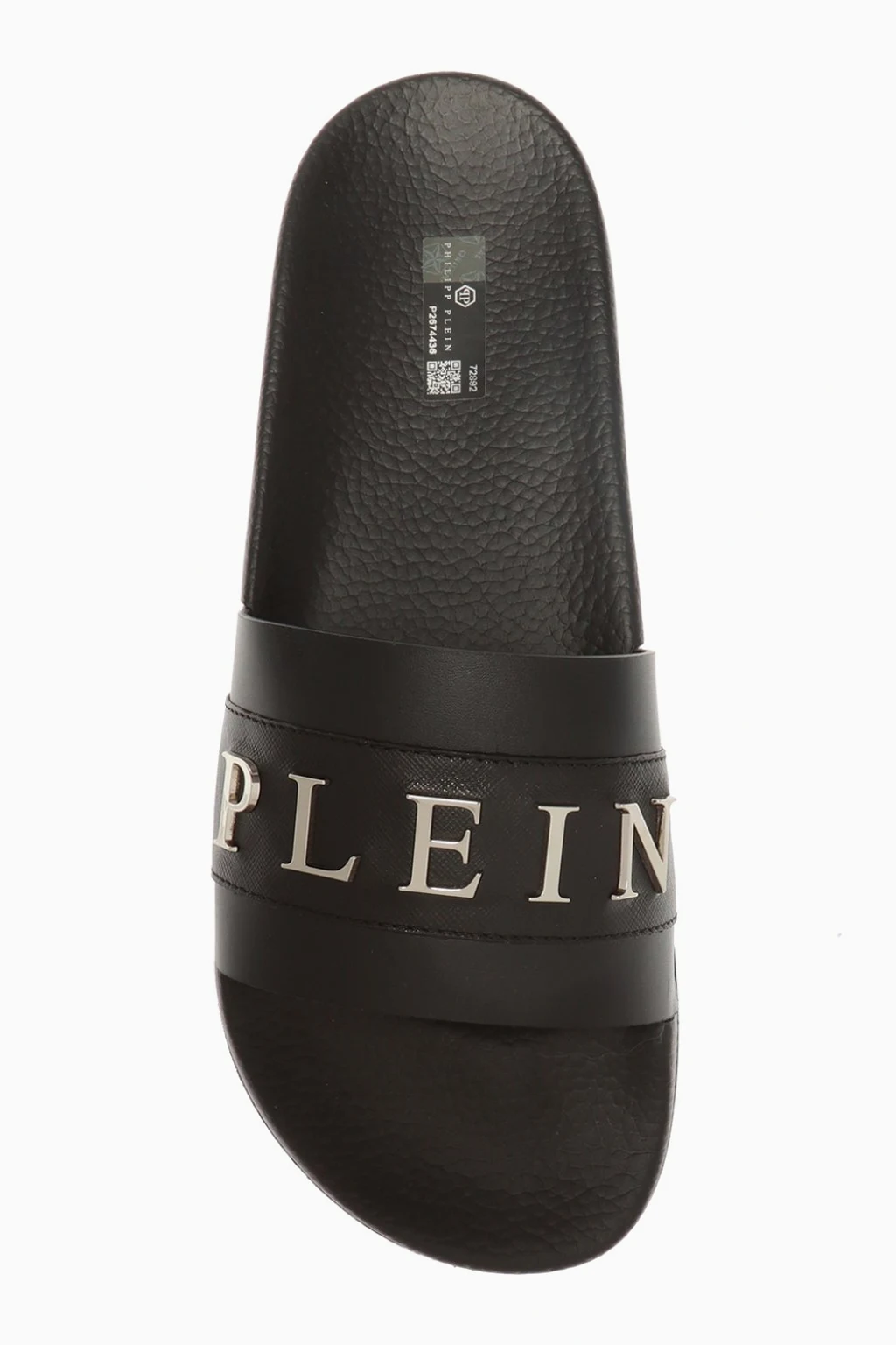 Black slides from Philipp Plein. Finished with leather. Decorated with a silver-tone metal logo. Black rubber sole.