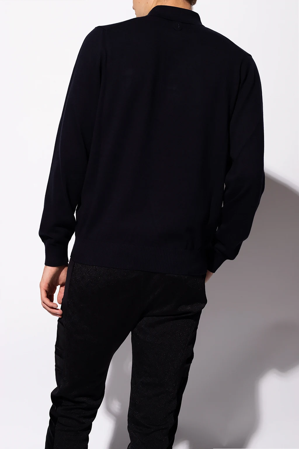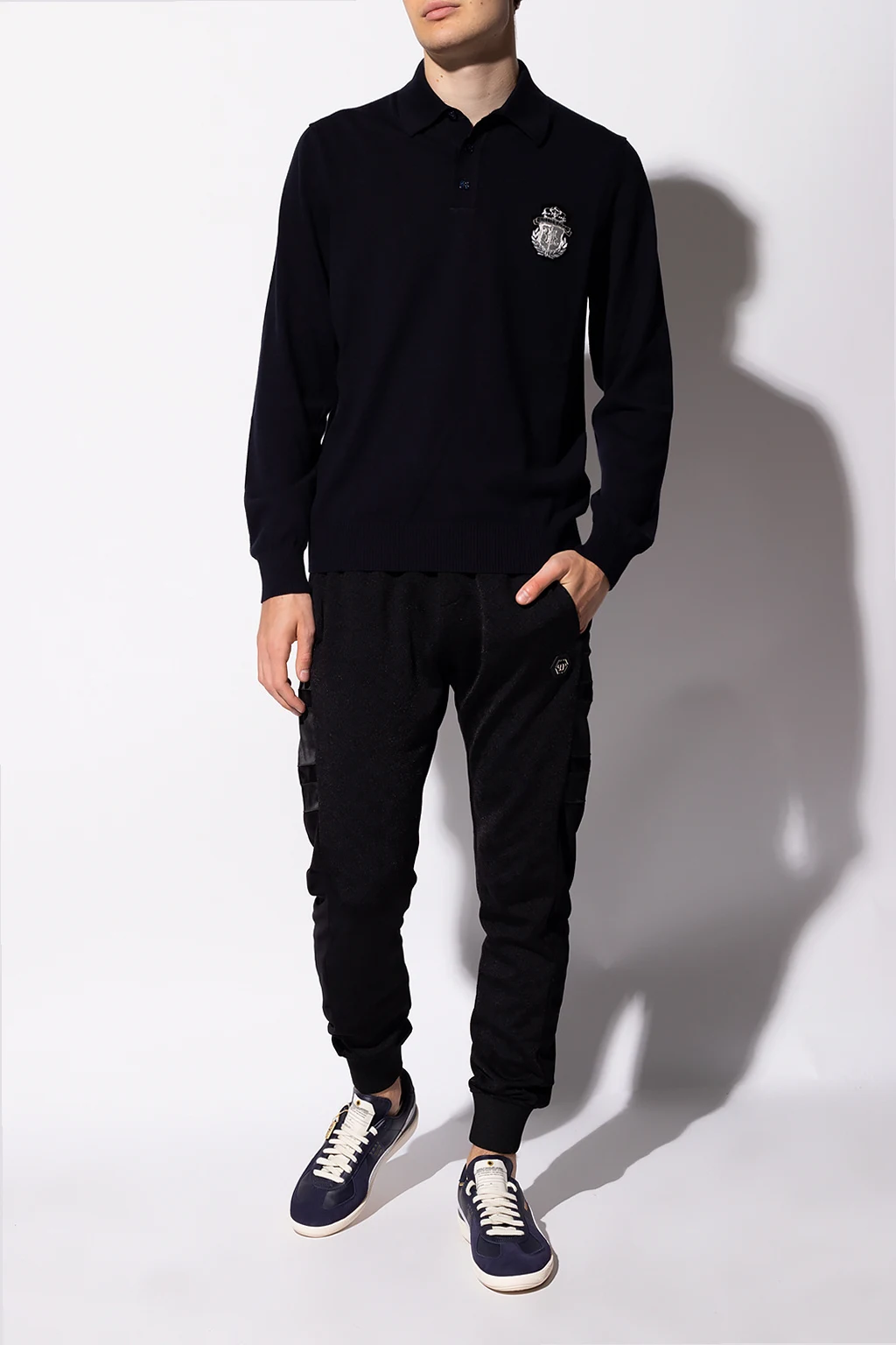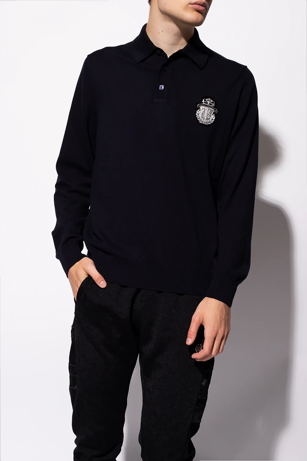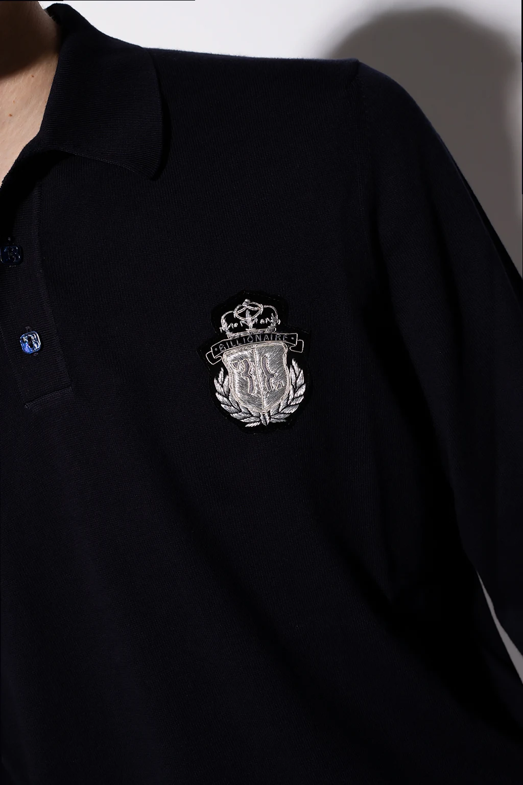 Navy blue polo shirt from Billionaire. Crafted from cotton, this style showcases a silver-tone and black logo patch and an elasticated hemline.