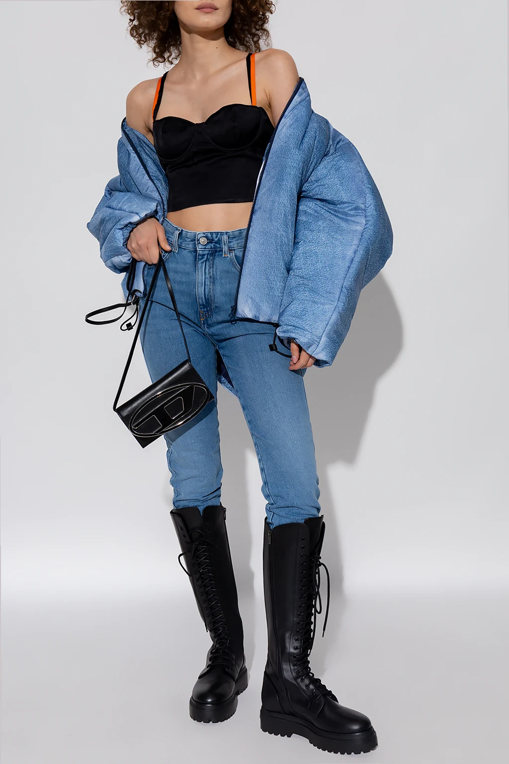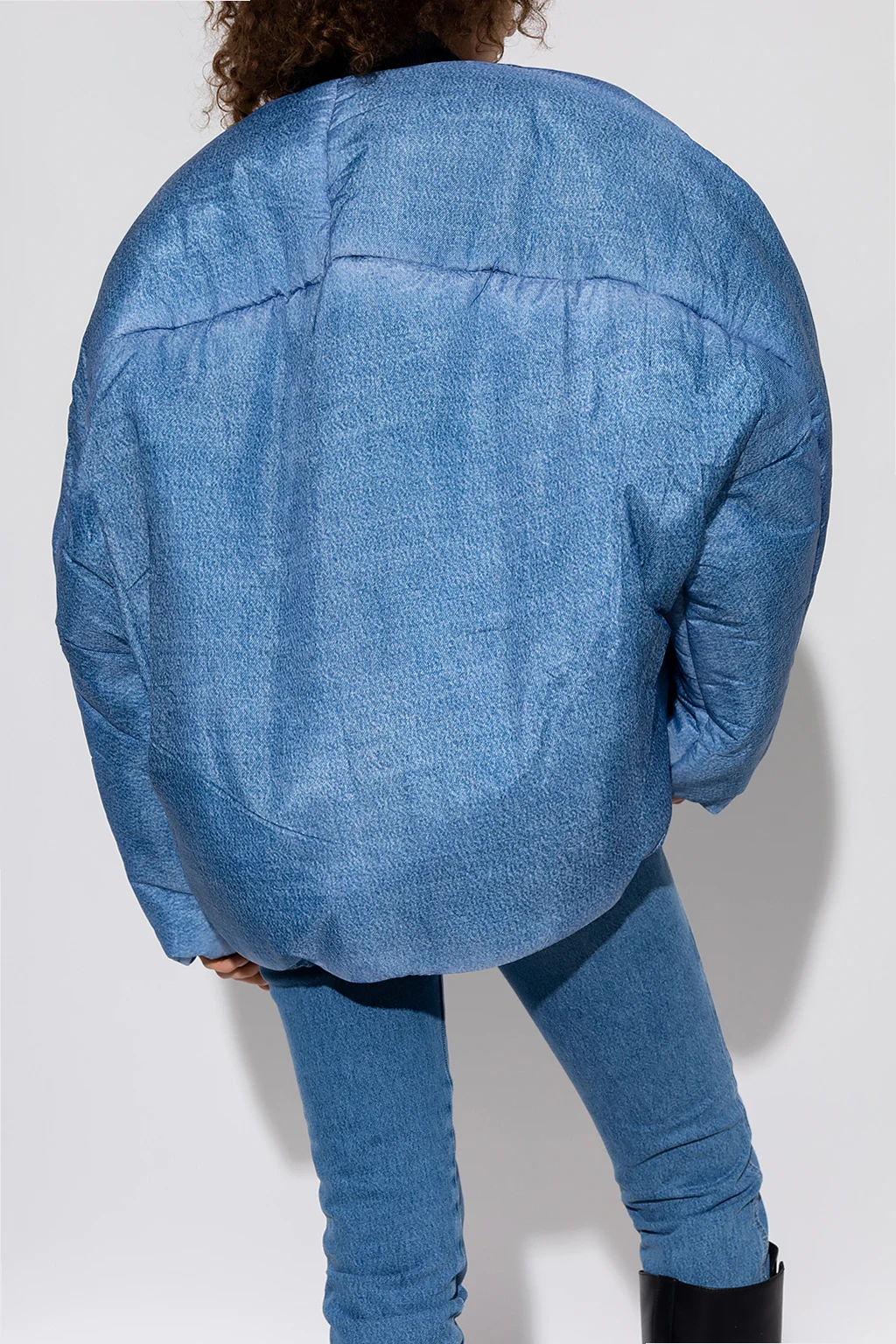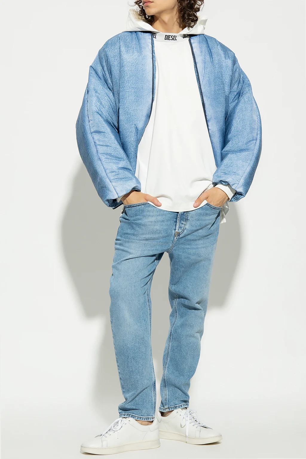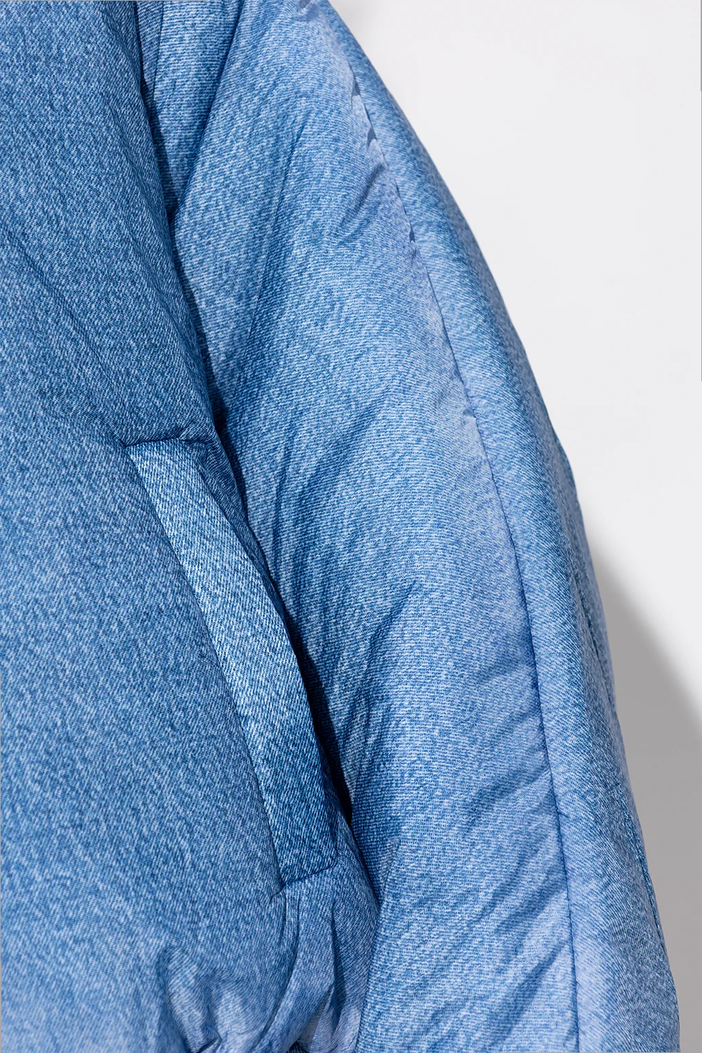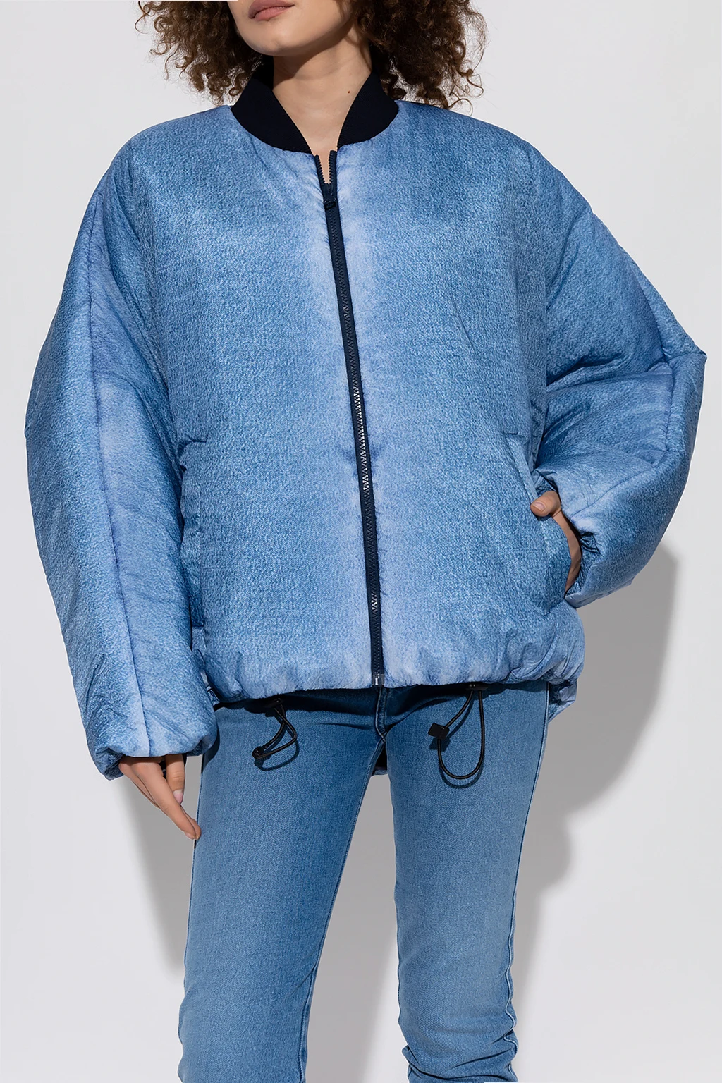 Blue ‘W-DAY-PRINT’ puffer jacket from Diesel. Crafted with padded shell that's digitally printed to imitate washed blue denim, this style features a zip fastening, two snap-fastened pockets, ribbed collar, wide sleeves and a drawcord-adjustable hem.