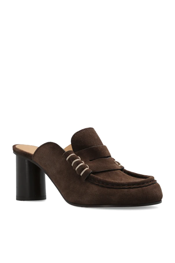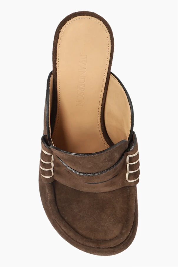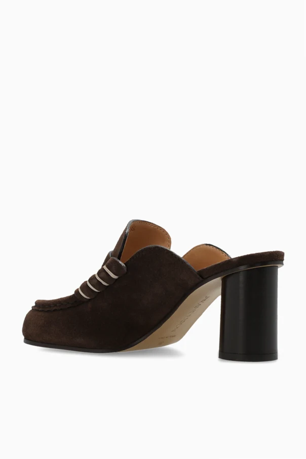 Experience the refined artistry of JW Anderson with these exquisite leather heeled mules in timeless black. Constructed from supple suede leather with a smooth leather interior and sole, each pair exemplifies unparalleled craftsmanship and a luxurious tactile experience. The contemporary silhouette features a medium block heel, an enclosed, substantial front, and an elegant open-back, seamlessly embracing modern femininity and masculine accents within a minimalist mule-loafer profile.