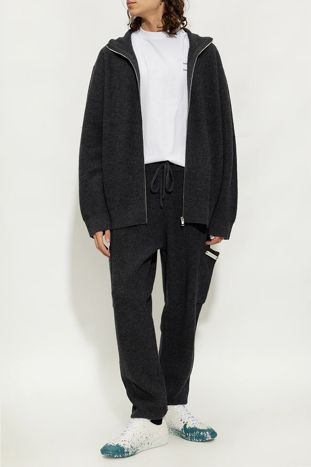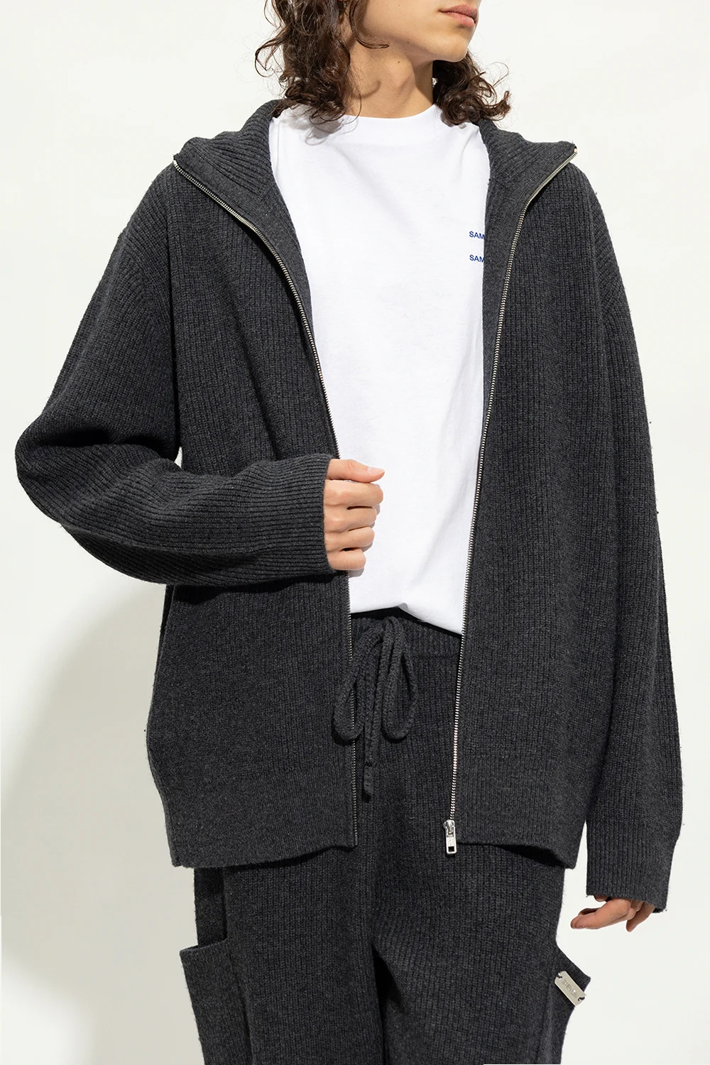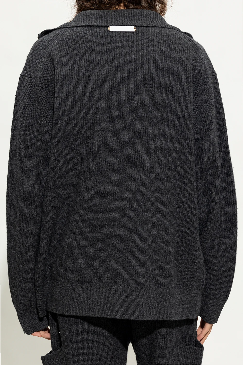 Dark grey cardigan from Helmut Lang. Crafted from wool, this style features a collar, a zip fastening, two frontal pockets, long sleeves and a logo-engraved plaque at the back.