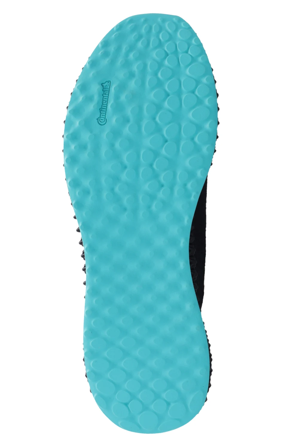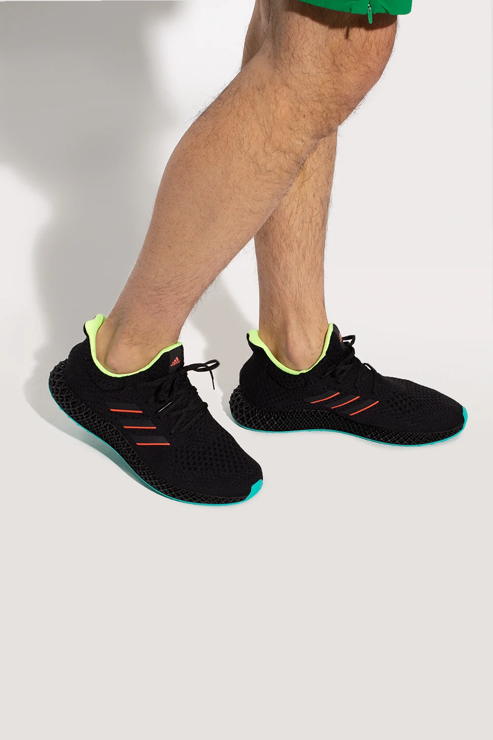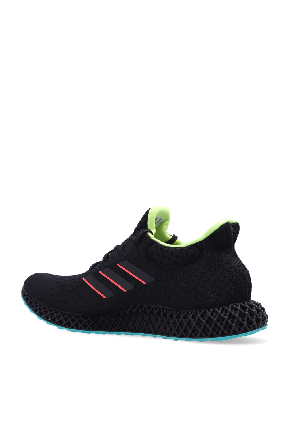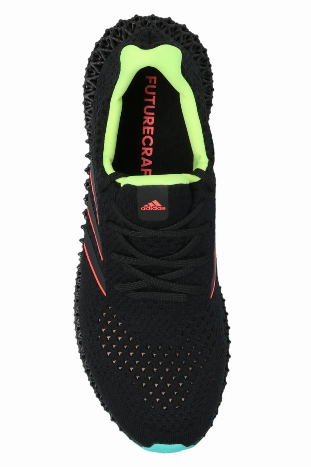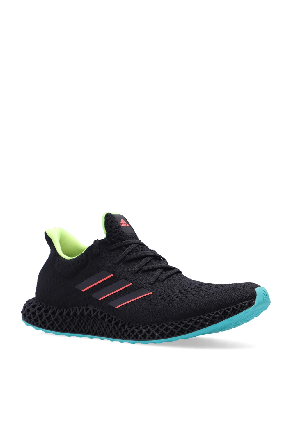 Black ‘4D Futurecraft’ running shoes from ADIDAS Performance, the ‘End Plastic Waste’ line. Crafted partially from recycled materials, this lace-up model features a PRIMEKNIT upper to ensure proper fit, a logo appliqué on the tongue, the brand's signature black and orange three stripes on the sides, a 4DFWD midsole, which absorbs impact and translates vertical impact forces from a runner’s downward step into forward momentum, and a blueish-green Continental™ rubber outsole.