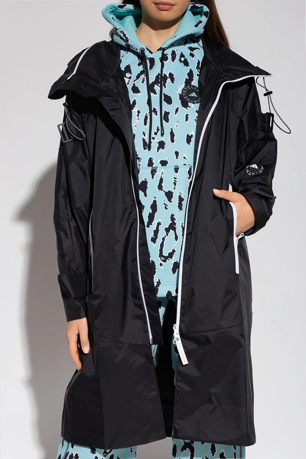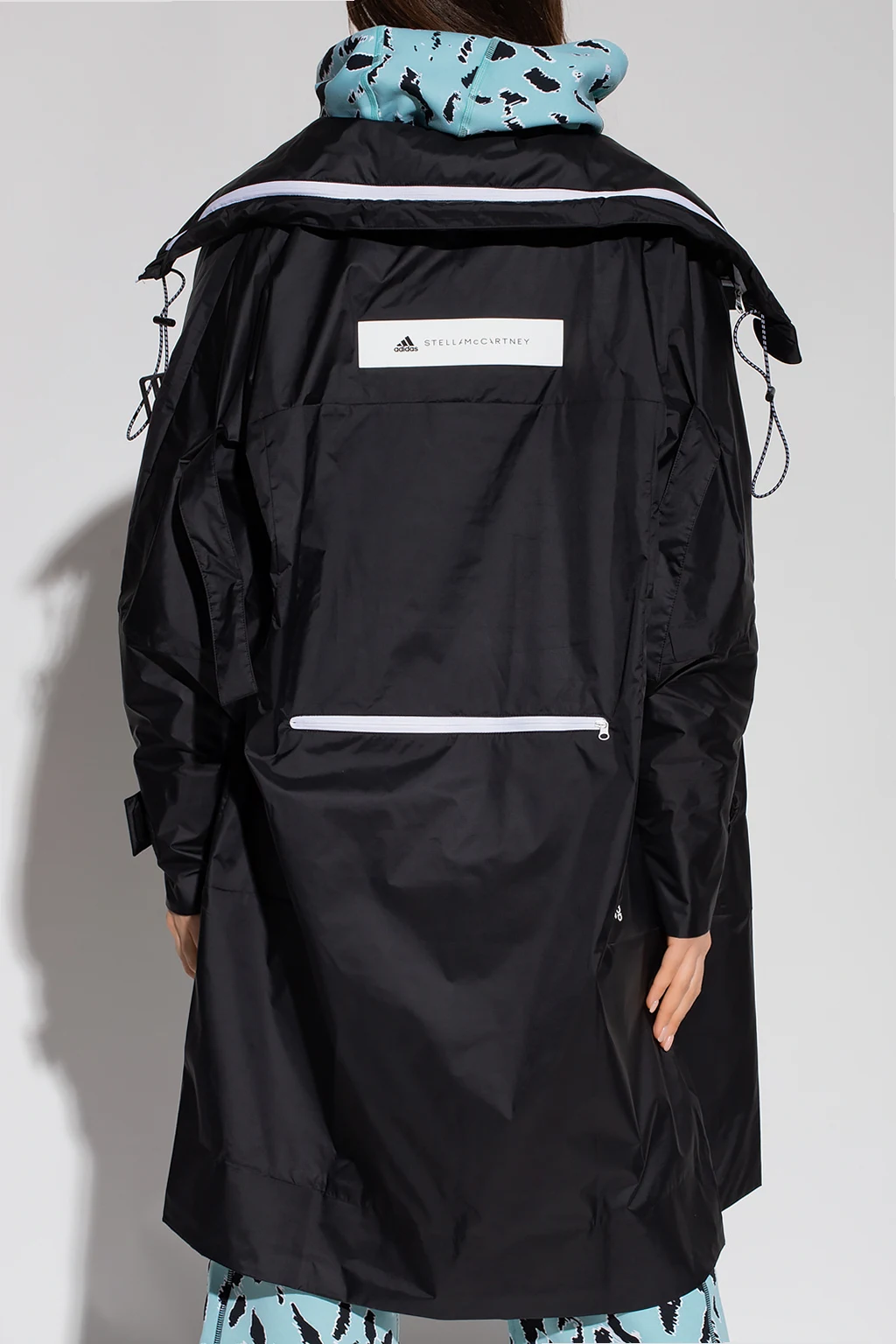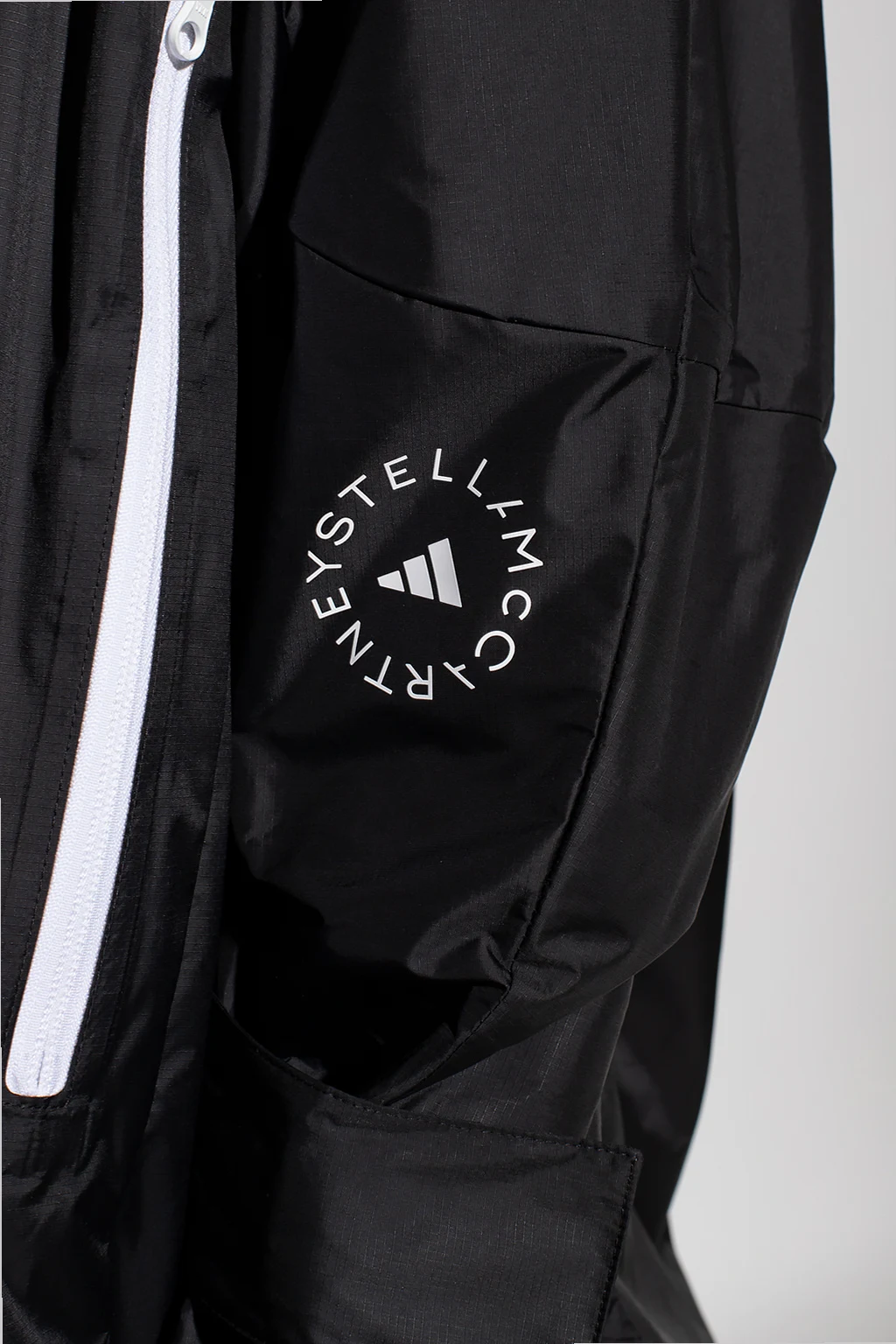 Black and white parka from ADIDAS by Stella McCartney. Crafted from 100% recycled polyester, this style features a two-way zip fastening, a hood hidden in the collar, a white logo print, three zip pockets (two on the front and one at the back), long sleeves with buckle straps and a white logo application at the back. This model is equipped with WIND.RDY technology to keep you dry comfort and protection from head to toe.