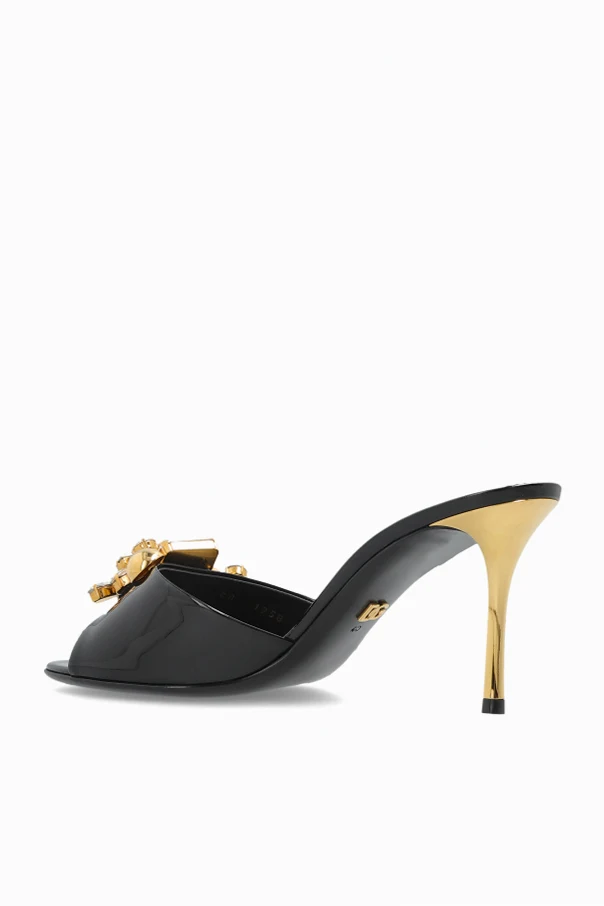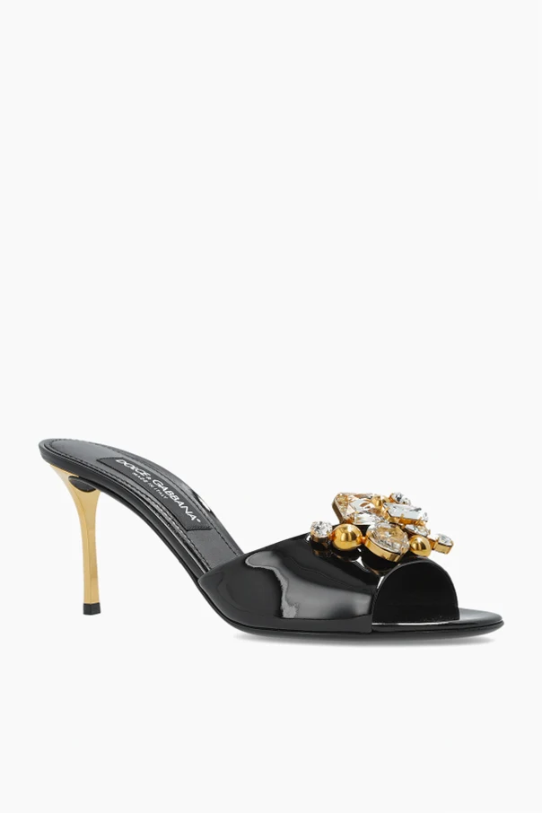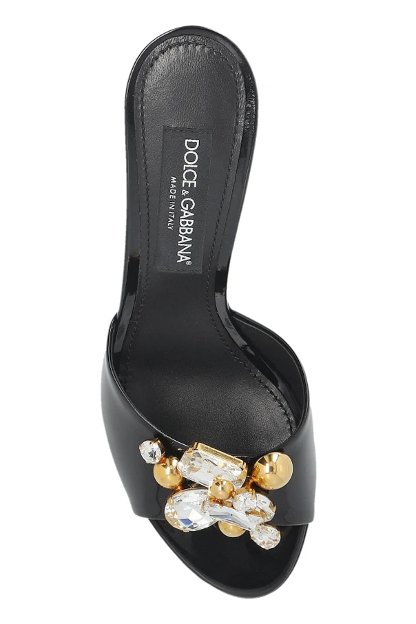 Immerse yourself in the refined allure of these black stiletto-heeled mules by Dolce & Gabbana . Handcrafted from lustrous, high-shine leather, their sleek silhouette is accentuated by an open toe and a timeless, sculpted cut. The classic black hue forms a perfect backdrop for the luxurious embellishment—a striking composition of oversized crystals and radiant, golden spheres adorning the front strap—bestowing an unmistakable aura of opulence.