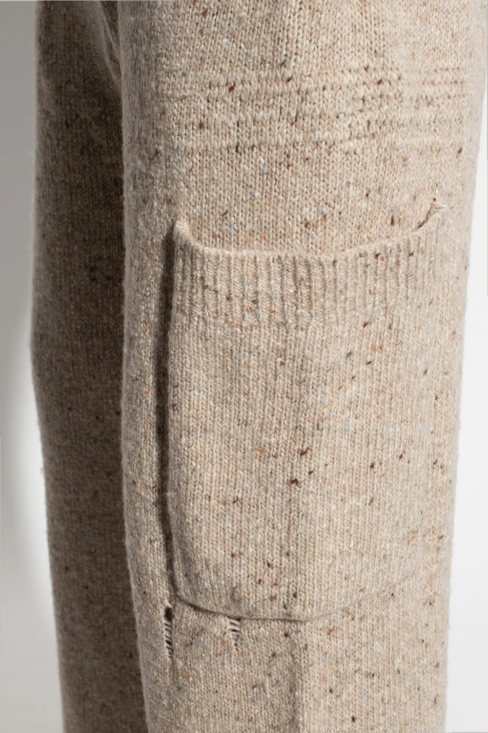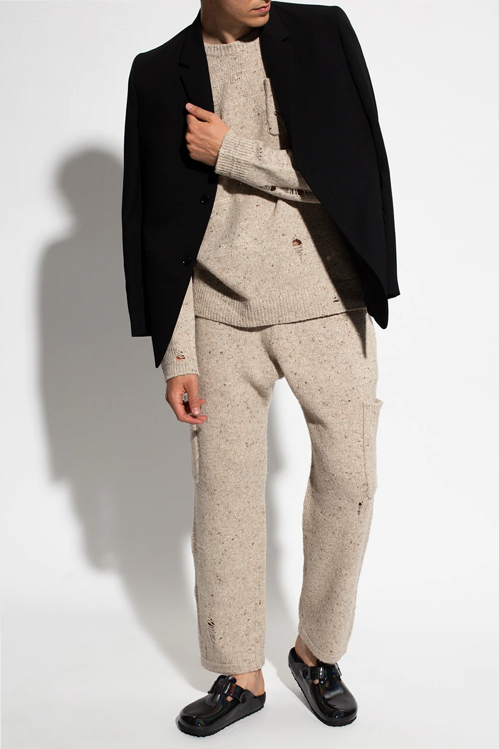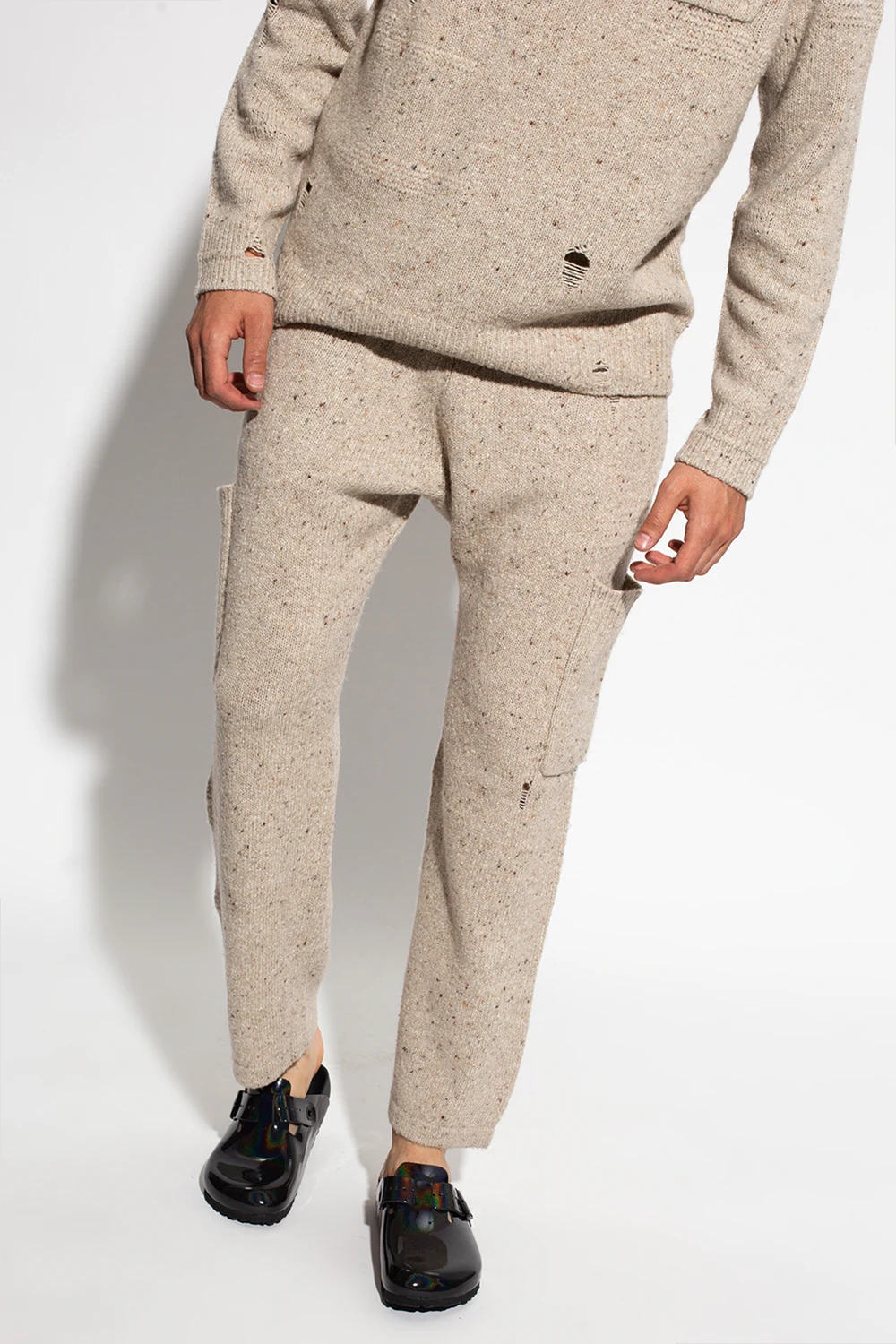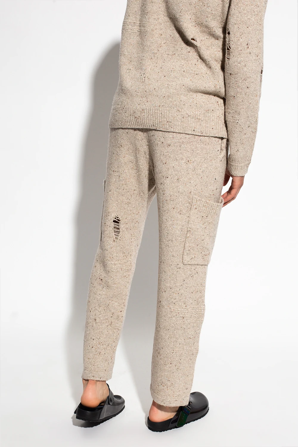 Beige and grey woven trousers with holes from Helmut Lang. Fastened with drawstrings, this pair falls down with straight legs and is complete with side pockets.
