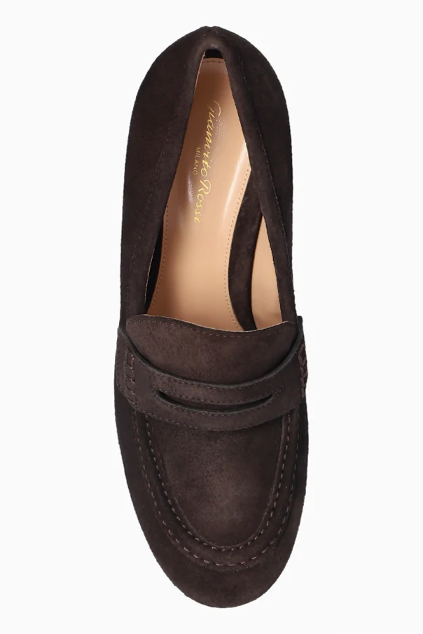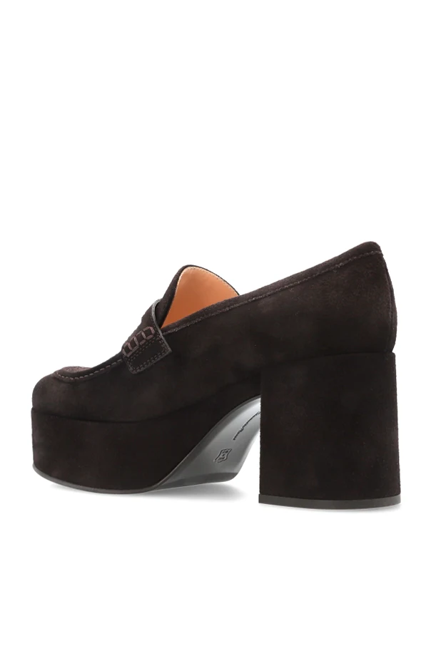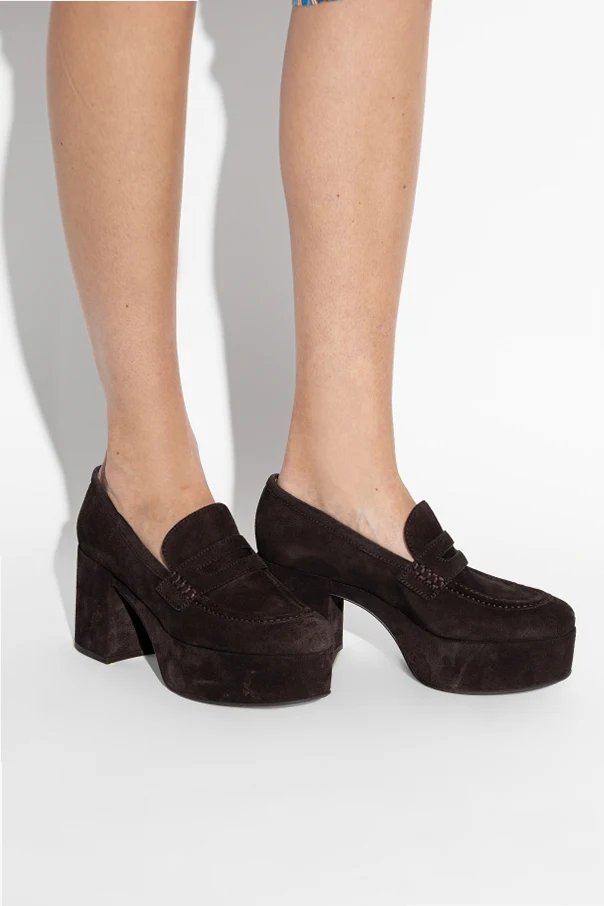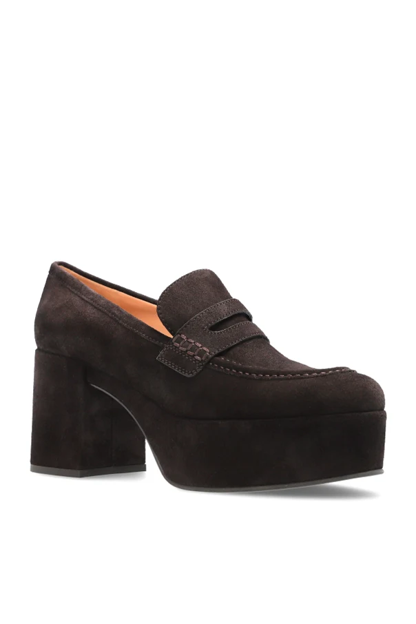 Immerse yourself in the art of refined footwear with these Platform Loafers by Gianvito Rossi . Masterfully crafted from sumptuous suede, the smooth, unembellished exterior radiates understated sophistication, evoking the spirit of timeless elegance with a distinct retro sensibility. A bold platform and wide block heel not only elevate your silhouette, but offer remarkable stability for confident strides.