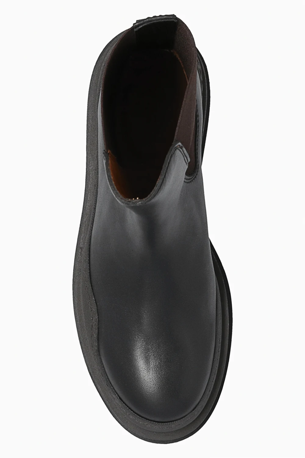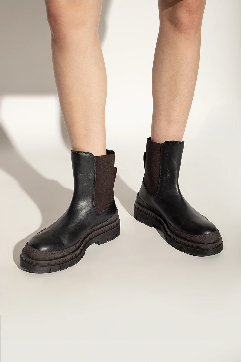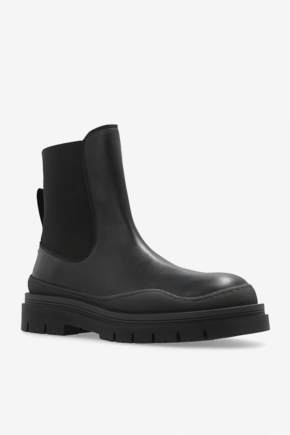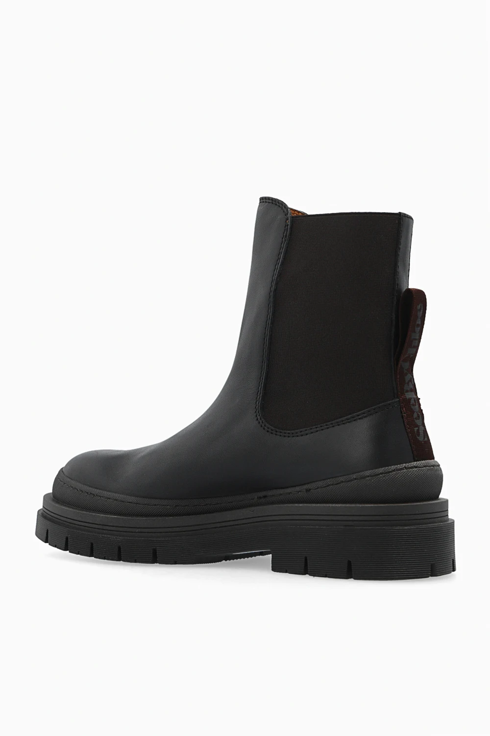 Black ‘Alli’ ankle boots from See By Chloé. Made of leather, this pair features dark brown elastic panels, fabric insert with a logo print and black rubber sole.