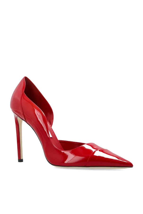 Step into refined luxury with the Jimmy Choo Brigitte pumps, exquisitely fashioned for those who appreciate timeless sophistication. These classic high-heeled stilettos feature a sleek, elongated silhouette, accentuated by a sharply pointed toe for a captivating, feminine statement. The lustrous patent leather gleams under the light, offering a glamorous appeal while maintaining a minimalist elegance.