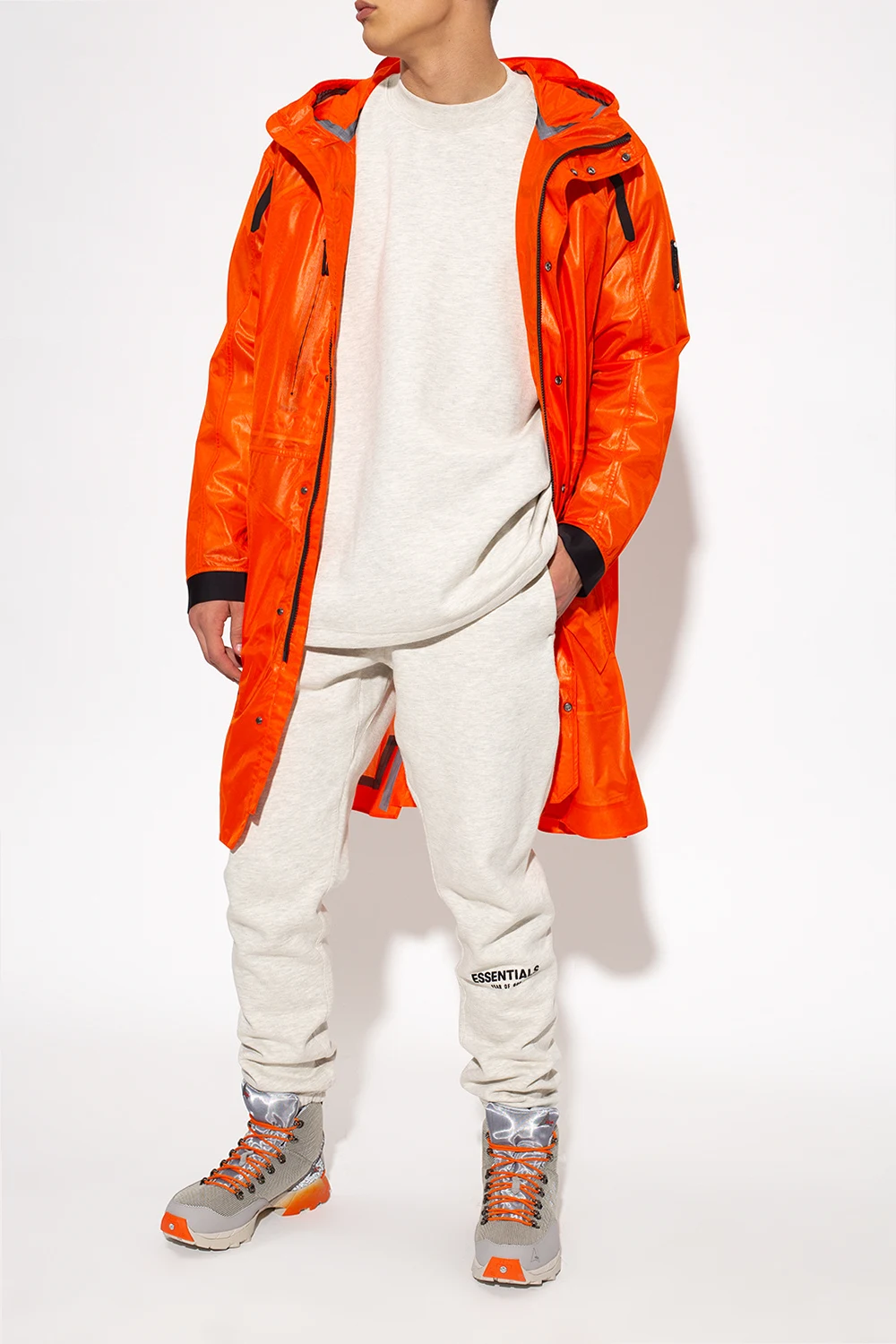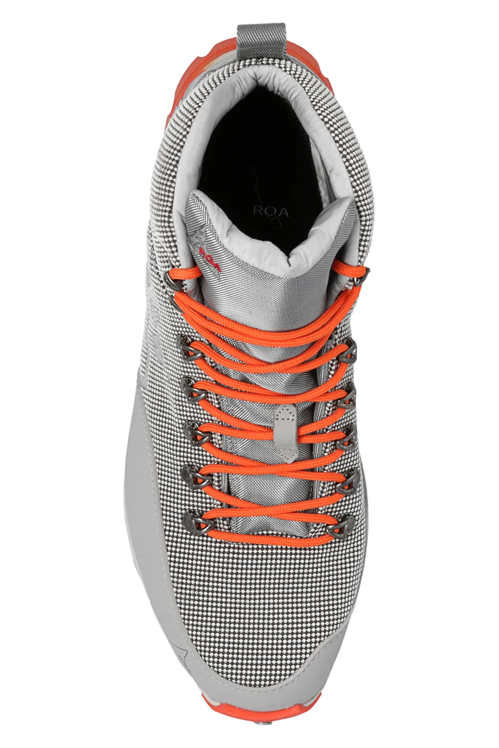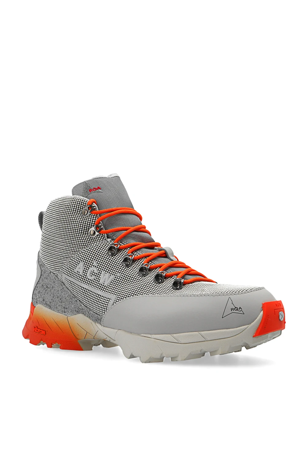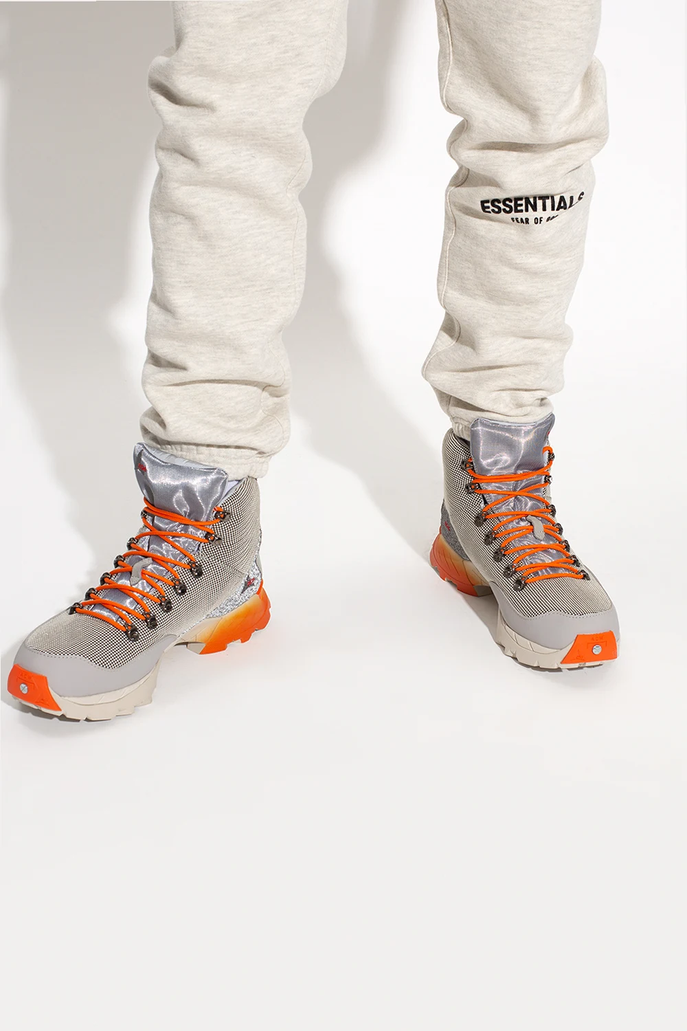 Grey, orange and black hiking boots from A-COLD-WALL* X ROA Andreas. This lace-up model features a synthetic panelled upper, a padded tongue with a leather storm weatherproof gusset, a suede-leather heel counter with a woven pull strap as well as the brand's logotype and hand-applied paint spray. It sits on a black Vibram sole.