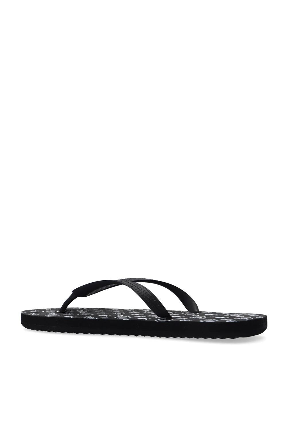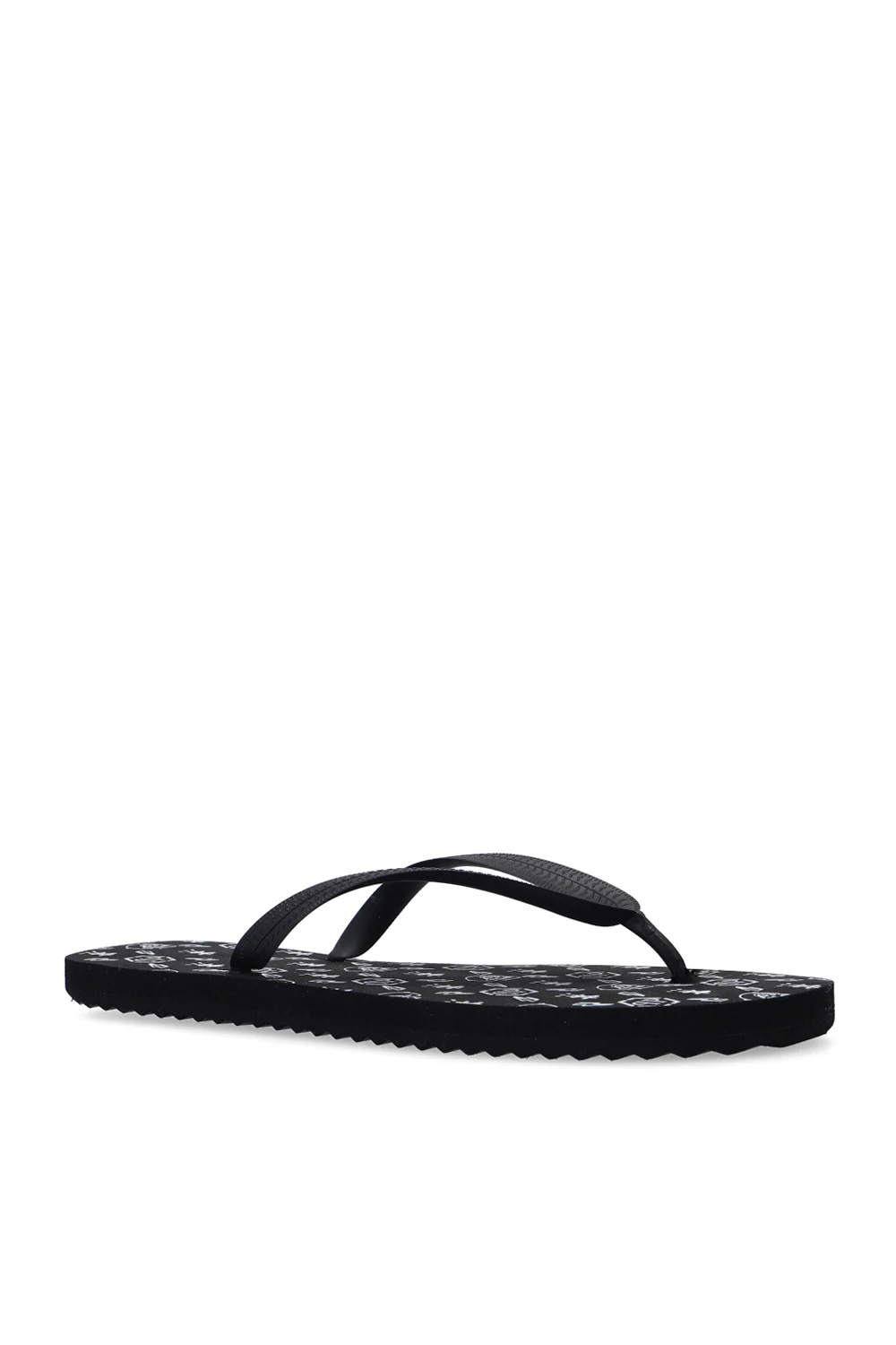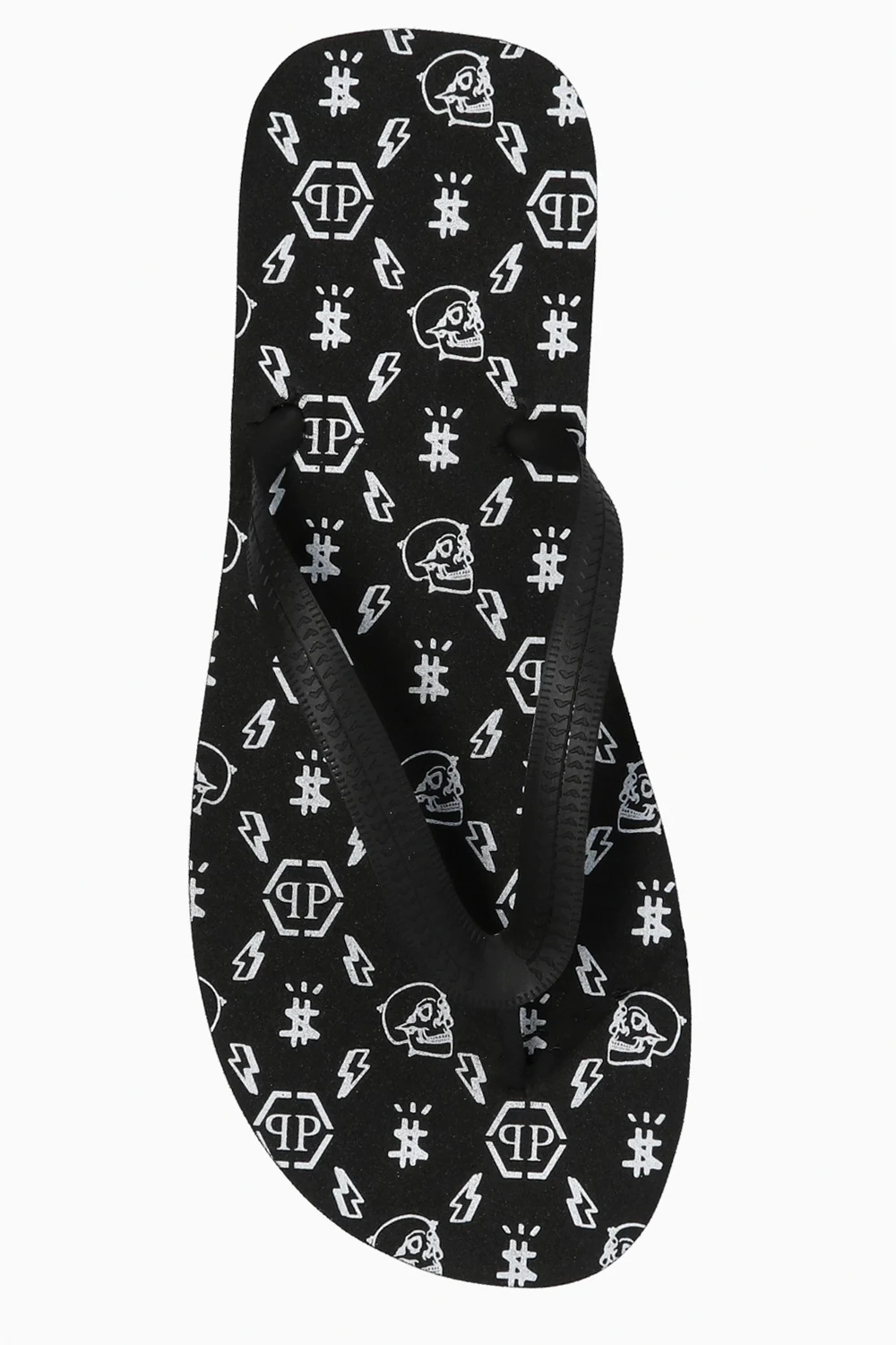 Black flip-flops from Philipp Plein. Set on a black rubber sole, this pair is decorated with a printed logo pattern in white.