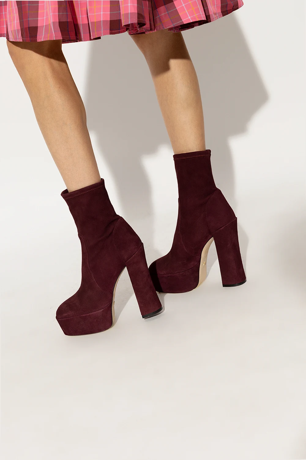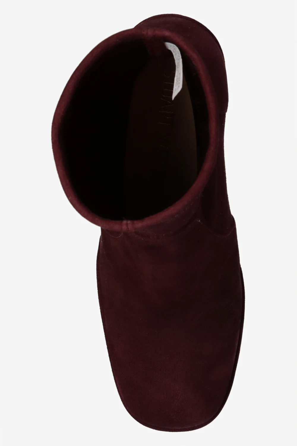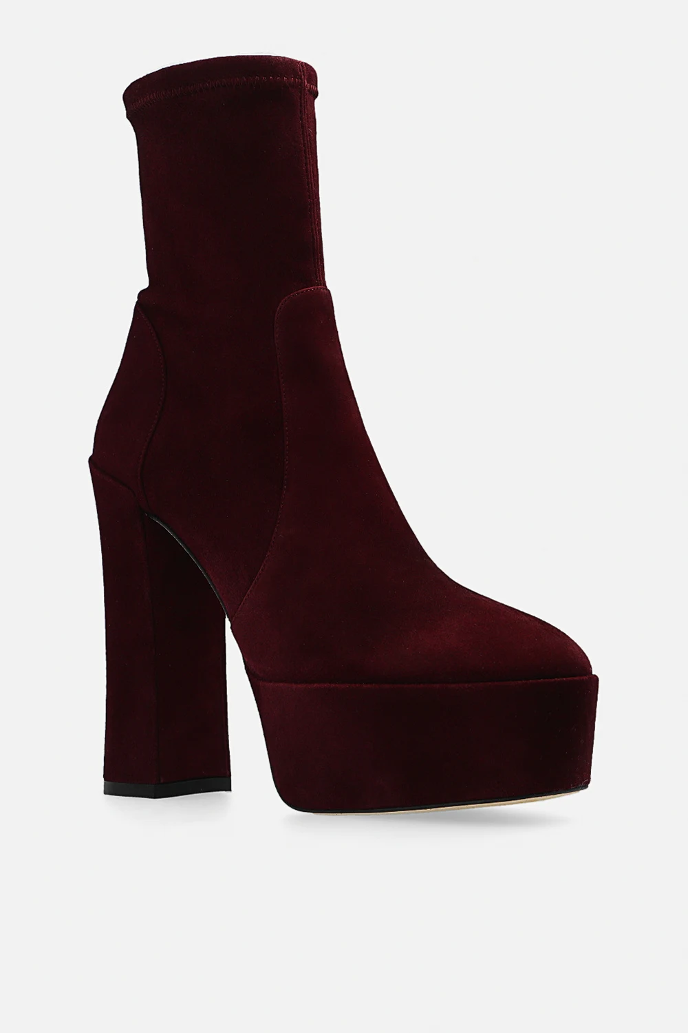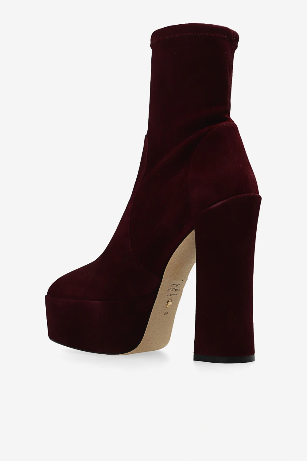 Maroon ‘Skyhigh’ platform ankle boots from Stuart Weitzman. Crafted from suede, this model features a slip-on silhouette and a beige leather sole.